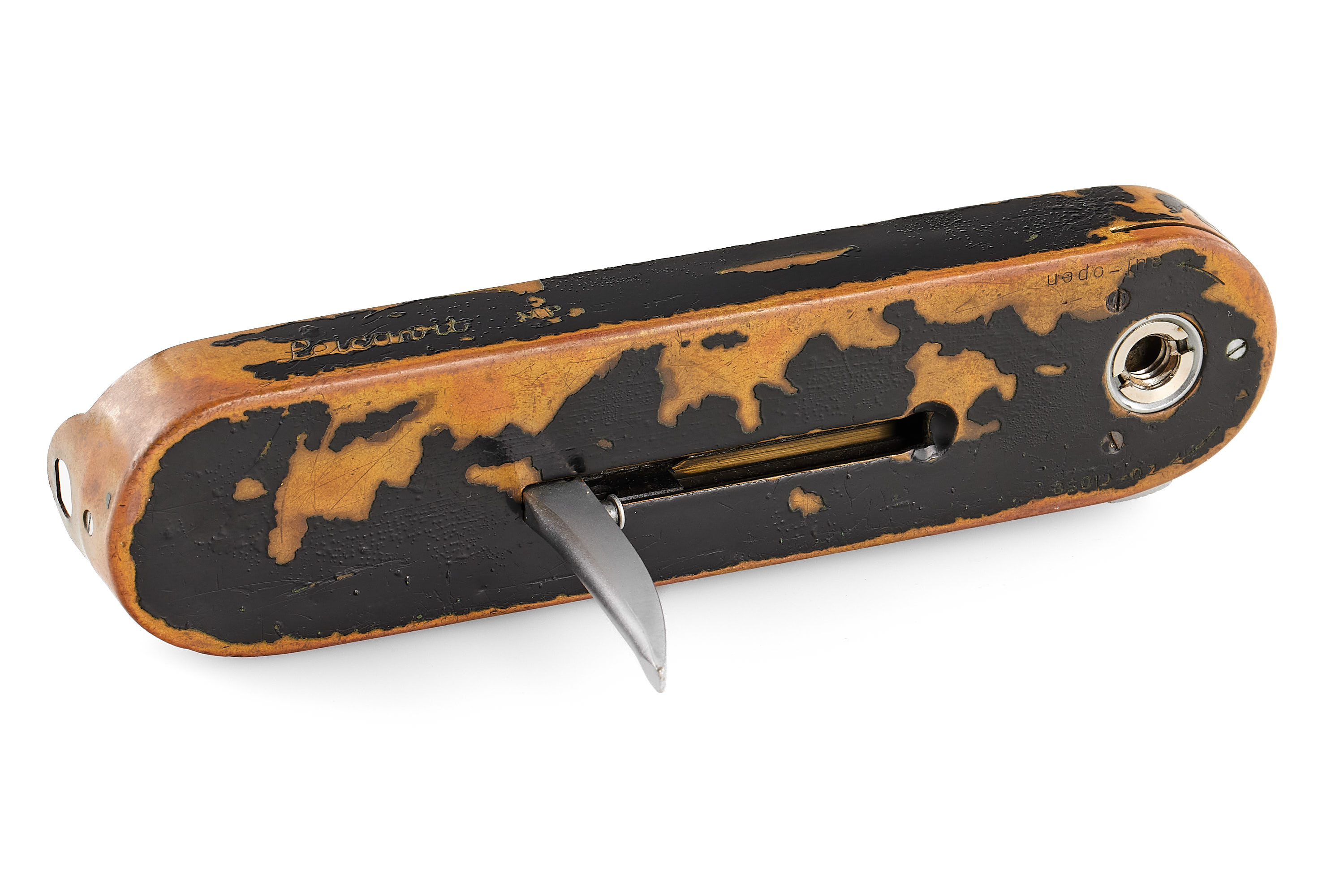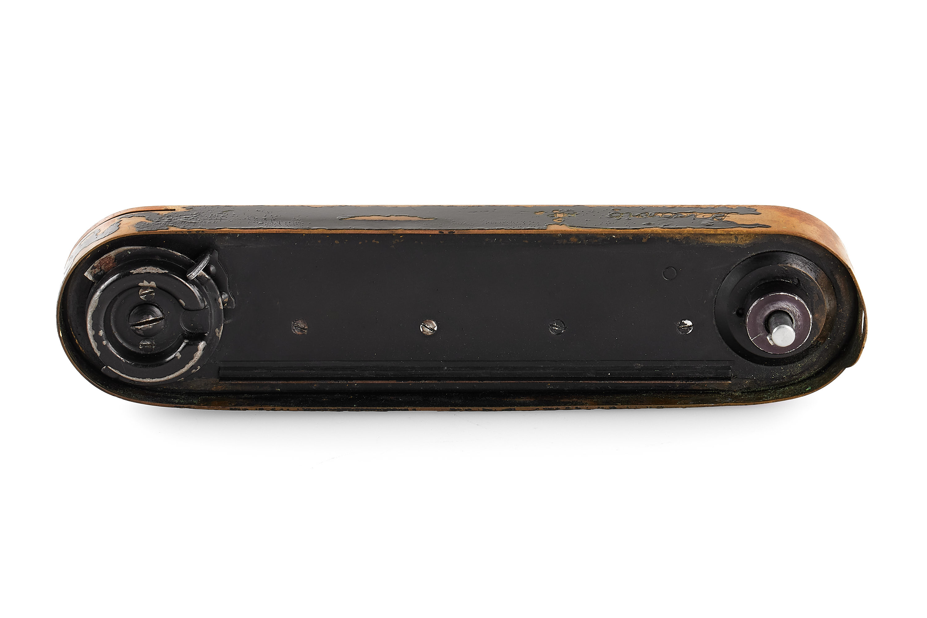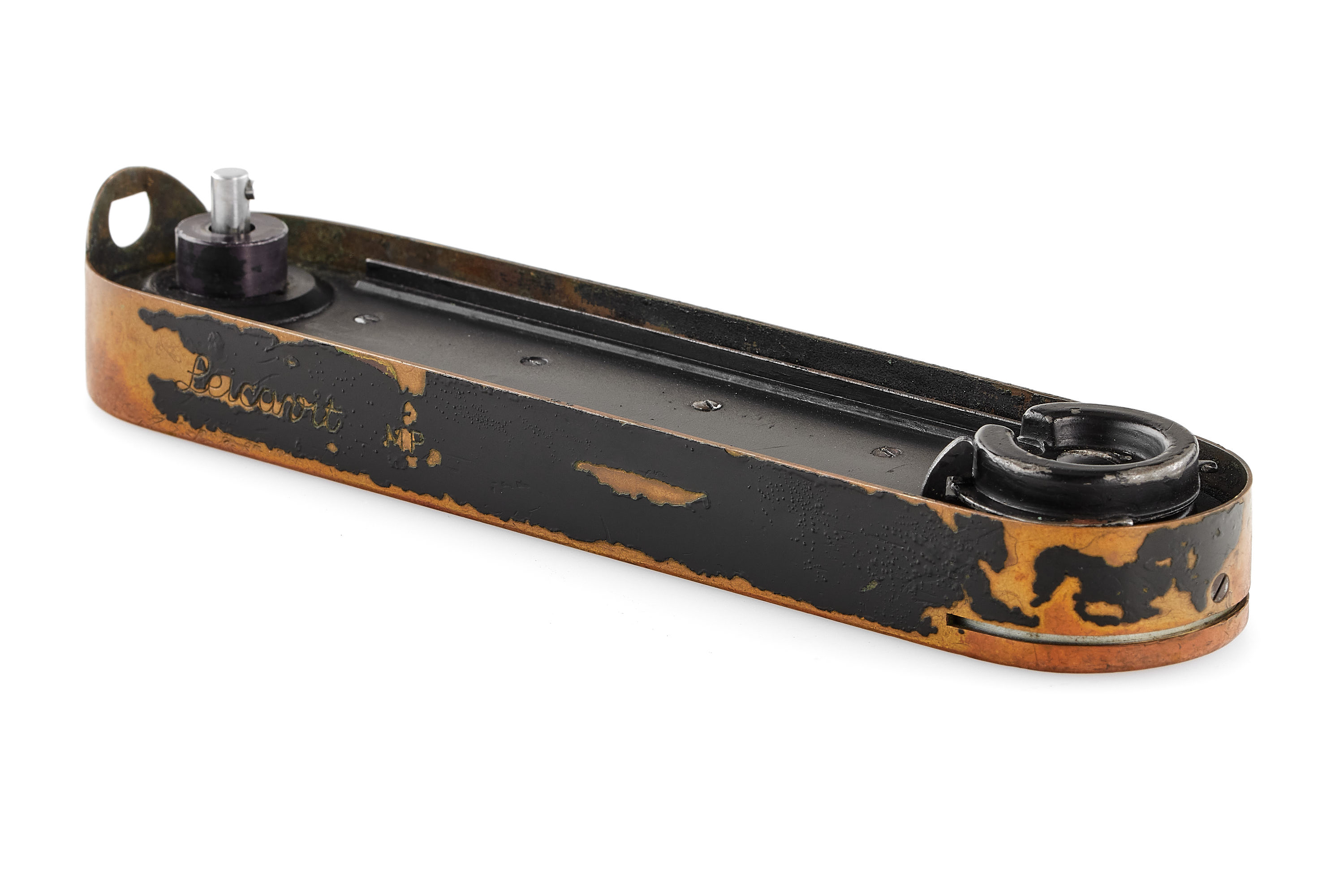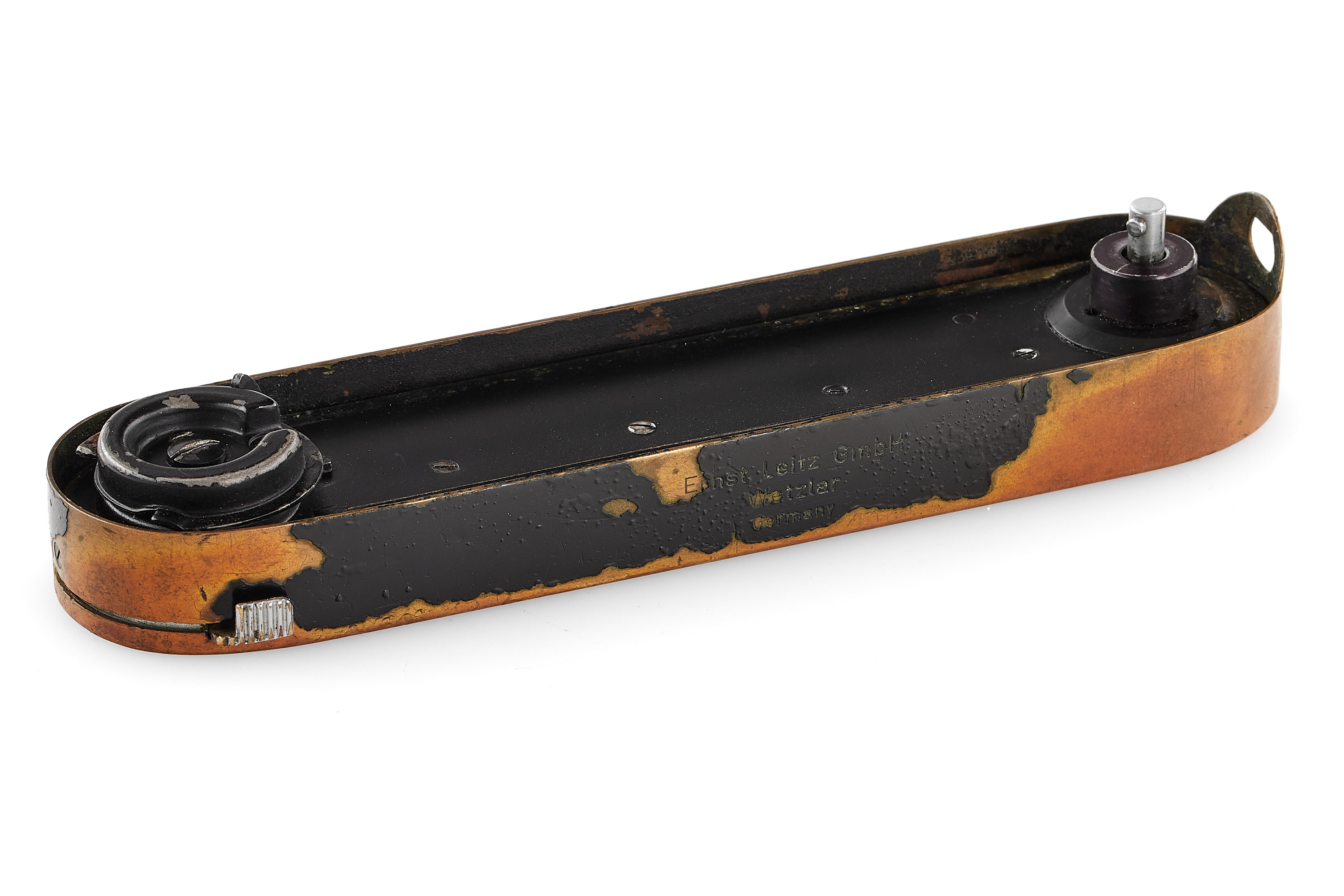 An original, sought-after black paint Leicavit MP. It is in used condition, with a nice patina and small bubbles appearing in the paint. Including a worn box. A matching accessory for the black paint Leica MP and M2.