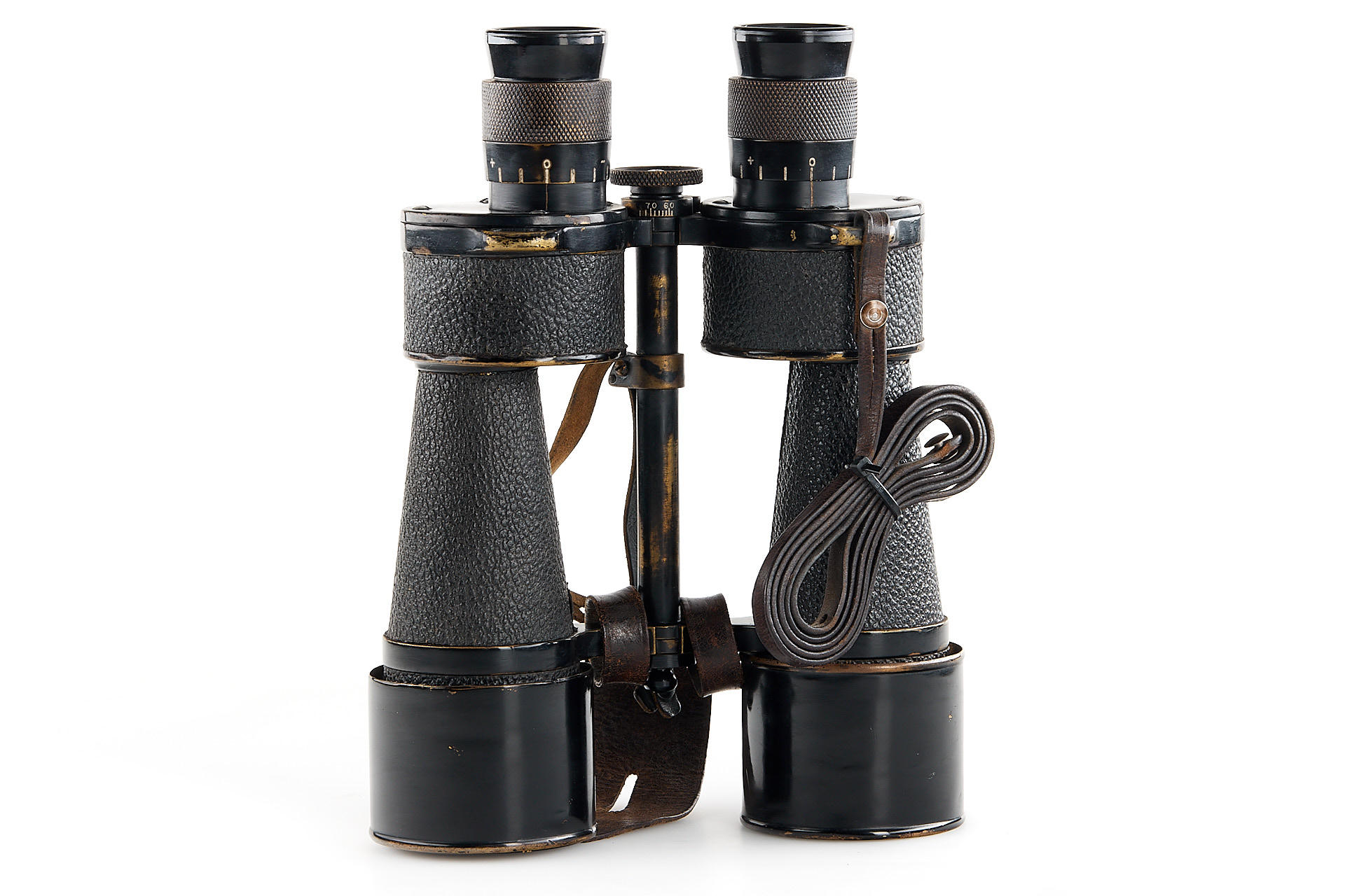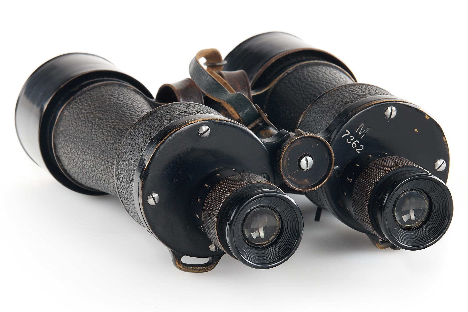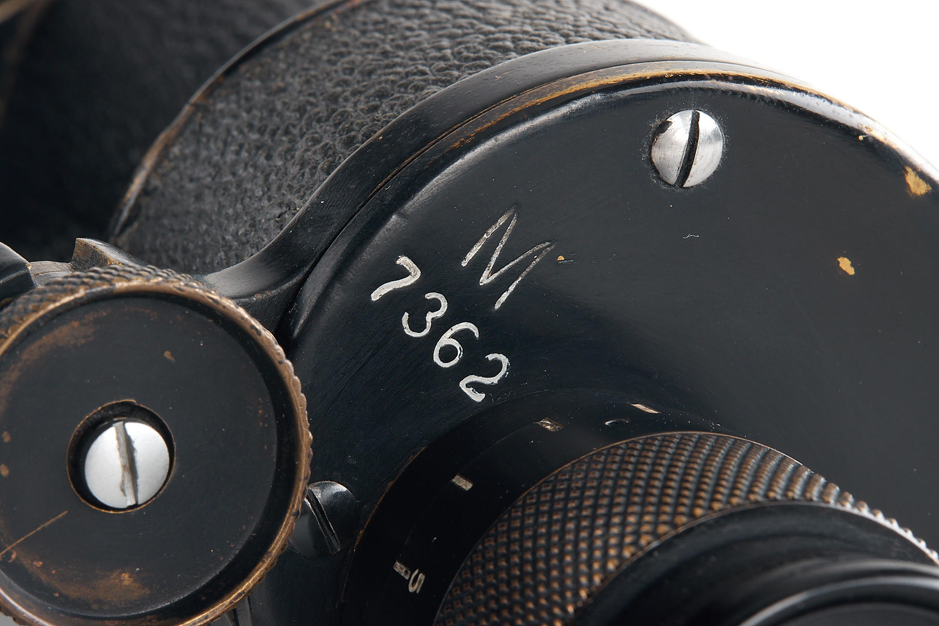 original Leitz binoculars made for German Marine, engraved with 'M7362', in good condition, optics hazy, with strap, case, and hoods for both lenses