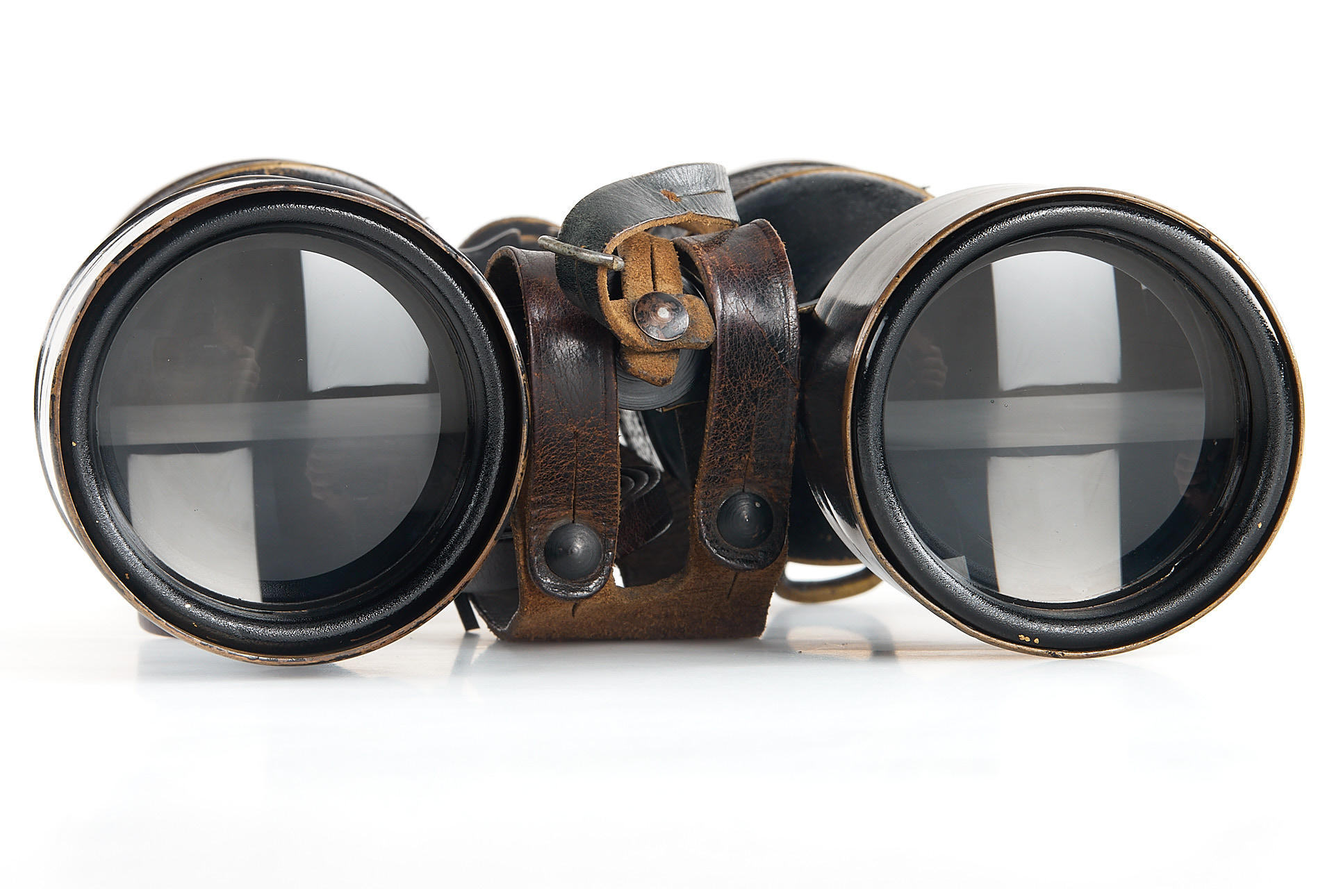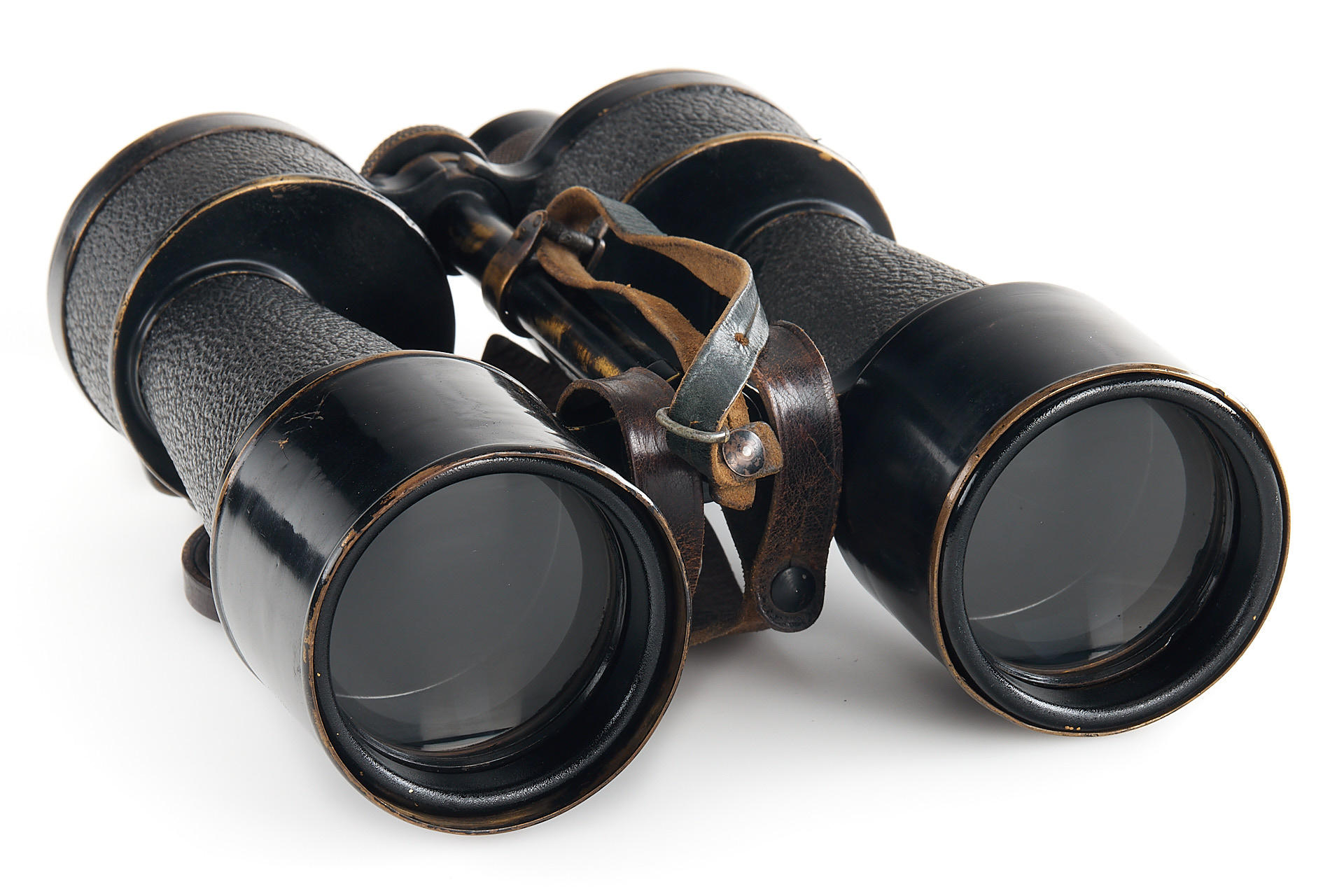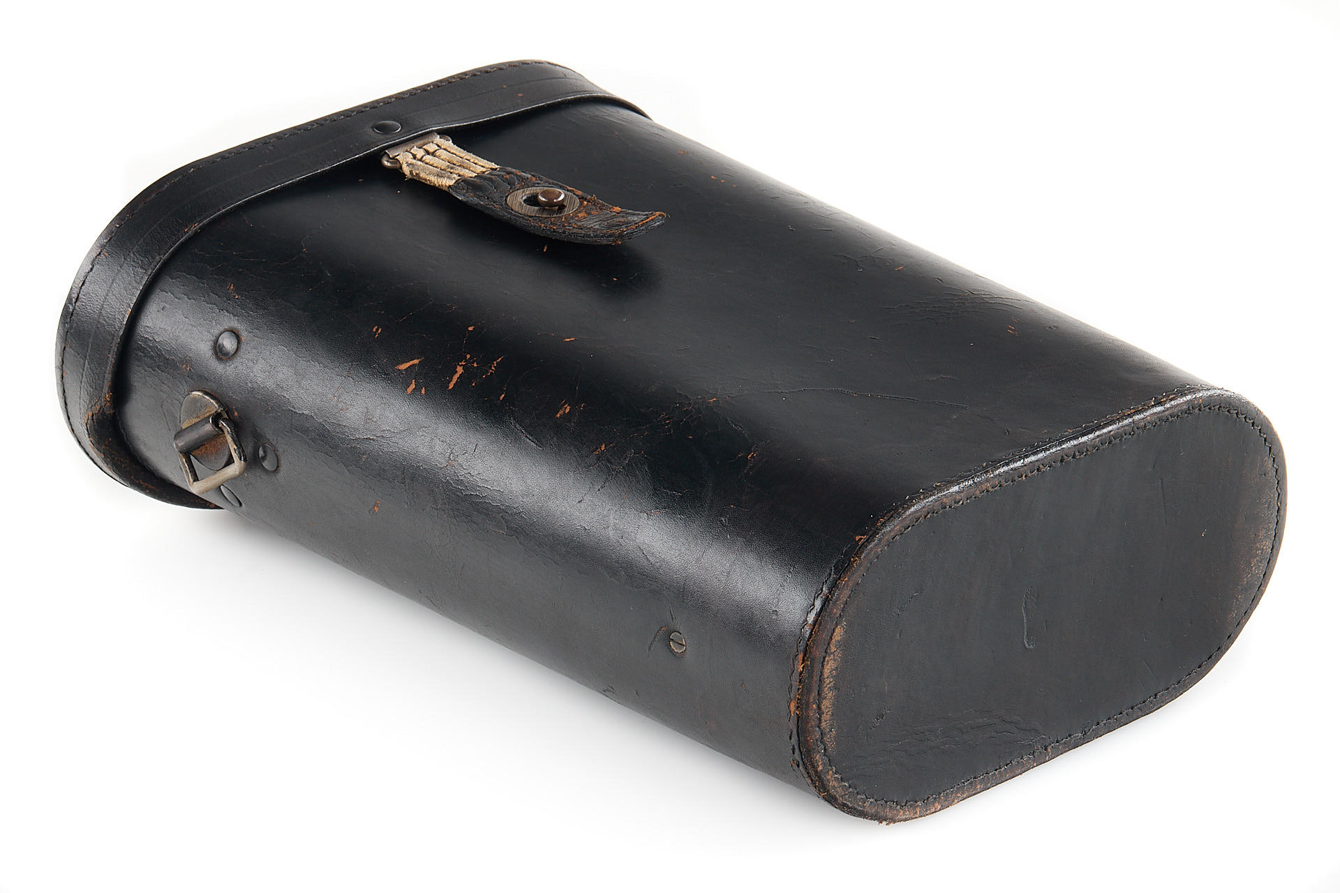 original Leitz binoculars made for German Marine, engraved with 'M7362', in good condition, optics hazy, with strap, case, and hoods for both lenses