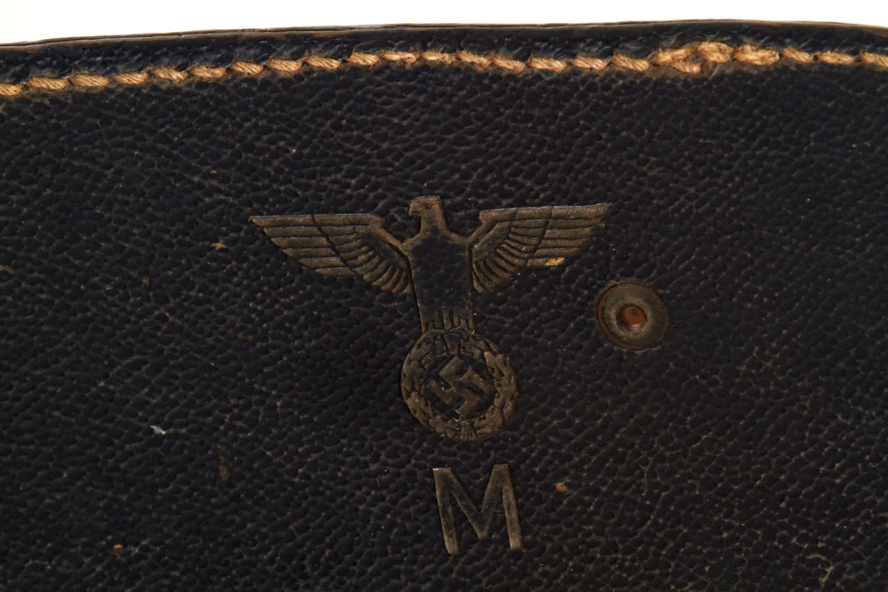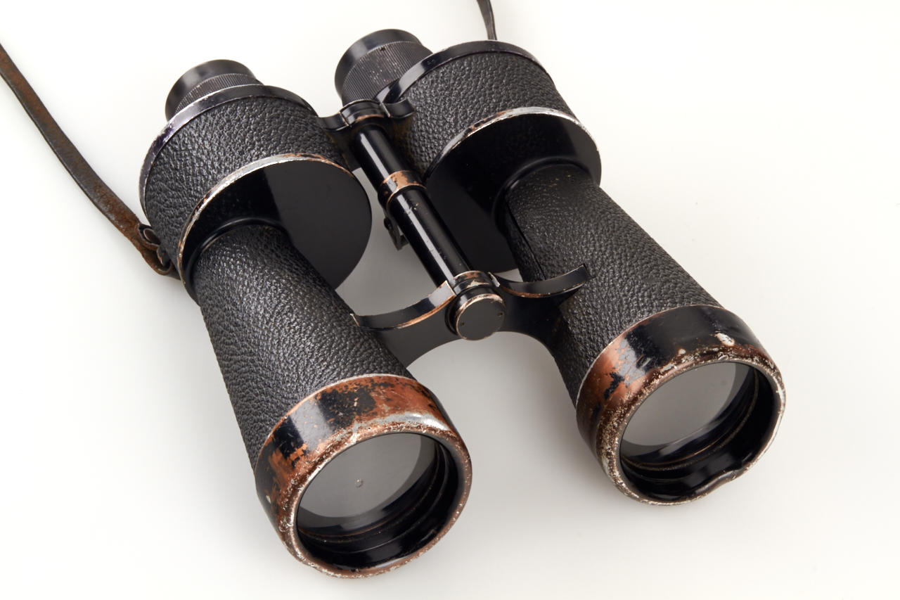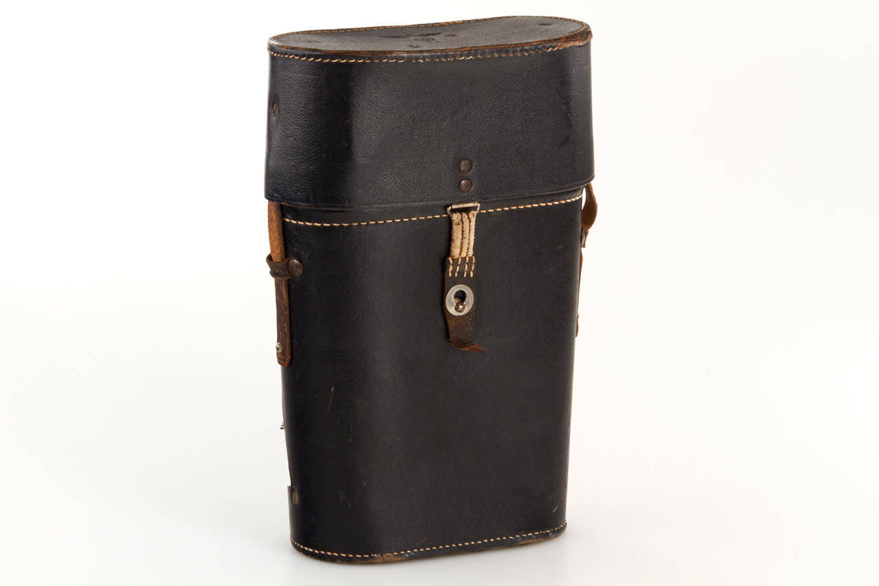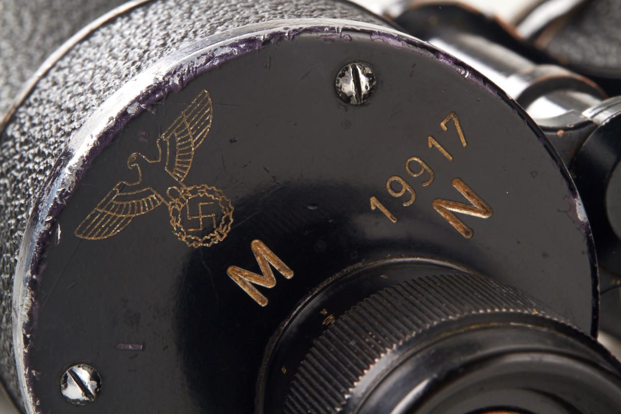 German Marine binoculars in original condition, engraved with Reichsadler on the left side, with strap and matching leather case stamped with Reichsadler and 'M'