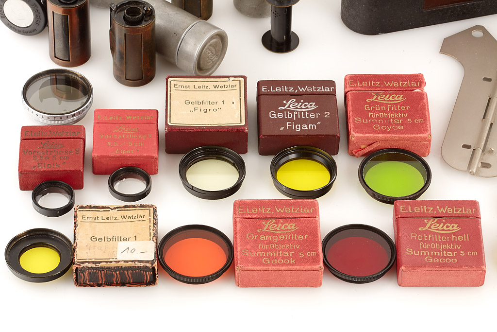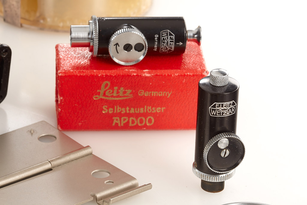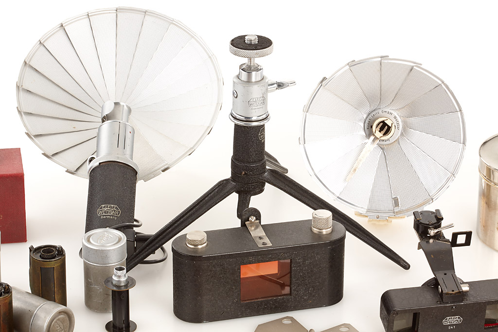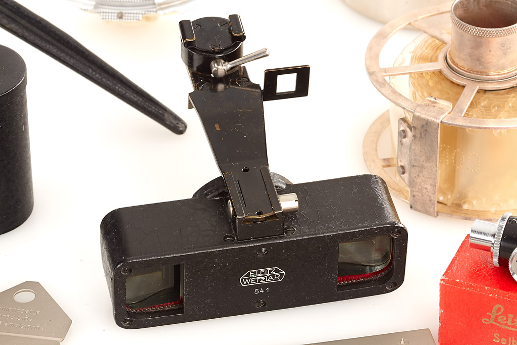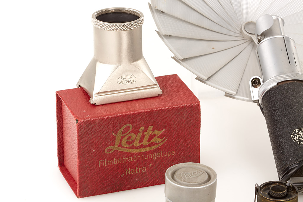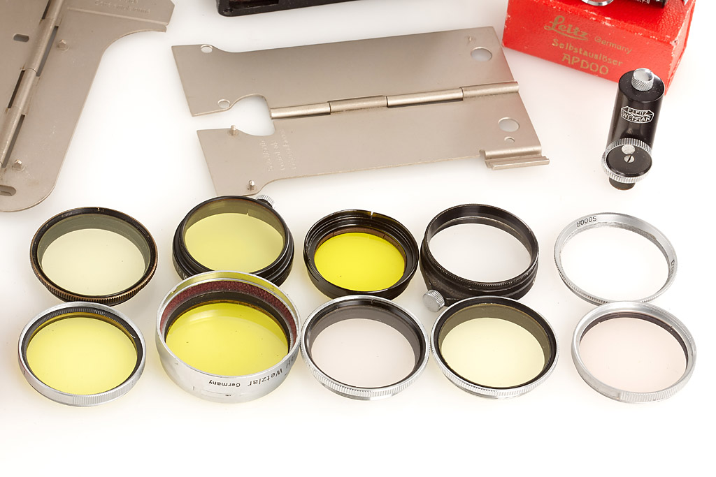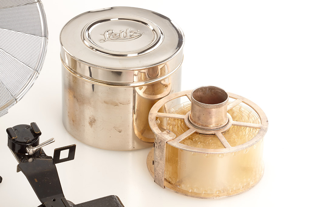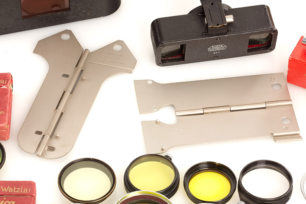 (1) Correx developing tank in nickel, complete with reel and apron, (2) two nickel ABLON film trimming templates, (3) NATRA negative viewer in red make's box, (4) ELDIA copying device, (5) 4 spools in containers, (6) early STEREOLY stereo device no.541 with fixed mask, (7) FOOMI ball and socket head with TOOUG table tripod, (8) CHICO flash, (9) CEYOO flash, (10) early APDOO with black dial, (11) late APDOO with chrome dial and red maker's box, (12) 18 Leitz filters (most in keeper or maker's box) (12)