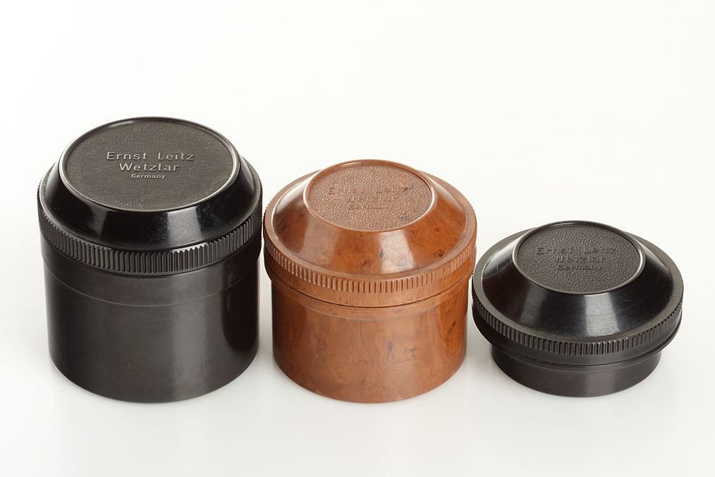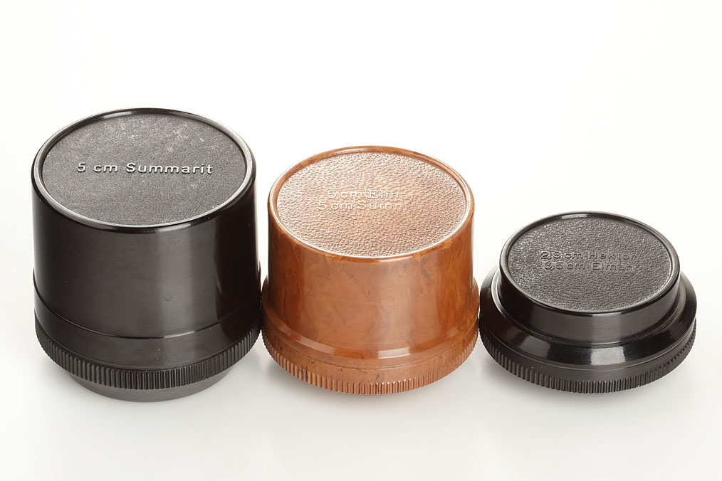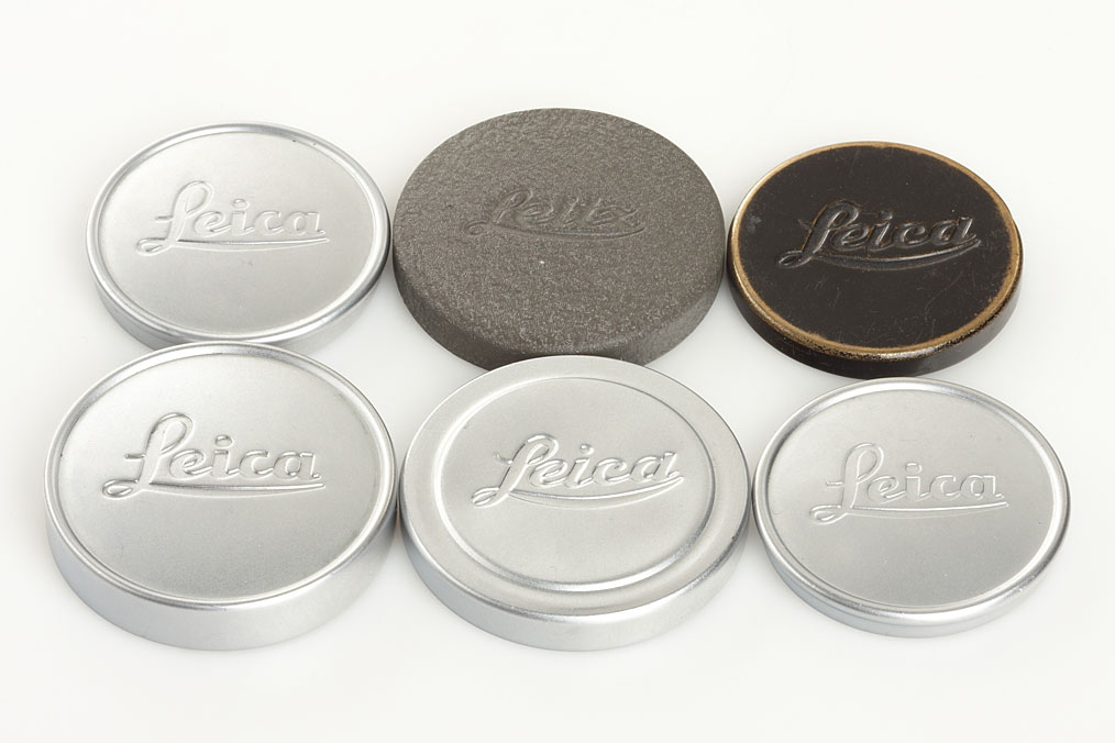 rare black bakelite keeper for 5cm Summarit, rare brown bakelite keeper for 5cm Elmar and 5cm Summar, black bakelite keeper for 2.8cm Hektor and 3.5cm Elmar, black painted A36 lens cap, two late chrome A36 lens cap, chrome A42 lens cap, early chrome Summicron A39 lens cap, grey projector lens cap (9)