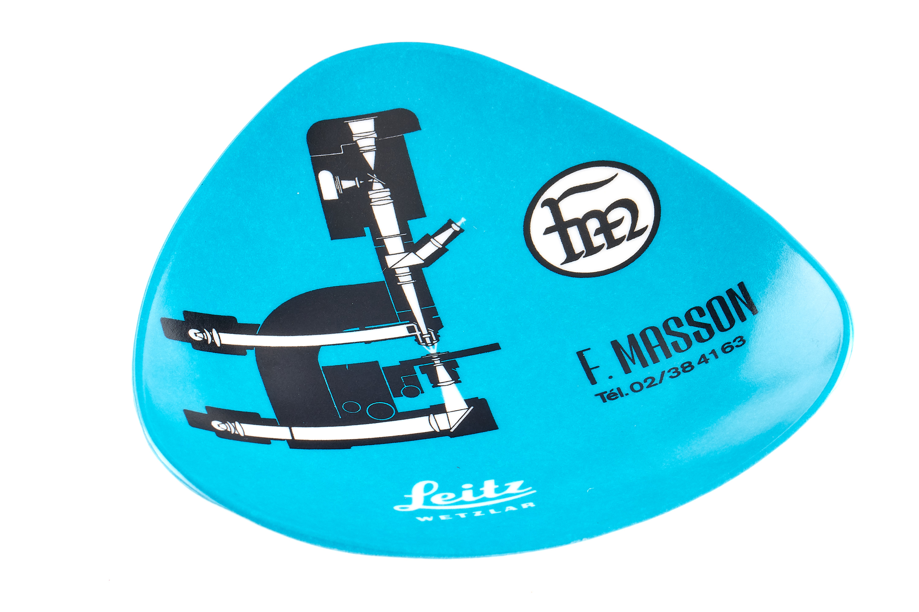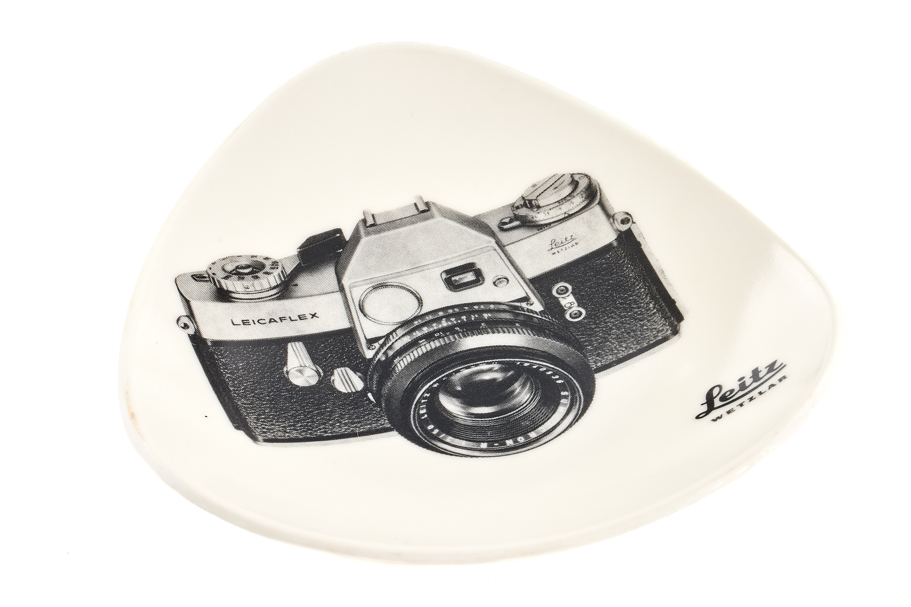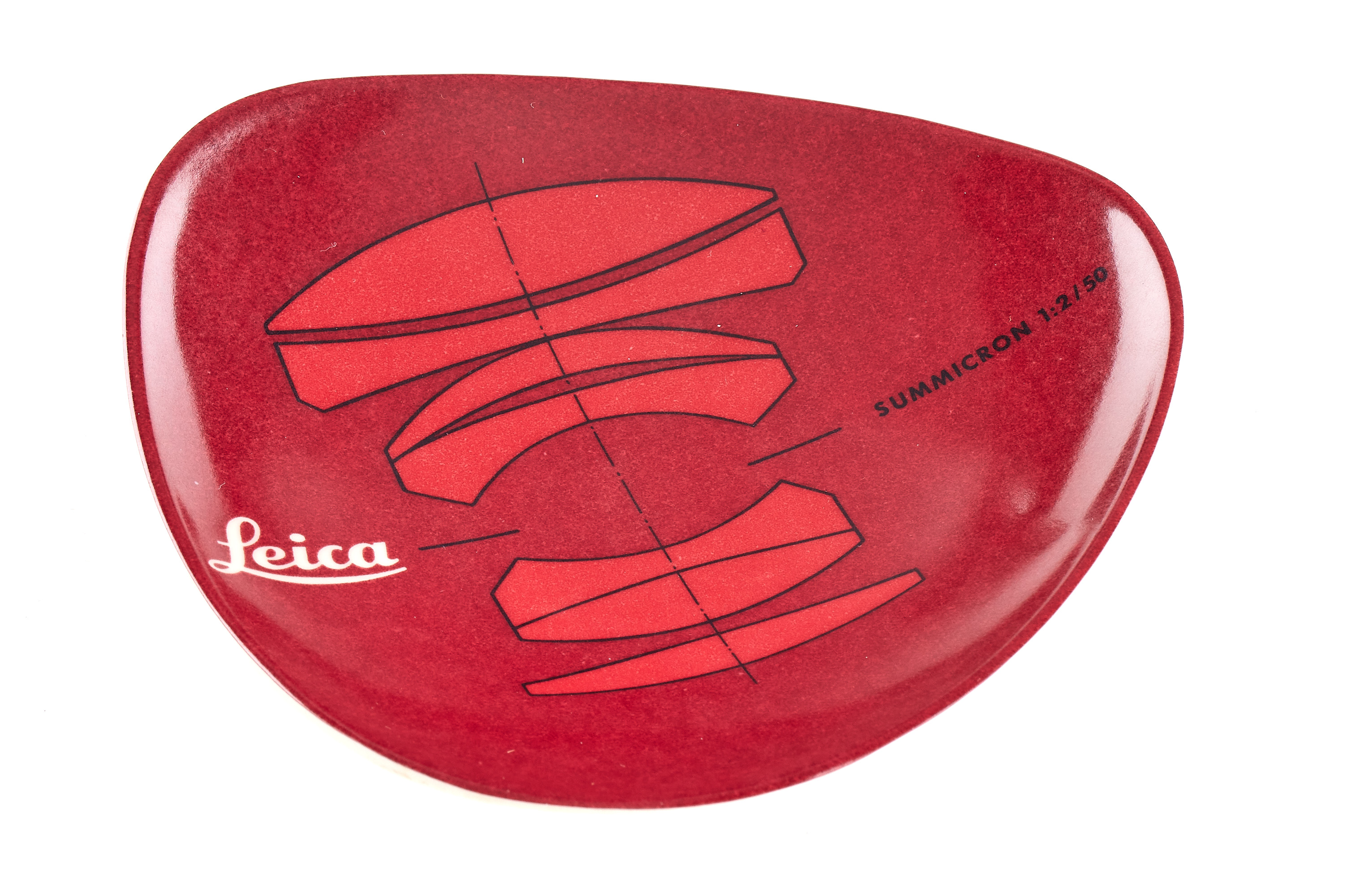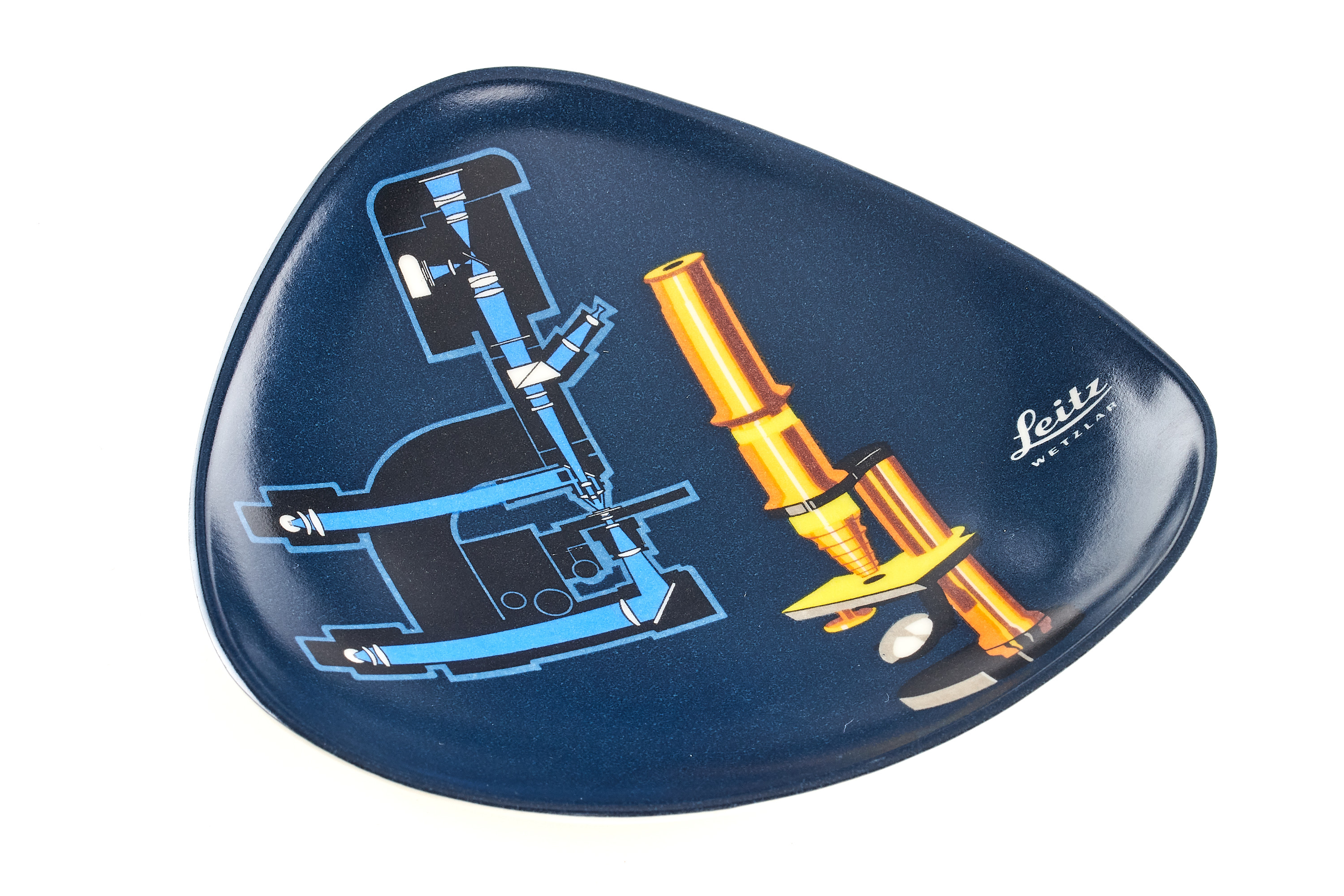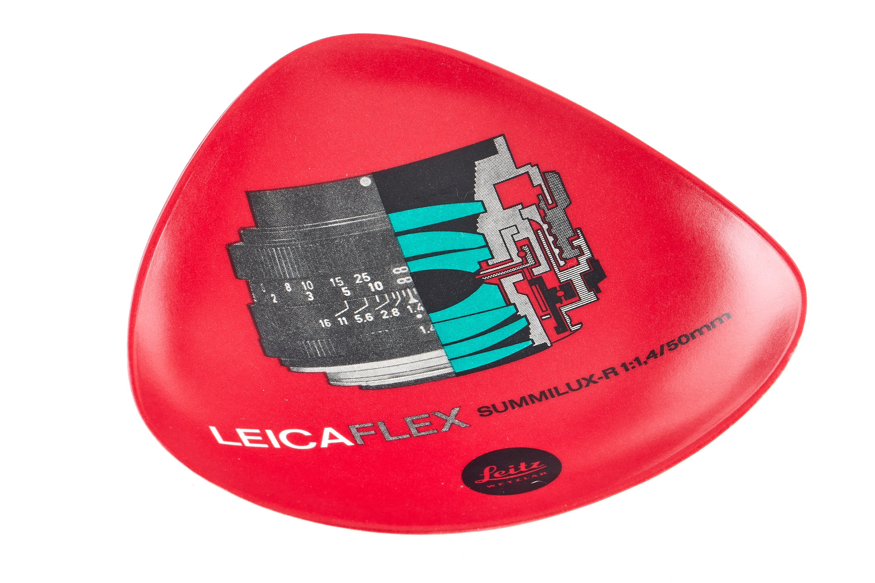 Beautiful set of six advertising coin trays for Leitz, with Summilux-R 1.4/50mm lens, Orthoplan microscope, Leicaflex, etc, all in mint condition, printed resin 13cm in diameter.