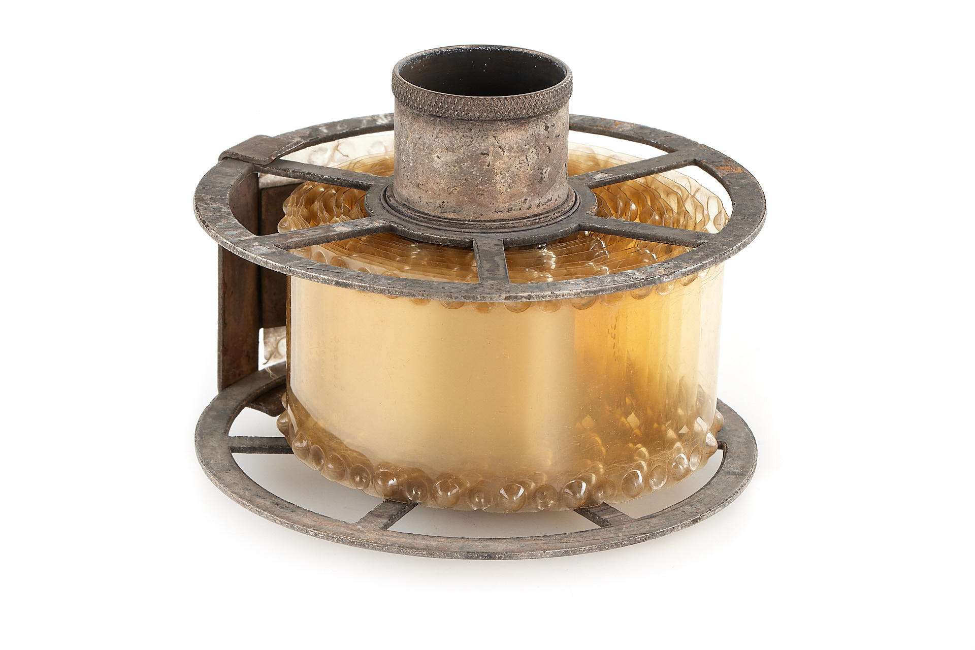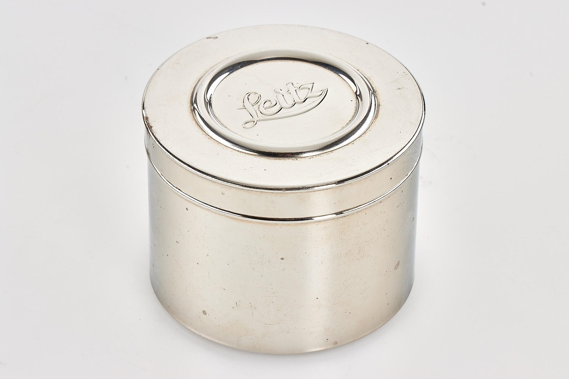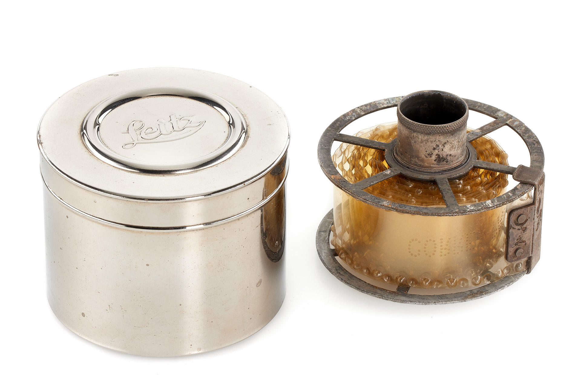 rare and early developing tank for 35mm film, nickel finish, in good condition, complete with reel