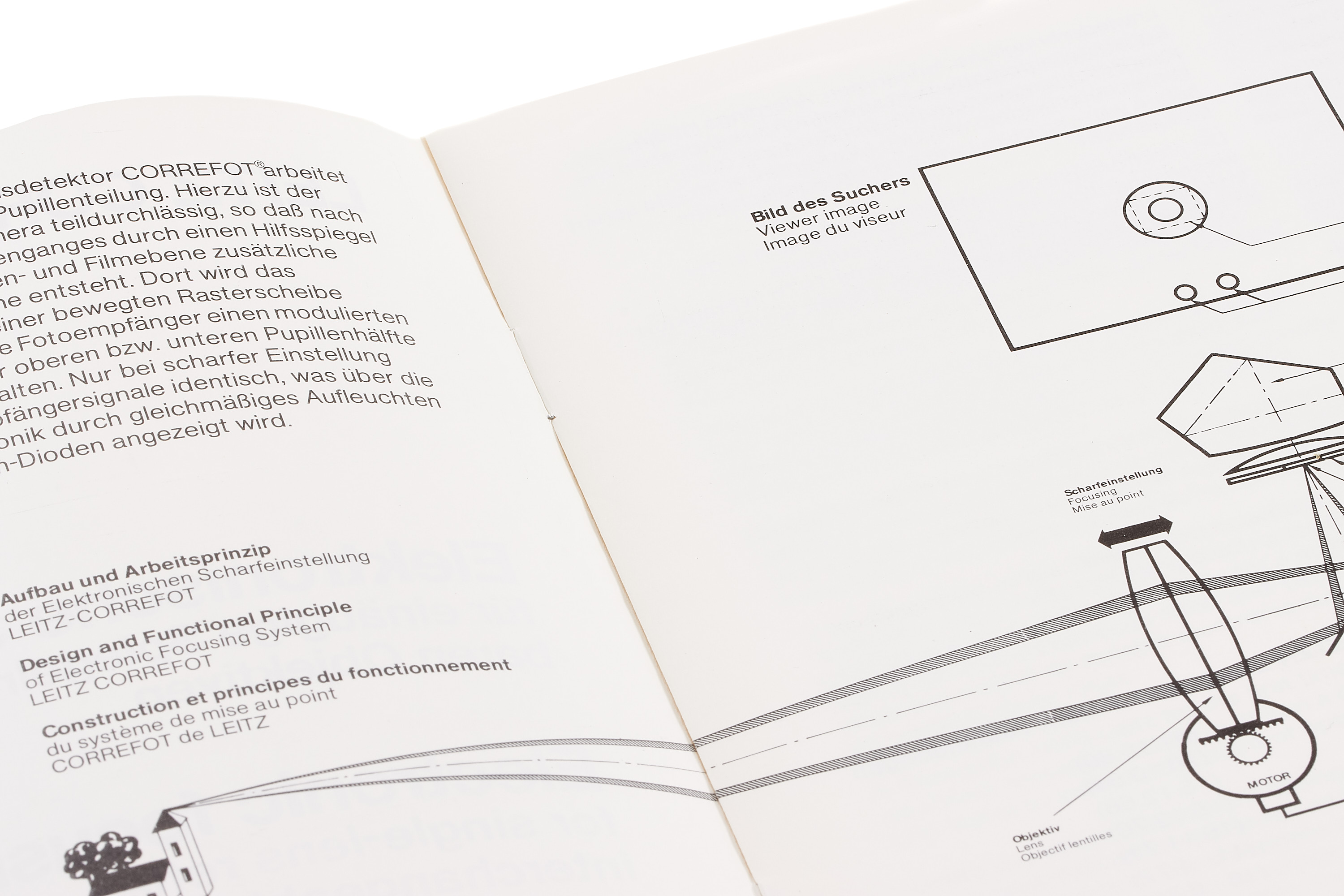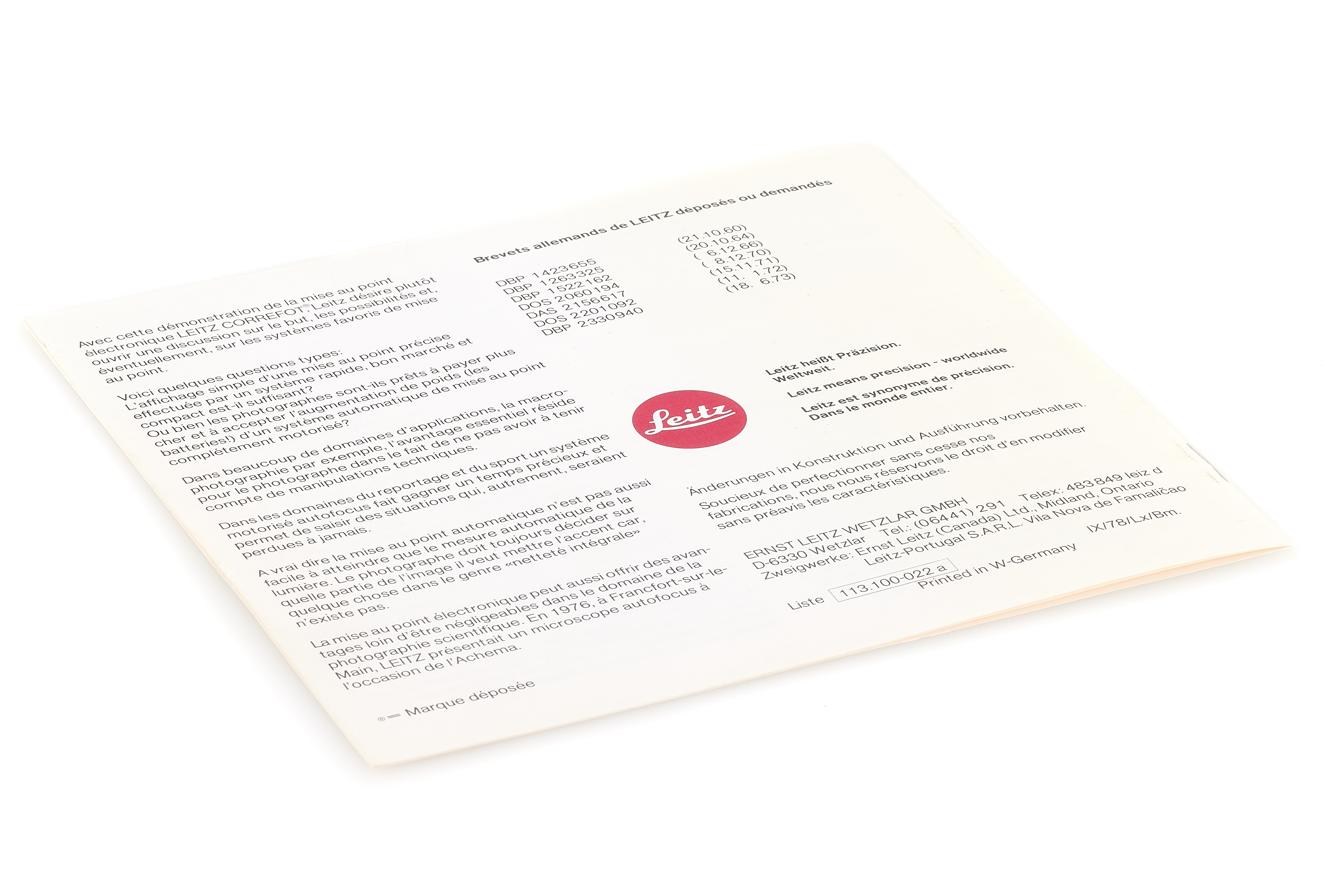 Very rare brochure of the Leitz Correfot, 3 languages (German/English/French) version, in mint condition, Leitz was the first brand in the world to develop an auto-focus prototype in 1976, adapted to the Leicaflex SL2 and presented to the Photokina. A secondary mirror deviated a part of the rays to a mobile pattern (mechanic system!) for an electronic evaluation of the MAP. Correfot means "maximal 'correlation' between two elementary light rays passing by the extreme edges of the ward of the lens and stemming of the same point of the subject, the Correfot never went into production.