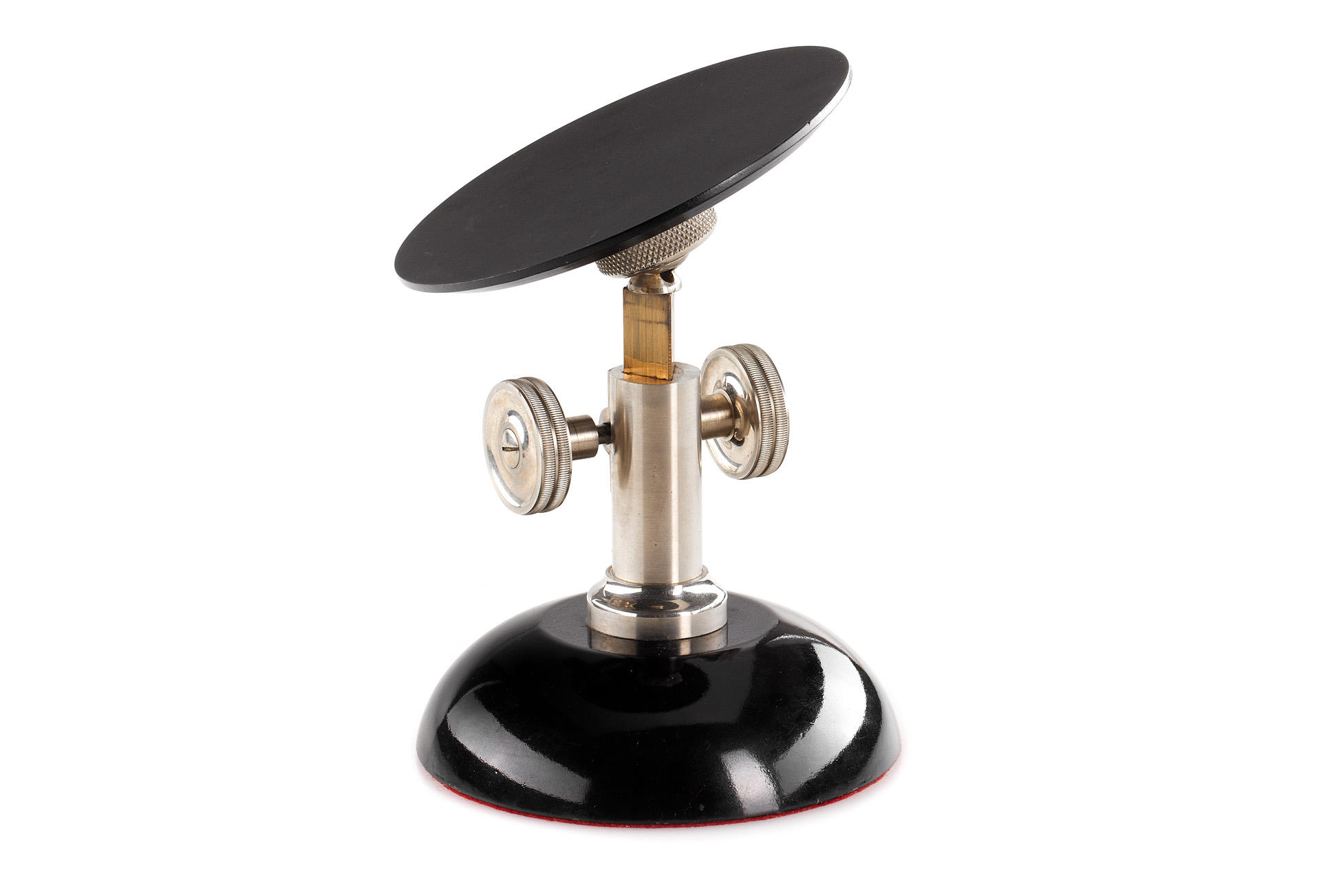 extremely rare copying stand for photography of small objects, adjustable in height by rack and pinion, can be tilted and rotated, total height (min.) 10.5cm, table diameter 10cm, in beautiful condition