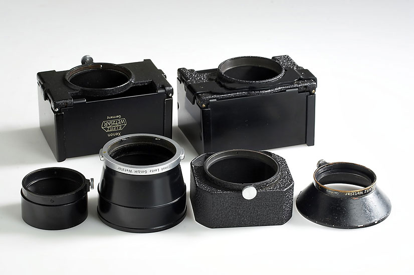 black SOOHN for Hektor 2.8cm with chrome set screw, black FLQOO for Elmar 3.5cm, XOONS for Summarit 5cm, black XIOOM for Xenon 5cm, SOOFM for Summitar + Summicron 5cm, IUFOO - early type for Elmar 9cm + Hektor 13.5cm, like new in maker's box (6)