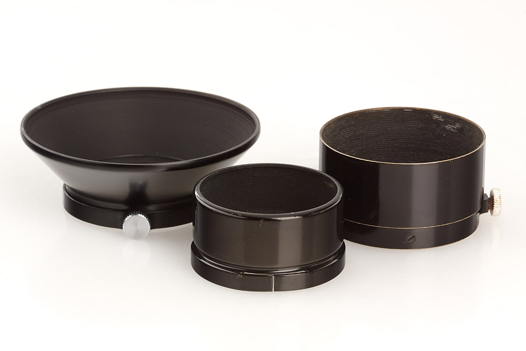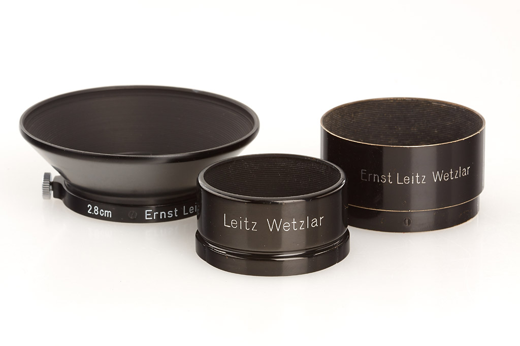 (1) very rare, mint SOOHN hood with 'GmbH' engraving for post-war Hektor 2.8cm in mint condition, (2) early black FISON hood without screw engraved 'Leitz Wetzlar' in almost mint condition, (3) black FOOKH hood engraved 'Ernst Leitz Wetzlar', including (4) FLOTH pump bob with angular opening mint in red maker's box (3)