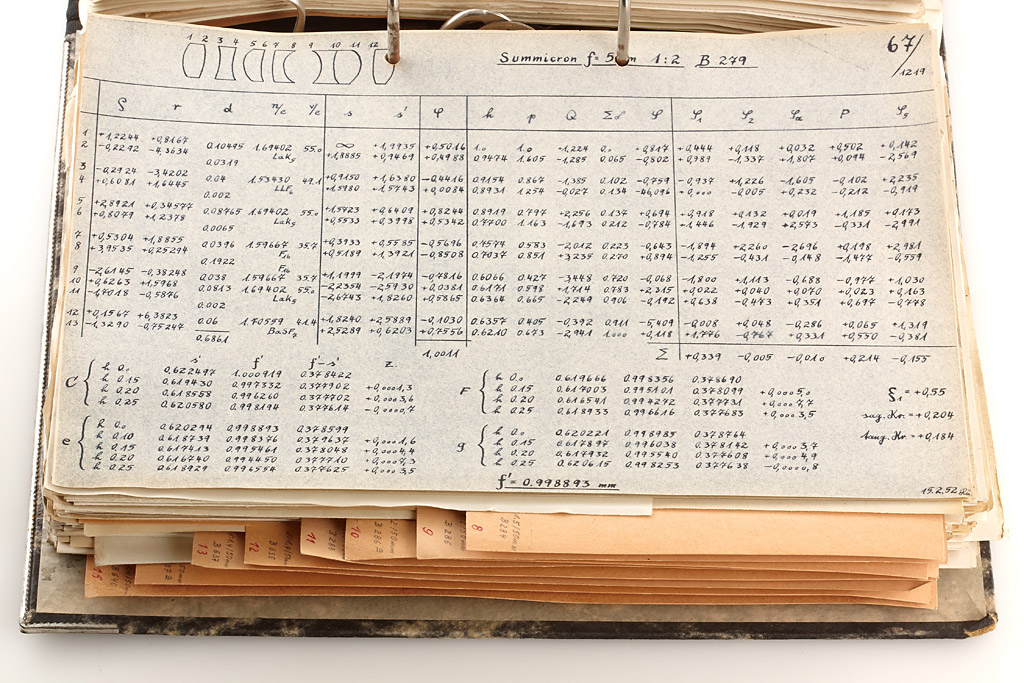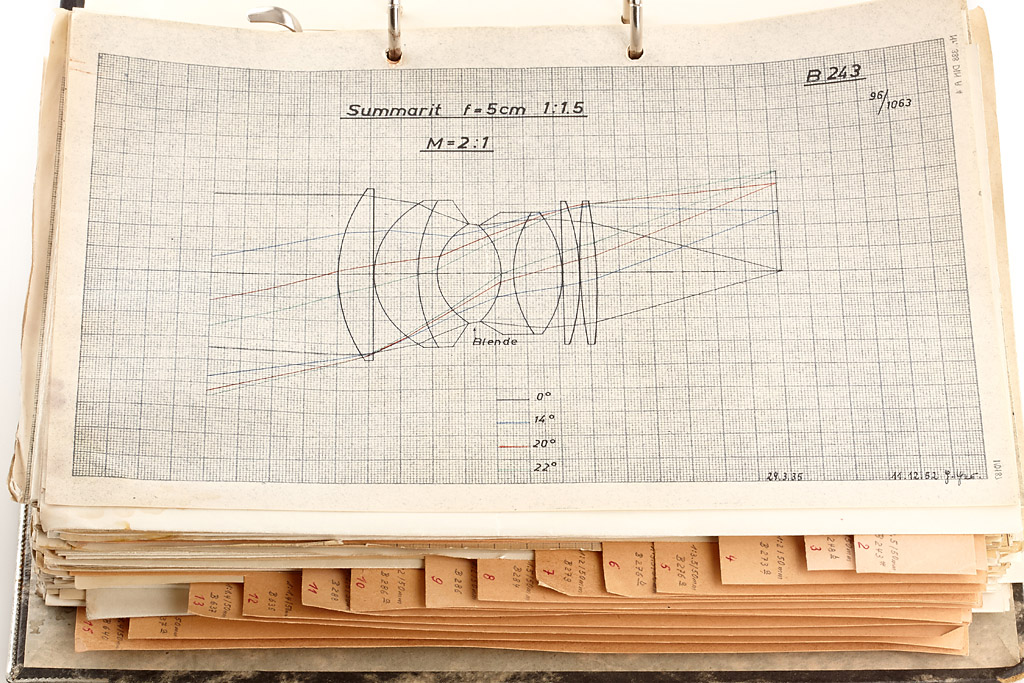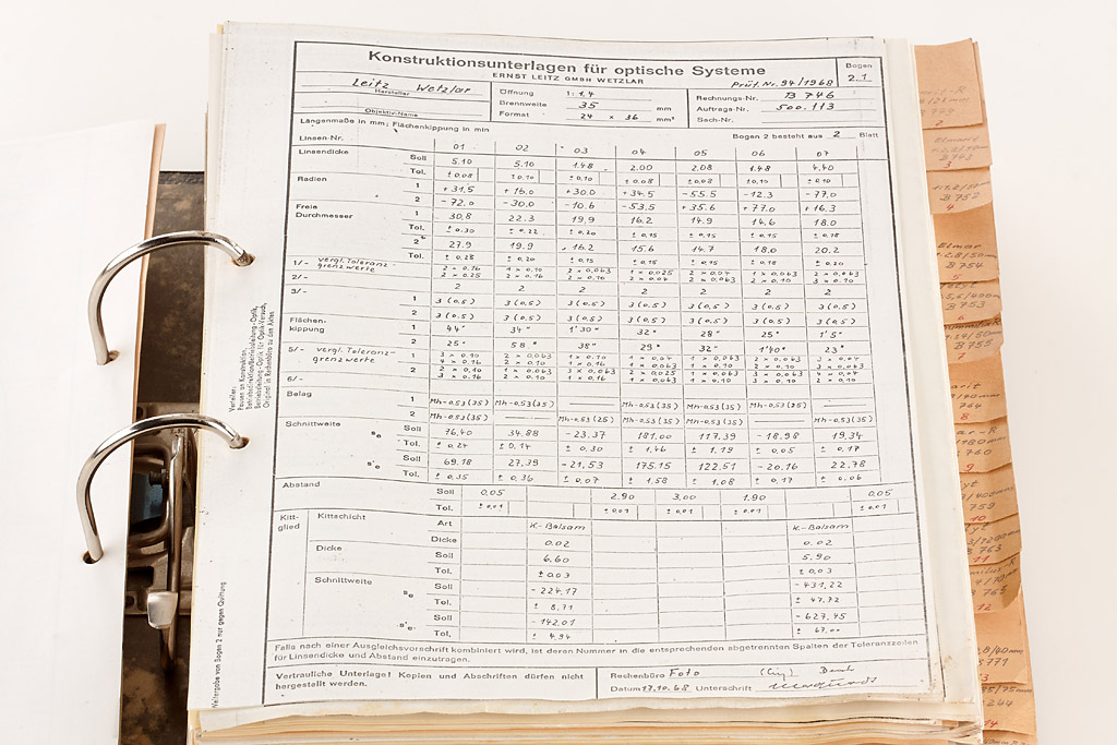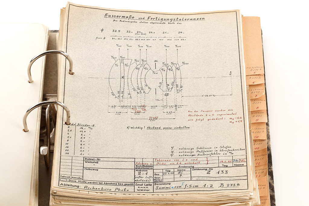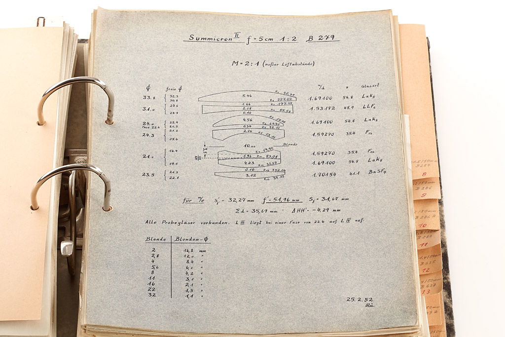 two large Leitz folders containing 45 different post-war lens designs (Summarit 1.4/5cm, Summilux 1.4/50mm, Summitar 2/5cm, Noctilux 1.2/50mm, Elmarit 2.8/40mm, 0.85/75mm, Elmarit-R 2.8/24mm in Rokkor design, etc.), some of them went never into production (for example: Telyt 6.3/1200mm, Summilux-R 1.4/70mm, 1.7/28mm), all lens drawings also have typical 'Bxxx' numbers as Leica prototype lenses - a very interesting piece of history