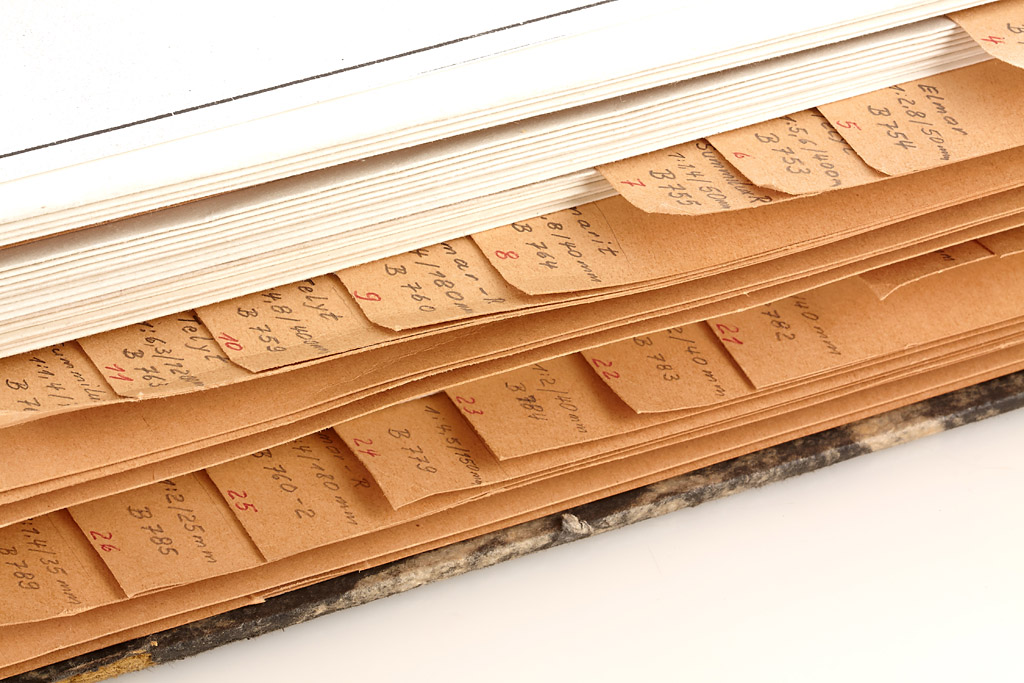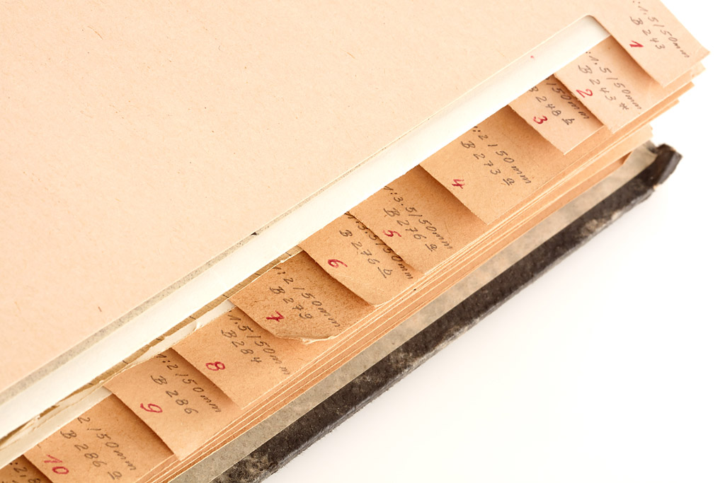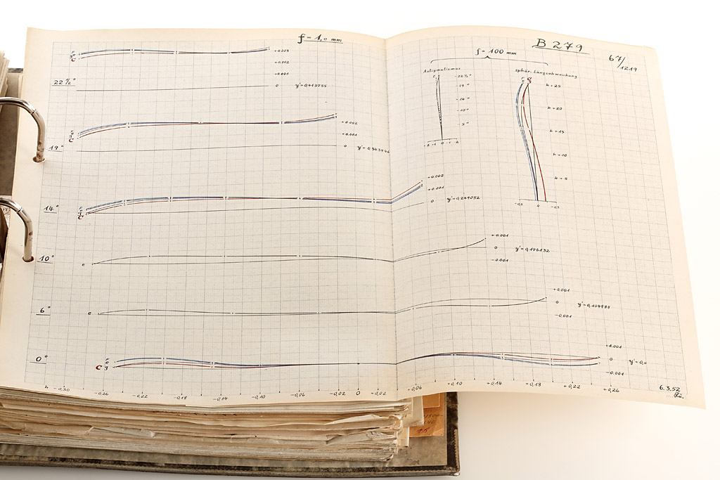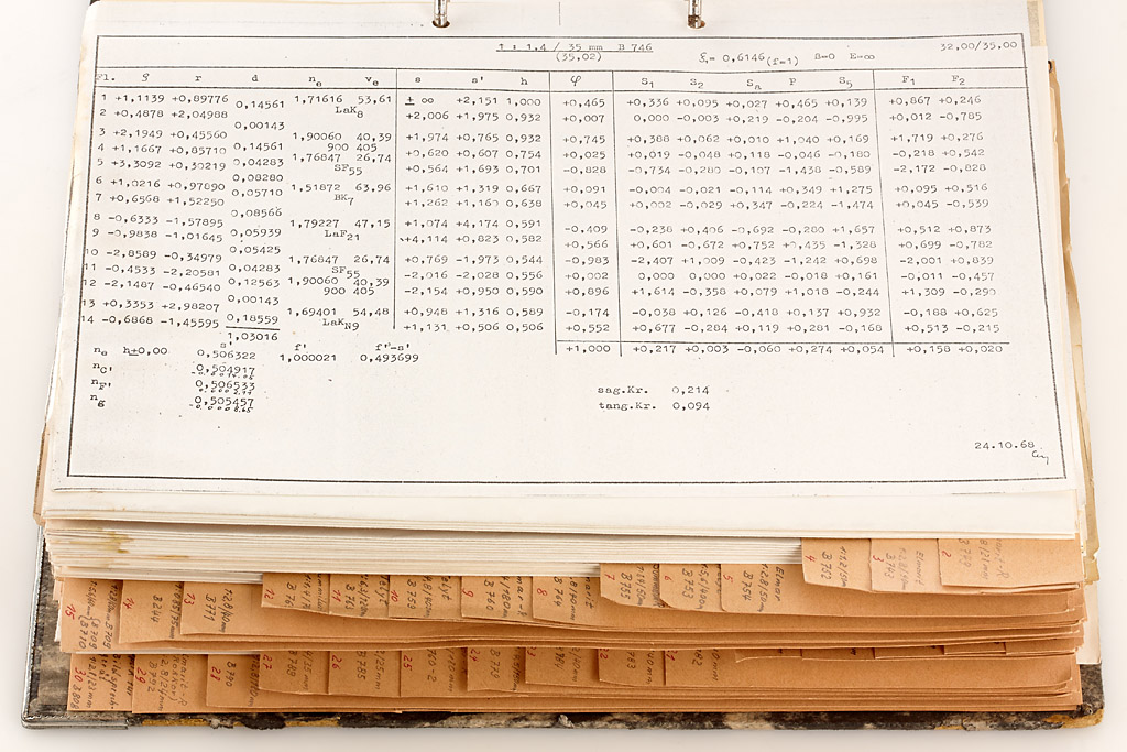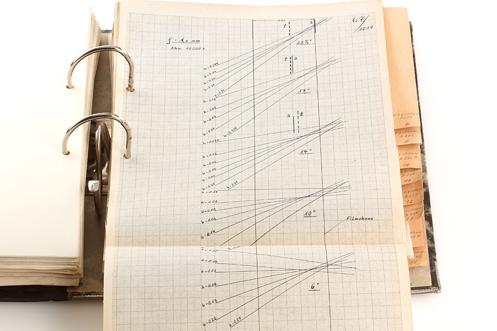 two large Leitz folders containing 45 different post-war lens designs (Summarit 1.4/5cm, Summilux 1.4/50mm, Summitar 2/5cm, Noctilux 1.2/50mm, Elmarit 2.8/40mm, 0.85/75mm, Elmarit-R 2.8/24mm in Rokkor design, etc.), some of them went never into production (for example: Telyt 6.3/1200mm, Summilux-R 1.4/70mm, 1.7/28mm), all lens drawings also have typical 'Bxxx' numbers as Leica prototype lenses - a very interesting piece of history