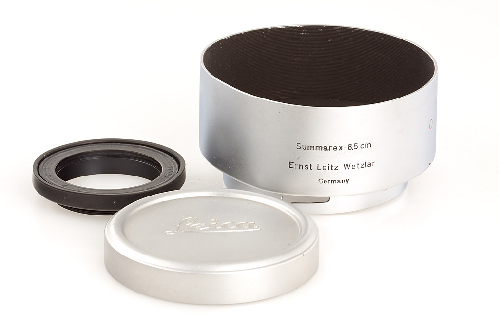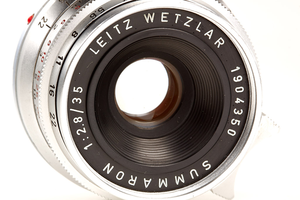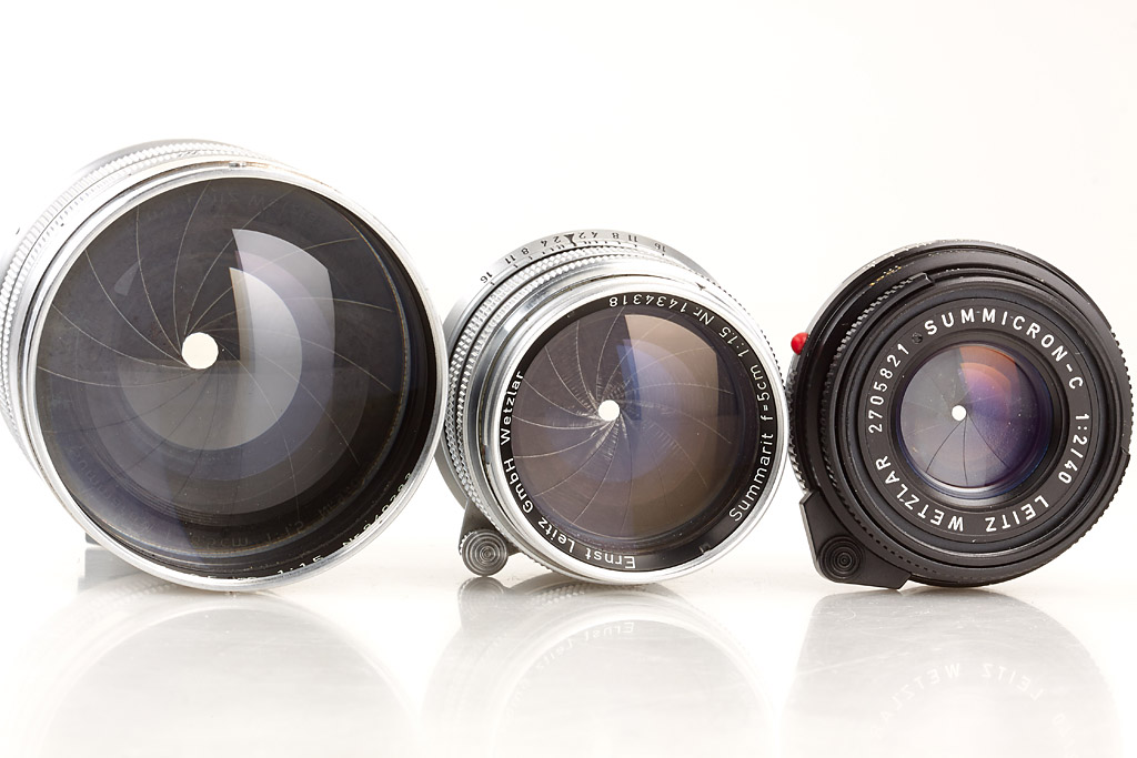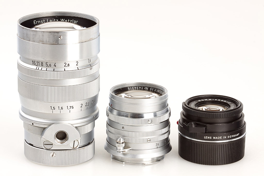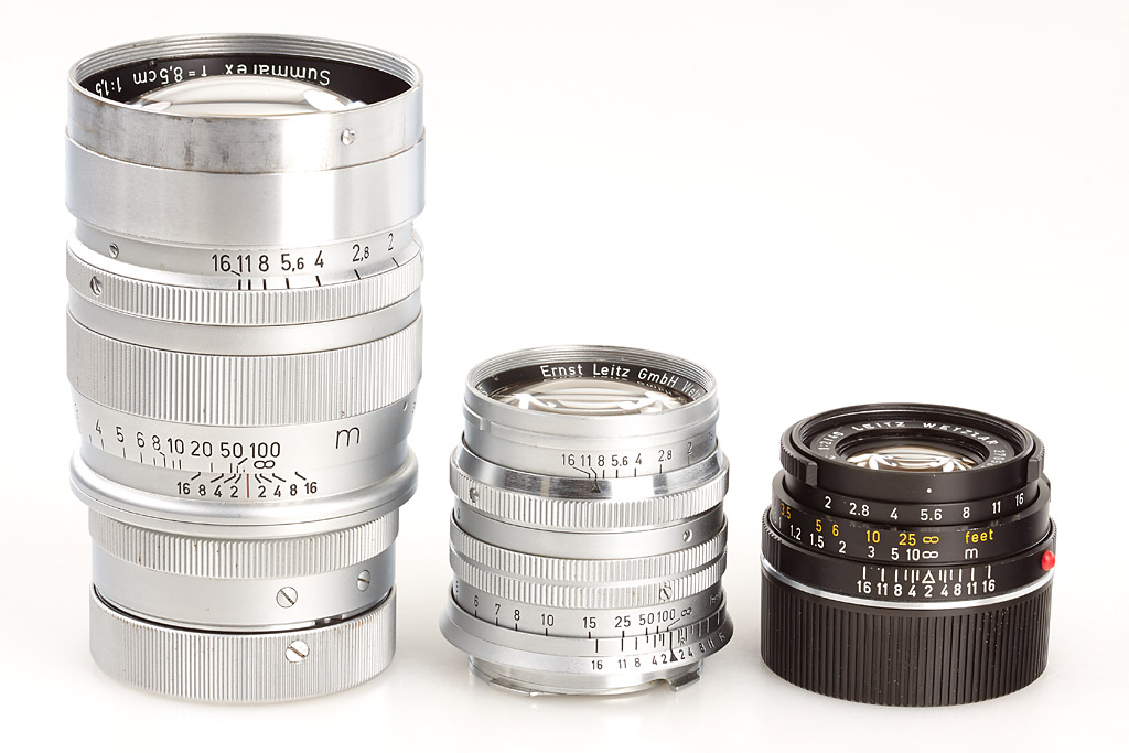 (1) M3 Summaron 2.8/35mm no.1904350 (cap), (2) M3 Summaron 2.8/35mm no.2101494 (caps, maker's box), (3) Summicron-C 2/40mm no.2705821 (hood, caps, maker's box), (4) Summarit 1.5/5cm no.1434318, Summarex 1.5/8.5cm no.940293 with fixed M-adapter (hood, caps) - all lenses used with cleaning marks (5)