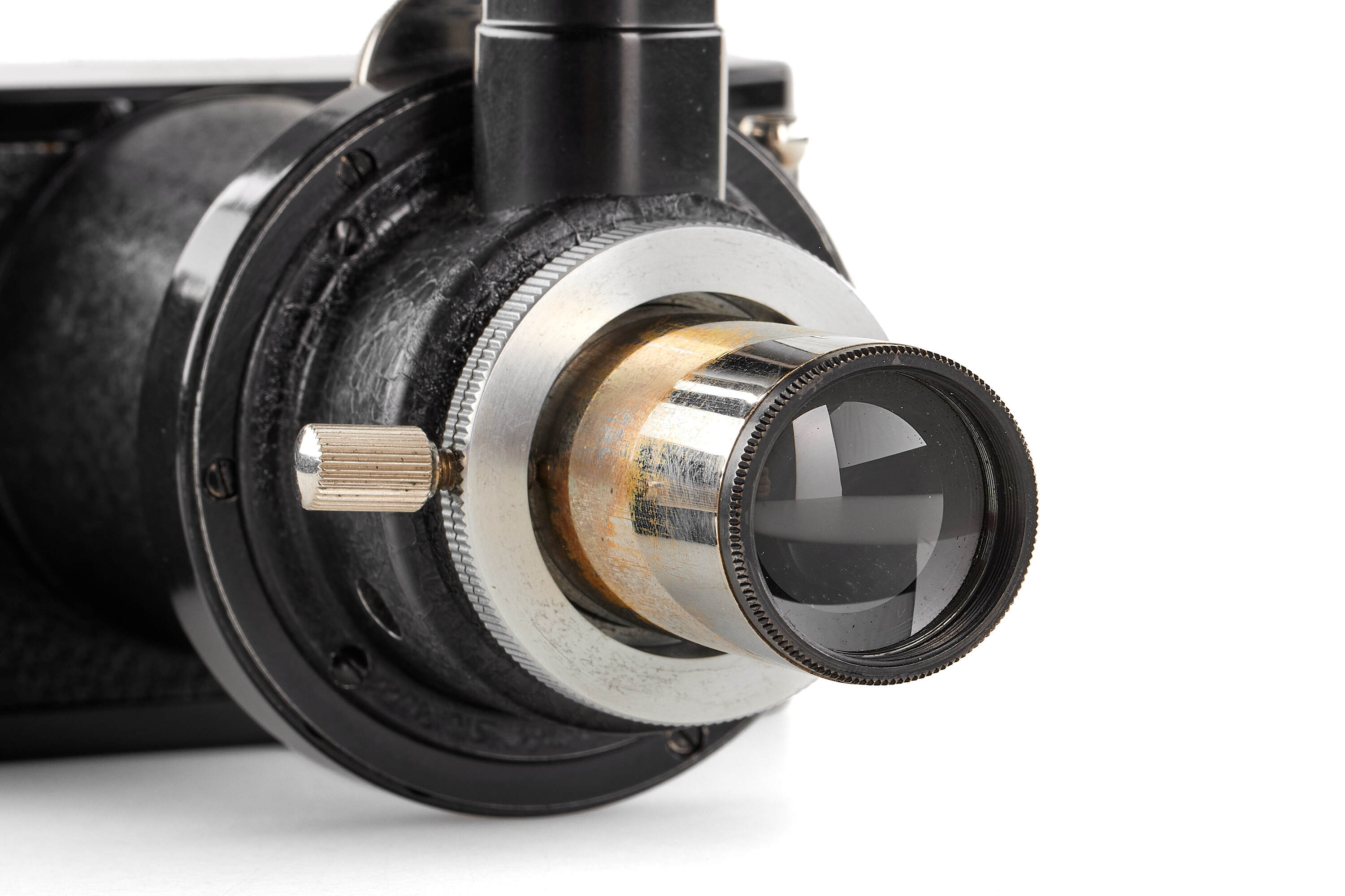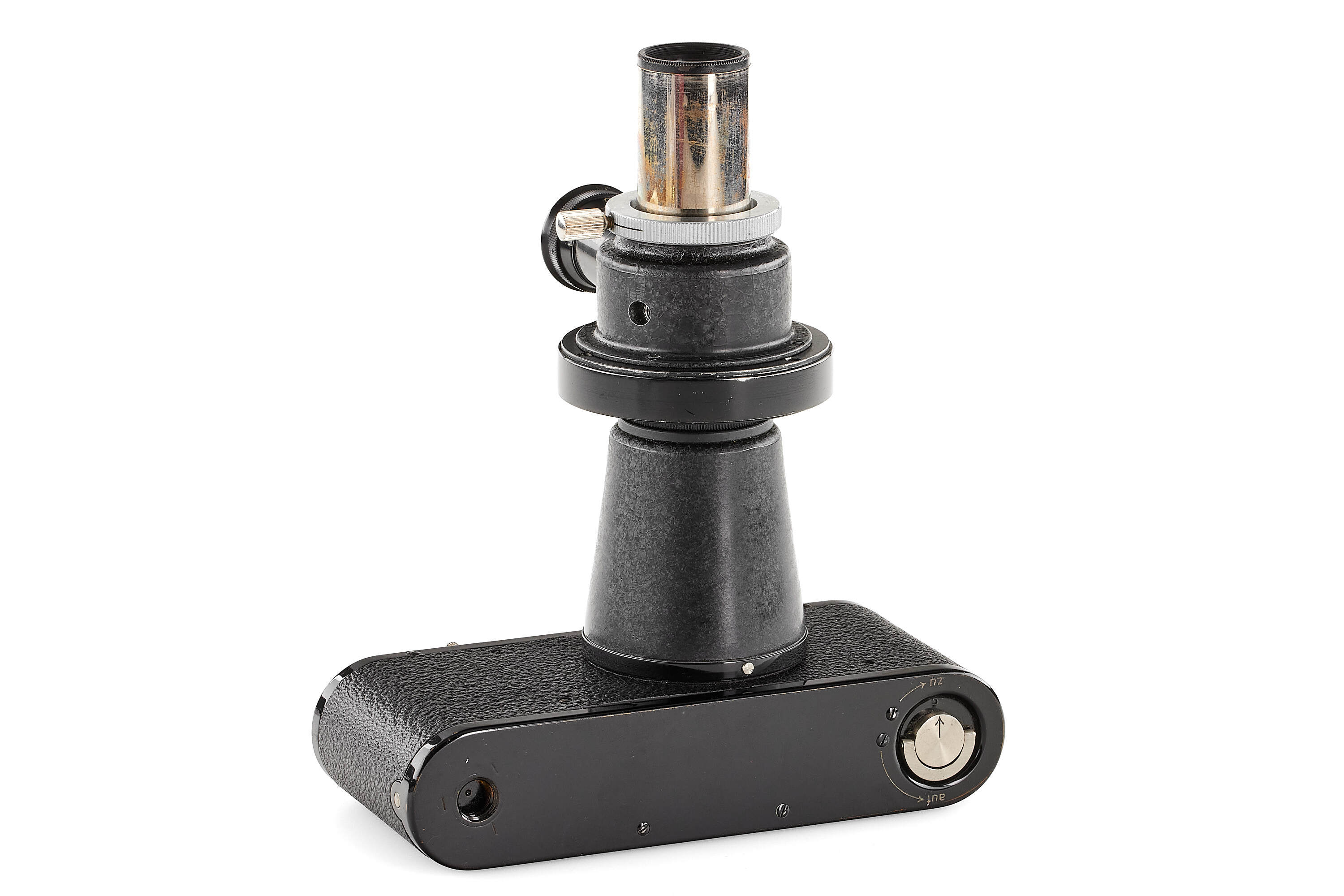 Very rare camera for microscopes resembling the Compur-Leica housing, early version with non-removable 1/3x conical adapter, dial set Compur-shutter, body in beautiful, mint condition, complete set with 2x release cables, rare CALOS release coupler, 2x film magazines and red wooden outfit box.