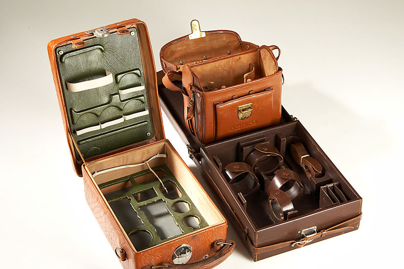 rare solid leather case for 200mm Telyt with PLOOT, Leica with 5cm lens, 13.5cm lens, rapid winder and 4 filters, also included is a Omnica outfit case for Leica and a outfit case made for post-war Contax outfit