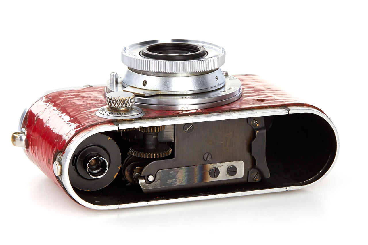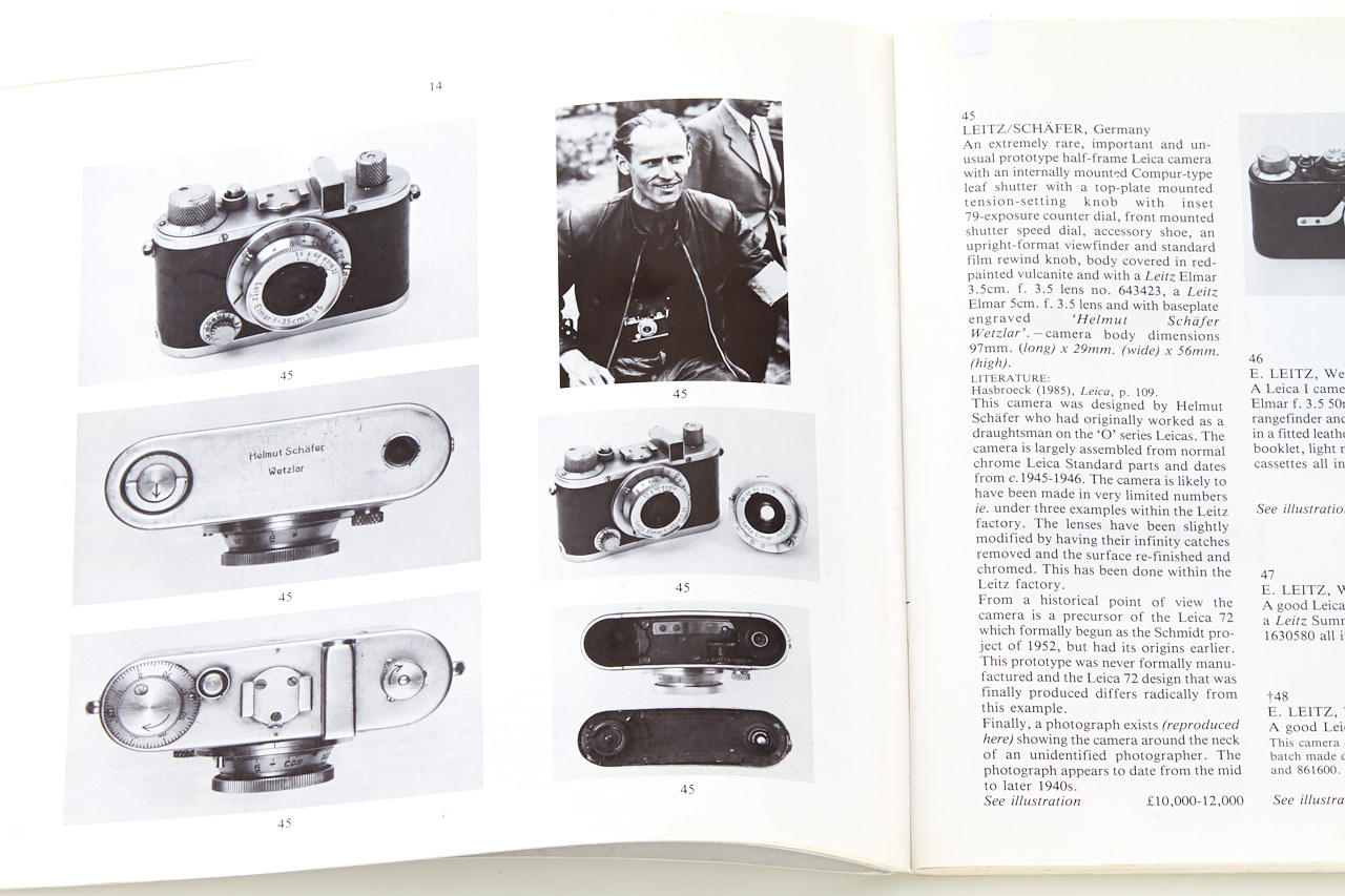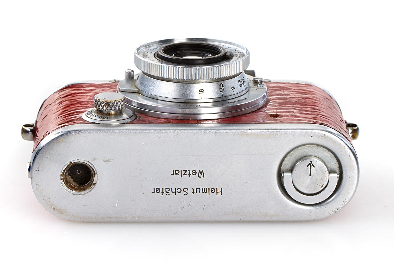 Unique small size camera made by Leitz engineers with internally mounted Compur-type leaf shutter, 80-exposure counter dial, front mounted shutter speed dial, half-frame viewfinder, red painted vulcanite, baseplate engraved 'Helmut Schäfer Wetzlar', modified Elmar 3.5/3.5cm no.643423 - ex Christie's auction July 1989 (the catalogue shows a photographer using this camera c.1948), the camera is also on the cover of the LHSA Viewfinder magazine Vol. 22 No.4 1989