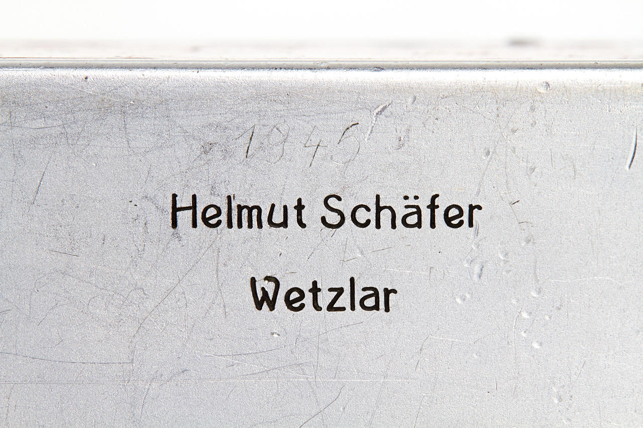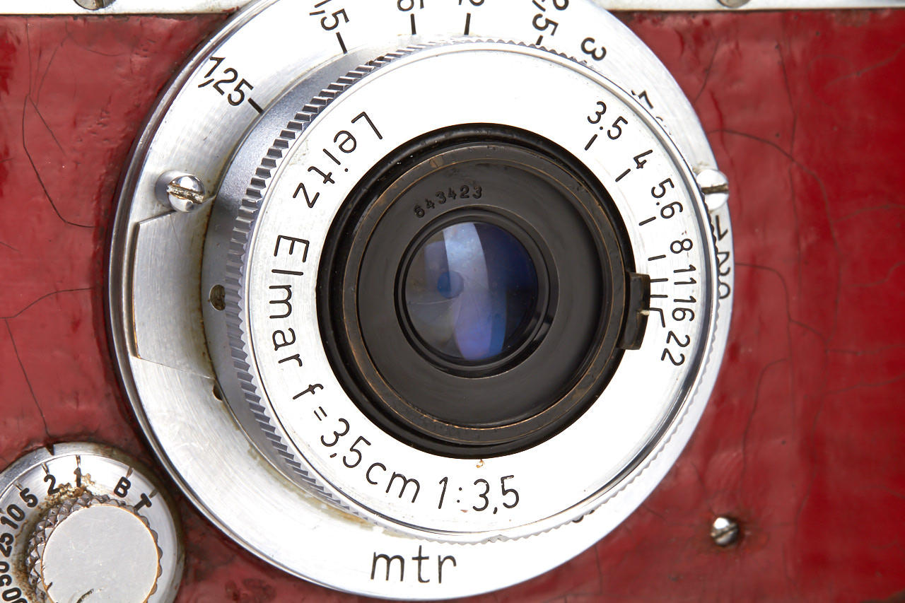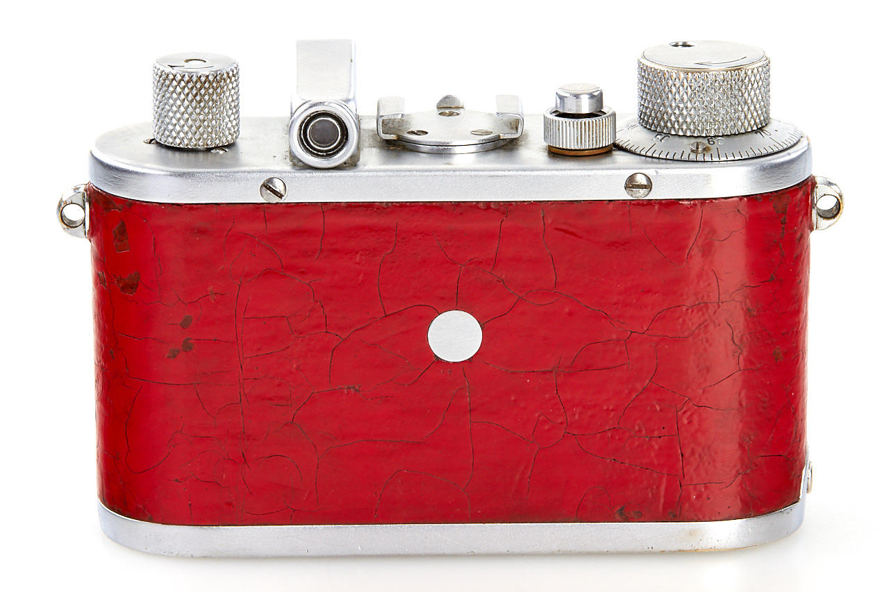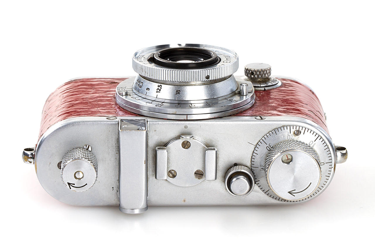 Unique small size camera made by Leitz engineers with internally mounted Compur-type leaf shutter, 80-exposure counter dial, front mounted shutter speed dial, half-frame viewfinder, red painted vulcanite, baseplate engraved 'Helmut Schäfer Wetzlar', modified Elmar 3.5/3.5cm no.643423 - ex Christie's auction July 1989 (the catalogue shows a photographer using this camera c.1948), the camera is also on the cover of the LHSA Viewfinder magazine Vol. 22 No.4 1989