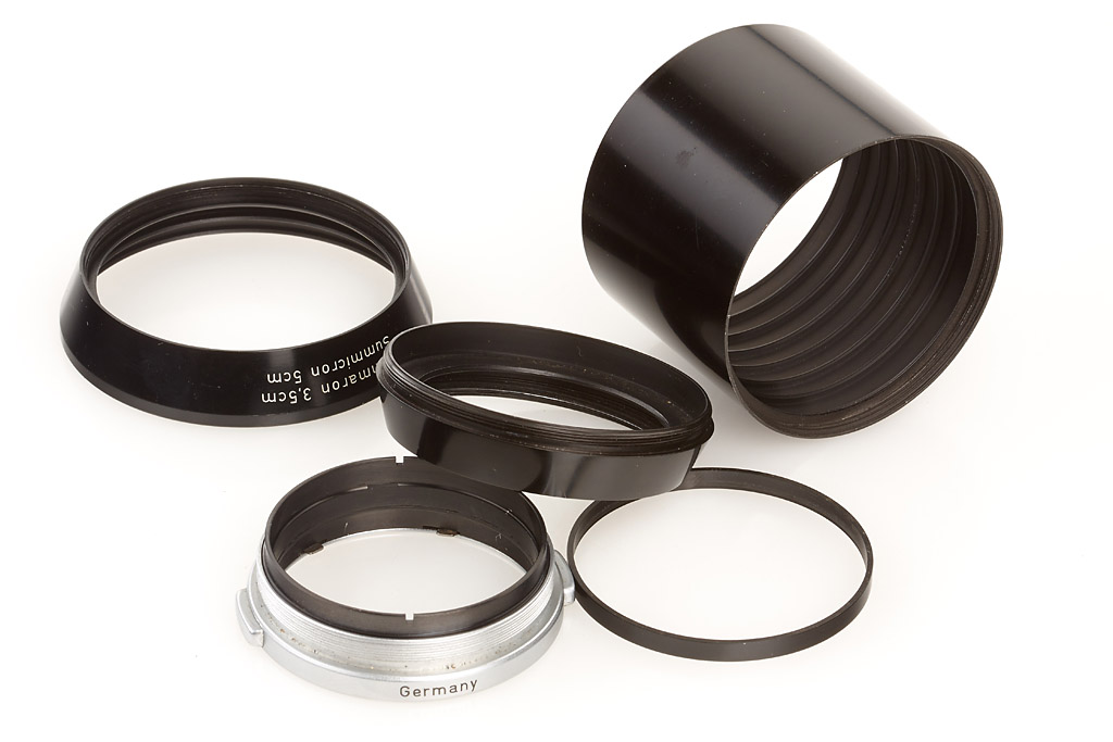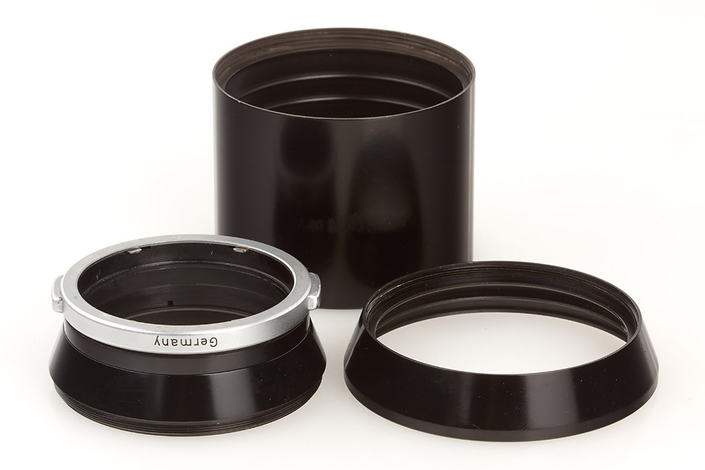 unique prototype hood for E39 Summaron 3.5cm, Summicron 5cm, Elmar 9cm and Hektor 13.5cm, can be separated in 4 parts (all engraved, also to accept lay-in filters), the hood was part of Leica M3 no.700051 (Leica Technik 57) with 3 prototype lenses