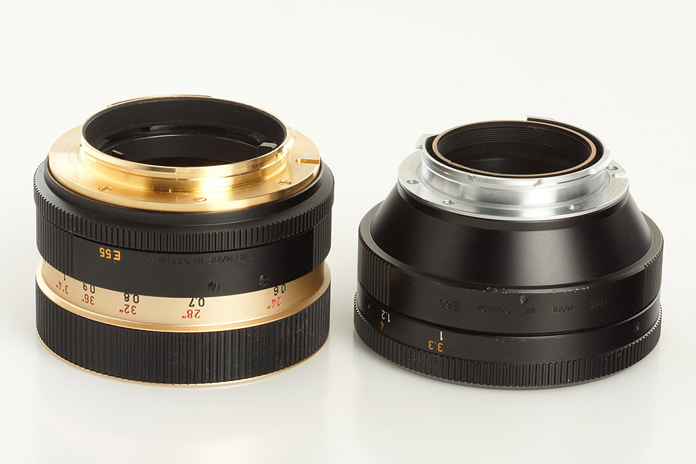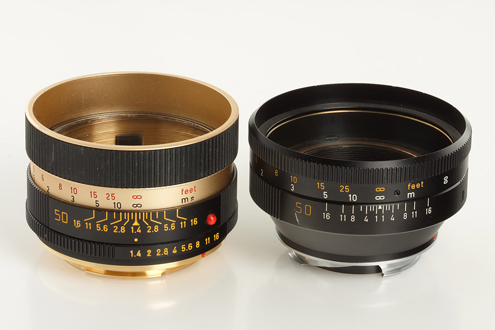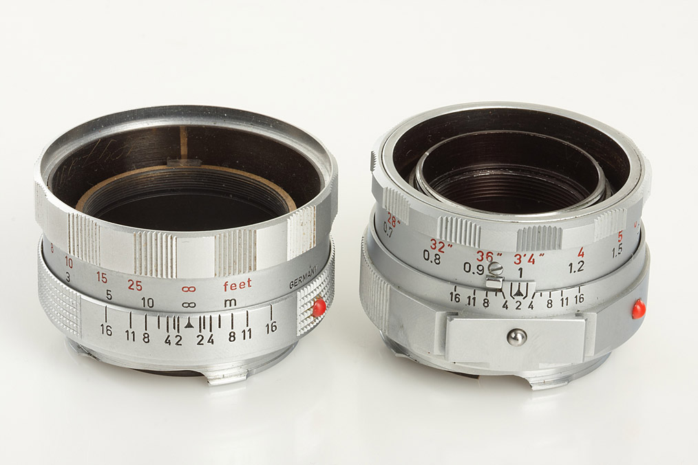 10 different focusing mounts, all in good condition (Summilux-R 1.4/50mm Gold, Summilux-M 1.4/50mm black, Summilux 1.4/50mm chrome, Noctilux 1/50mm, Super-Angulon 3.4/21mm black, CF Summicron 2/50mm, rigid Summicron 2/50mm with black painted depth-of-field scale, Elmarit-M 2.8/90mm black, Elmar 4/135mm, Hektor 4.5/13.5cm M39 (10)