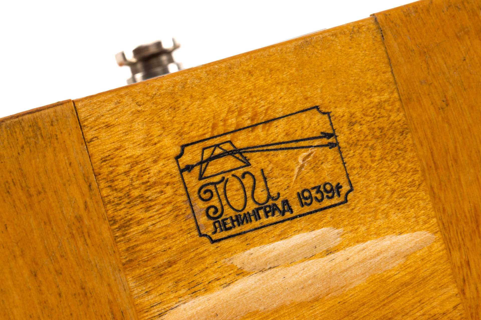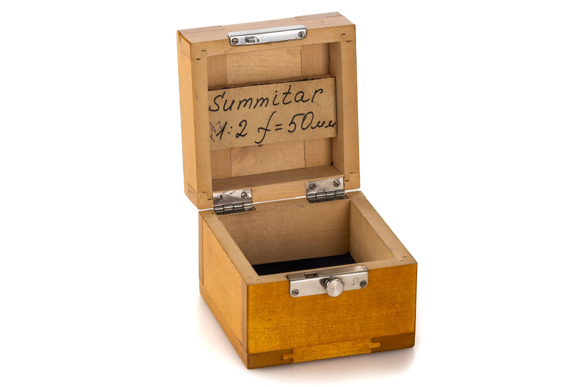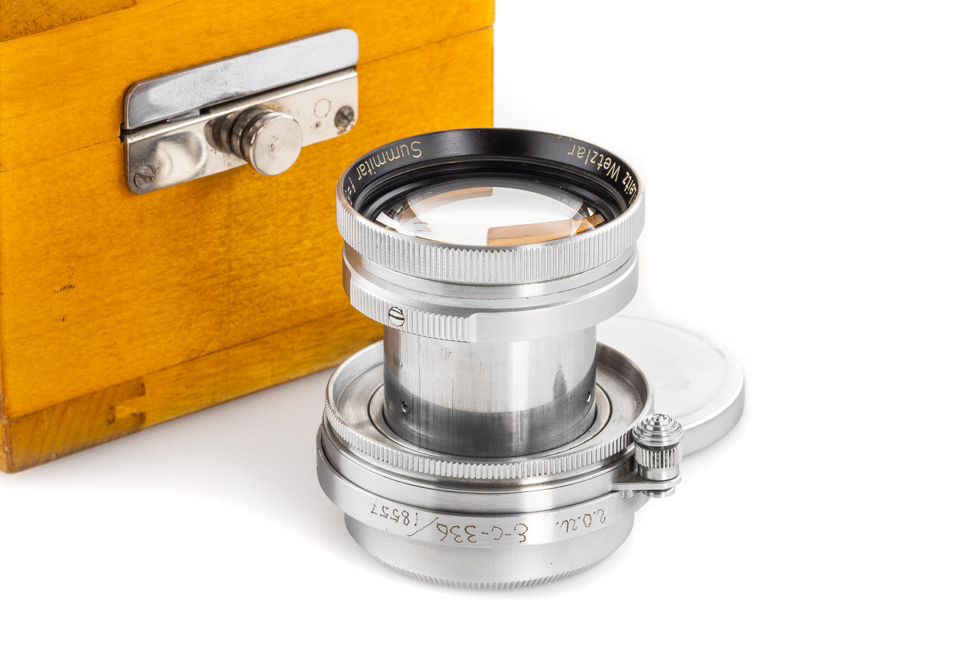 This interesting lens was delivered to Berlin in 1939, and was bought by the Soviets for the GOI factory and used for optical testing and further development of the lenses of Soviet production, after the war the lens remained in the factory archive. It shows hand-engraved GOI inventory numbers on the mount 'G.O.I. E-c-336/185557', with Soviet lens cap and GOI Leningrad wooden box with a sticker inside 'Summitar 1:2 f=50mm', an interesting piece of history of the Soviet photo industry