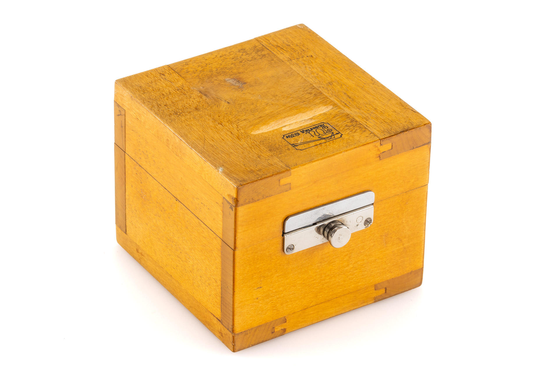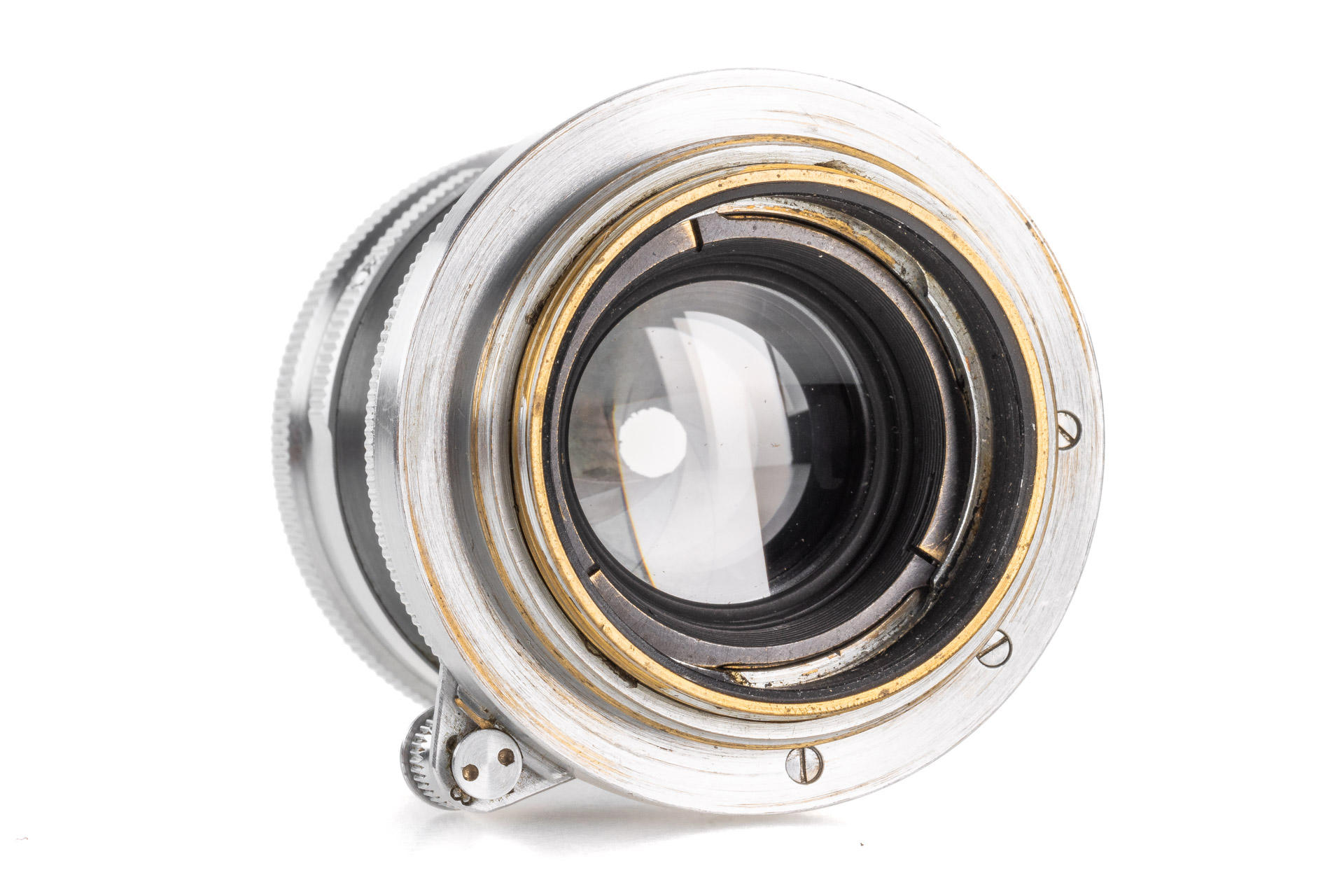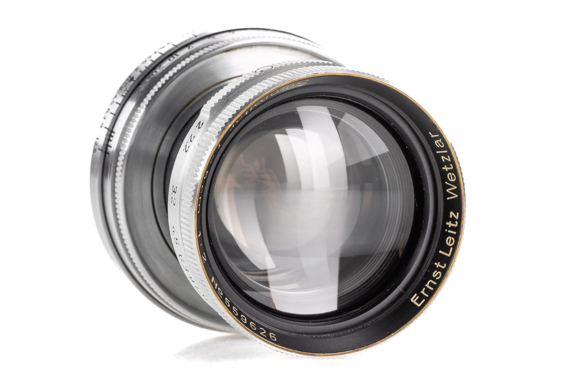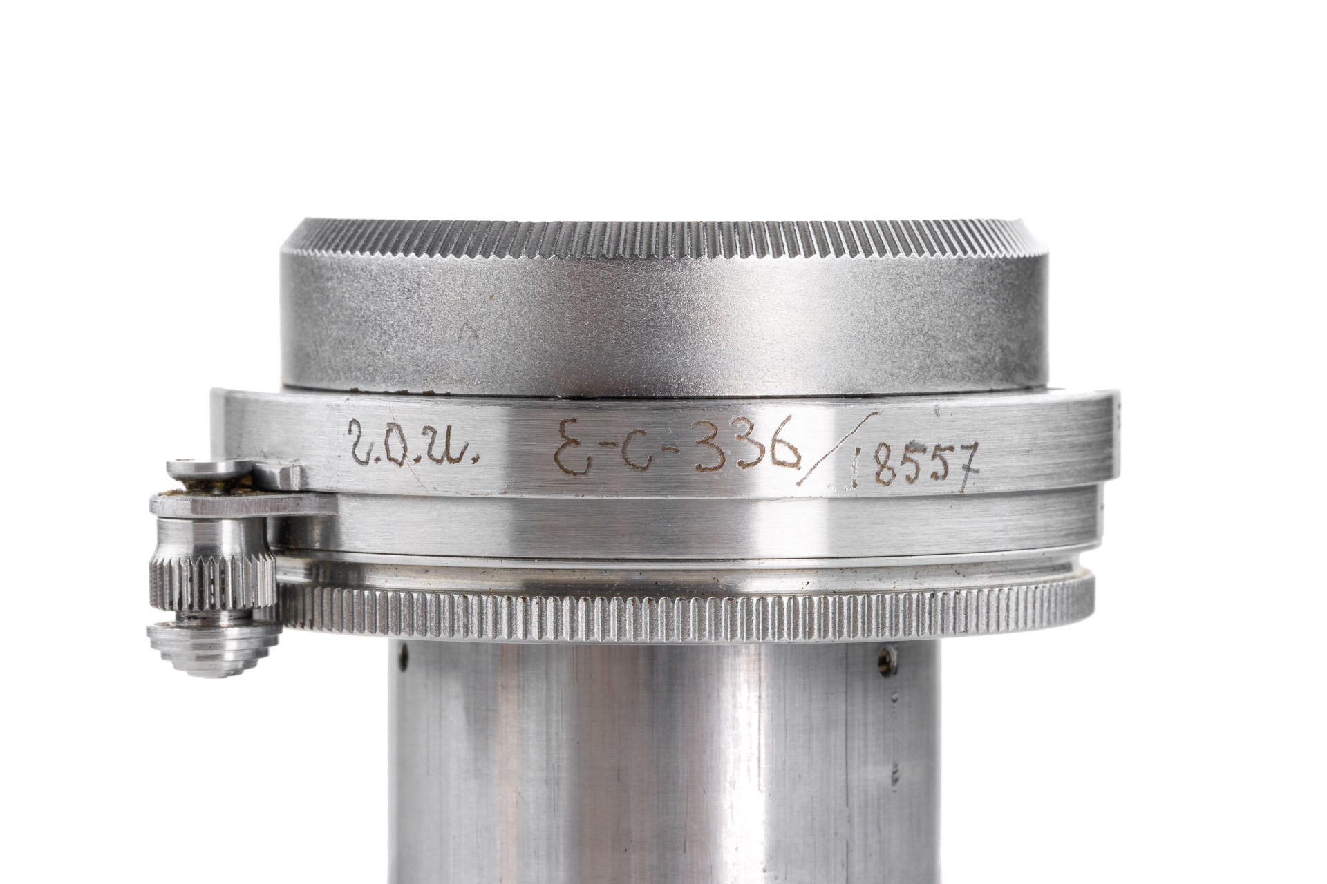 This interesting lens was delivered to Berlin in 1939, and was bought by the Soviets for the GOI factory and used for optical testing and further development of the lenses of Soviet production, after the war the lens remained in the factory archive. It shows hand-engraved GOI inventory numbers on the mount 'G.O.I. E-c-336/185557', with Soviet lens cap and GOI Leningrad wooden box with a sticker inside 'Summitar 1:2 f=50mm', an interesting piece of history of the Soviet photo industry