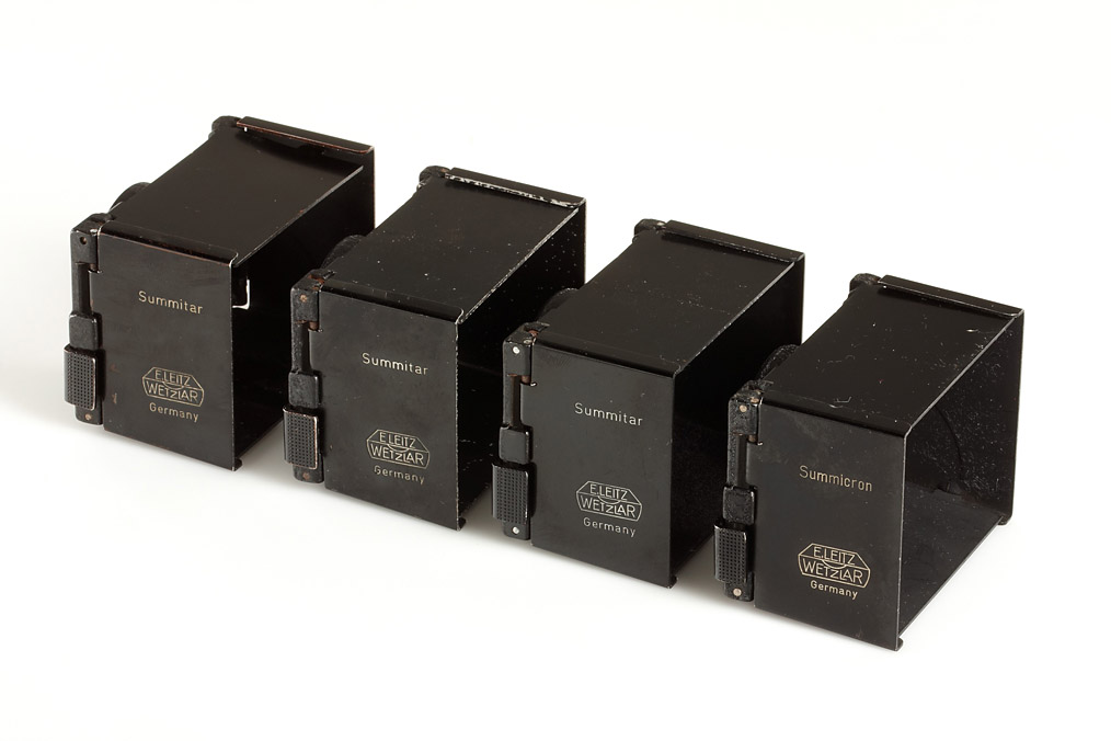 Visoflex II for M with 90° magnifier, early black WINKO in case, 3 SOOPD hoods engraved: Summitar, SOOFM hood engraved: Summicron, 3 black A36 slip-on filters, 5 filters for Summitar, FODIS rangefinder, CEYOO flash with reflector and cable, 7 cassettes with film containers, Forster Frame Finder (copy of RASUK + RAMET) in maker's box (24)