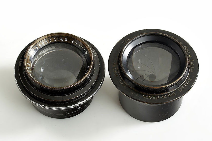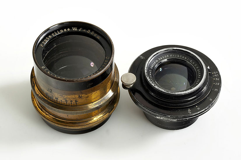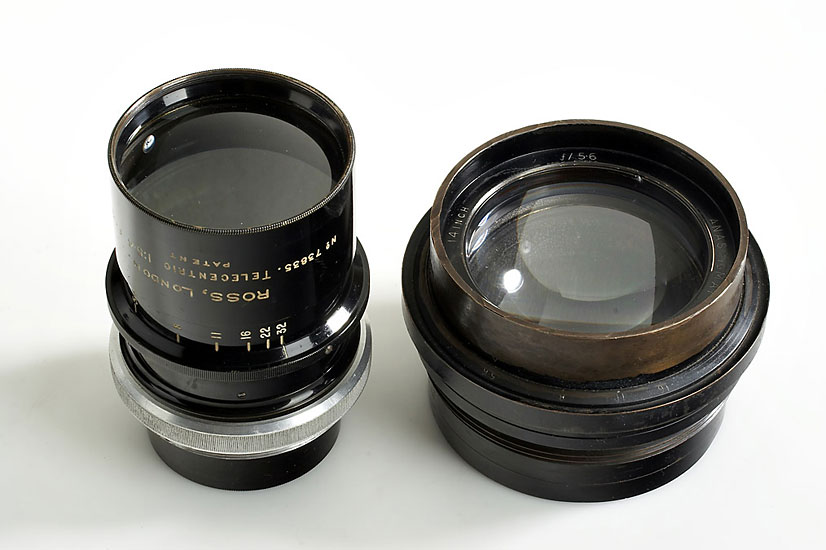 R.O.L. 6.3/20" no.68682 (British military aerial lens engraved: REF.14A/4264), 5.6/14" Anastigmat no.278737, Ross Telecentric 5.4/12" no.73835, T&H Cooke Anastigmat 3.9/6", Carl Zeiss Jena Tessar 4.5/18cm no.677992, brass Carl Zeiss Jena Protarlinse VII 29 + 35cm no.322501, Goerz Dagor Ser.III 6.8/150mm no.282593 - all lenses without shutters (7)