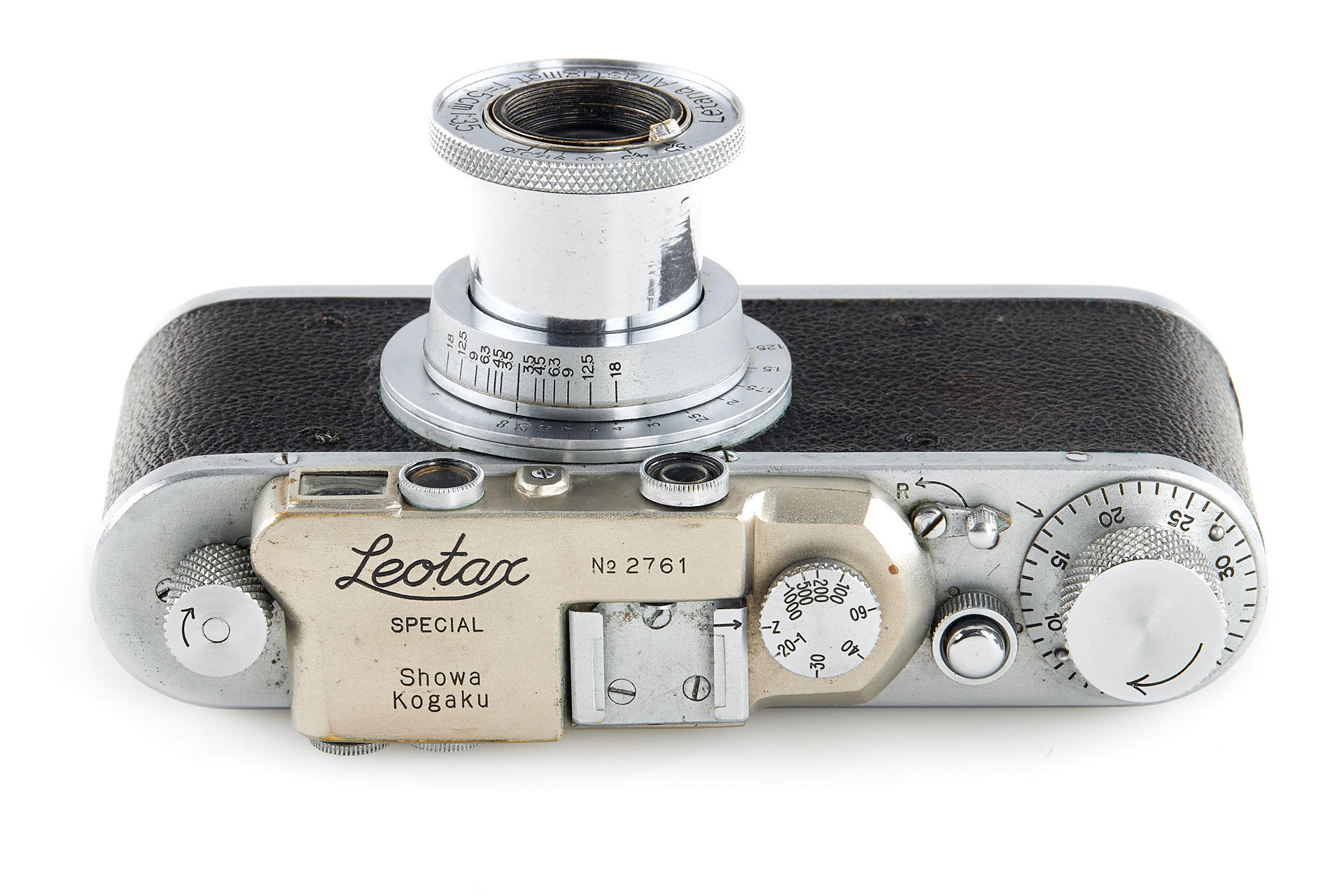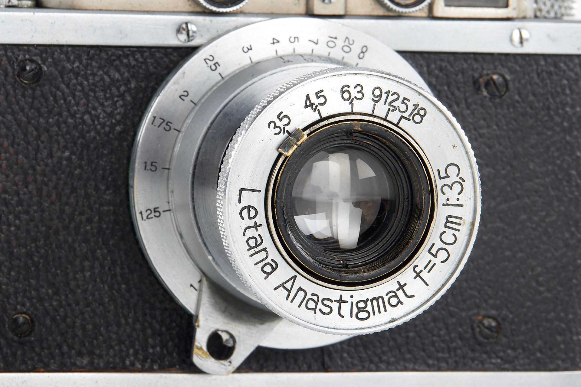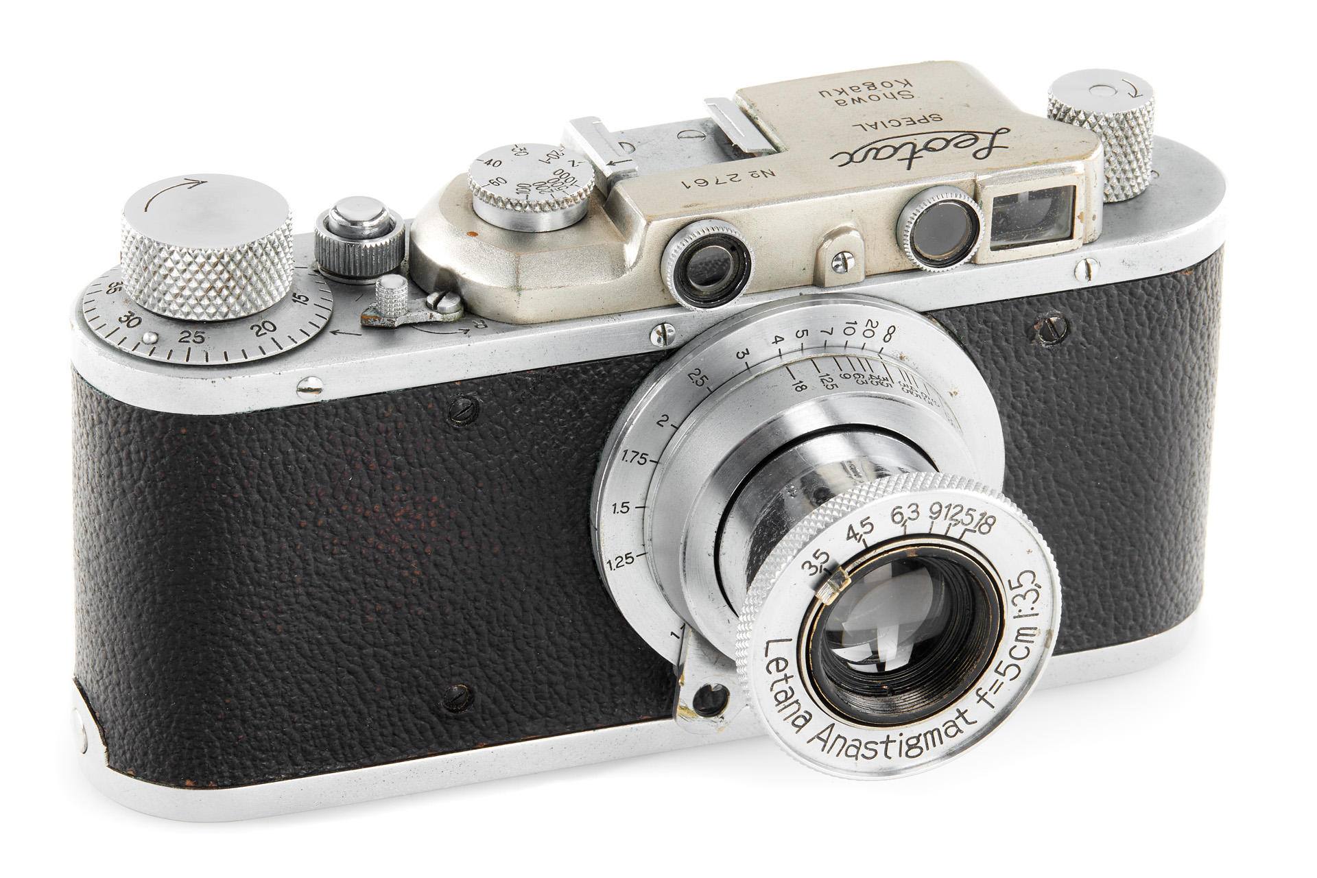 a very rare post-war Leotax Special, made in very small numbers from the available leftover parts of earlier Special A and Special B, in fine condition, few parts (base plate, speeds knob) non-original, with matching Letana Anastigmat 3.5/5cm in interesting, non-rotating collapsible mount (missing infinity lock)