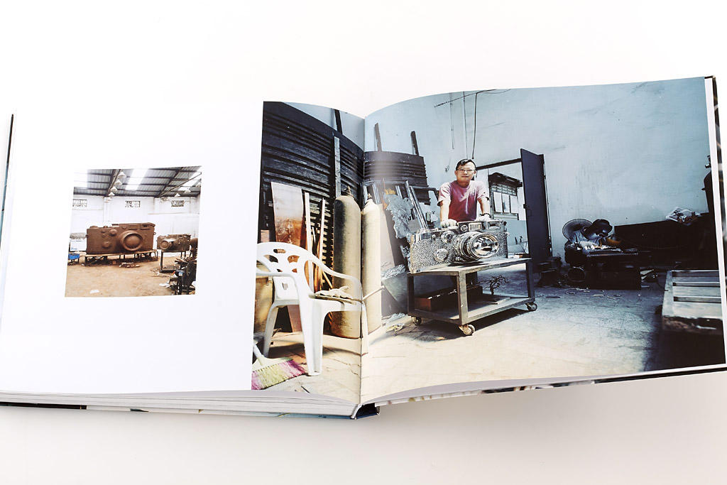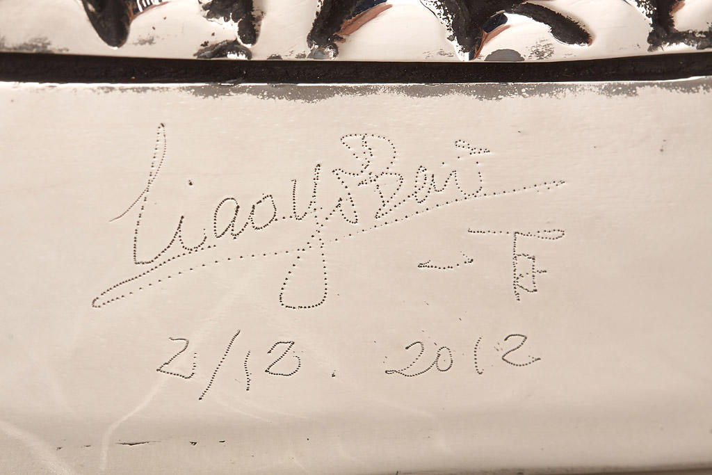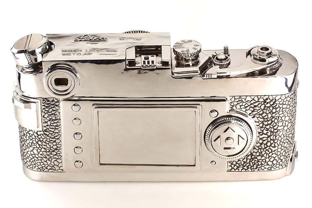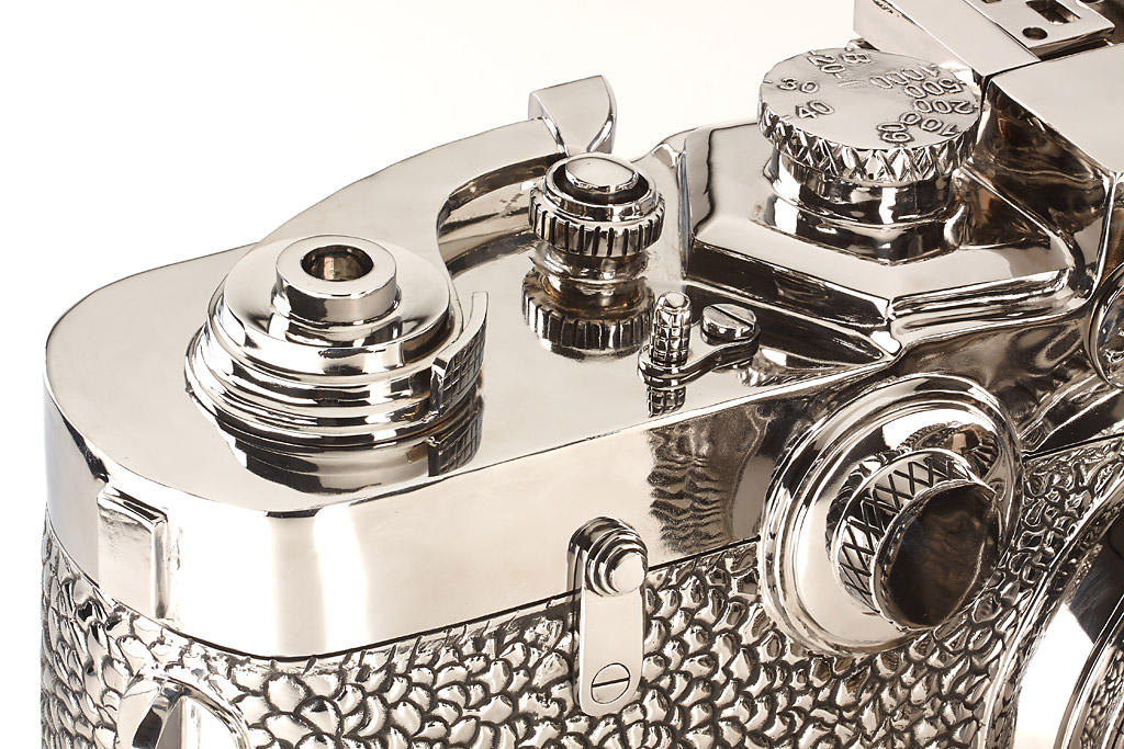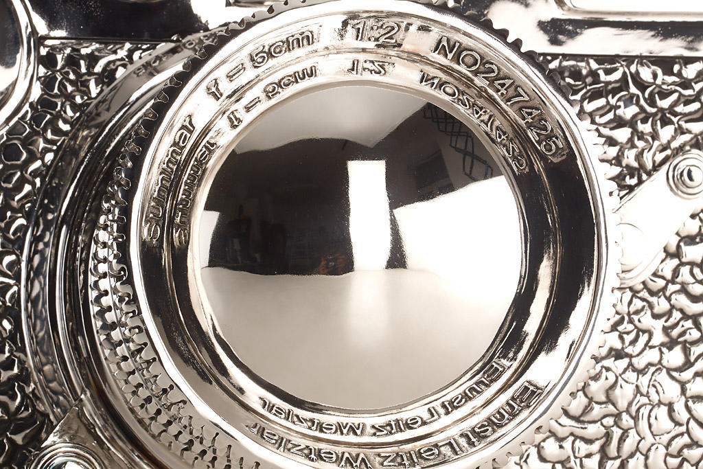 Famous sculpture of the oversized Leica camera created by the Chinese artist Liao Yibay. Only 12 of these sculptures have been made and are extremely hard to find (this particular example is the no.2). On the first look the camera looks like an M6, but closer inspection reveals many interesting details borrowed from various analogue and digital Leica models, like the display on the back, slow speeds dial on front, lack of second rangefinder window, MP-188 engraving on top, electronic contacts on the flash shoe etc. The sculptured camera is equipped with ‘Summar’ 2/5cm no.247425 (in a barrel resembling a collapsible Summicron), comes with wooden transportation box and original design drawing by Liao Yibai. The artist is known for creating hand-welded stainless steel sculptures of oversized watches, bags, rings and other luxury items, his work has been acclaimed and exhibited worldwide.
