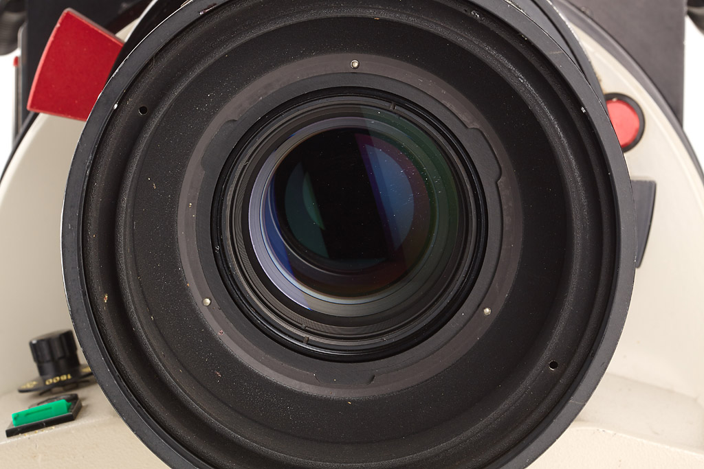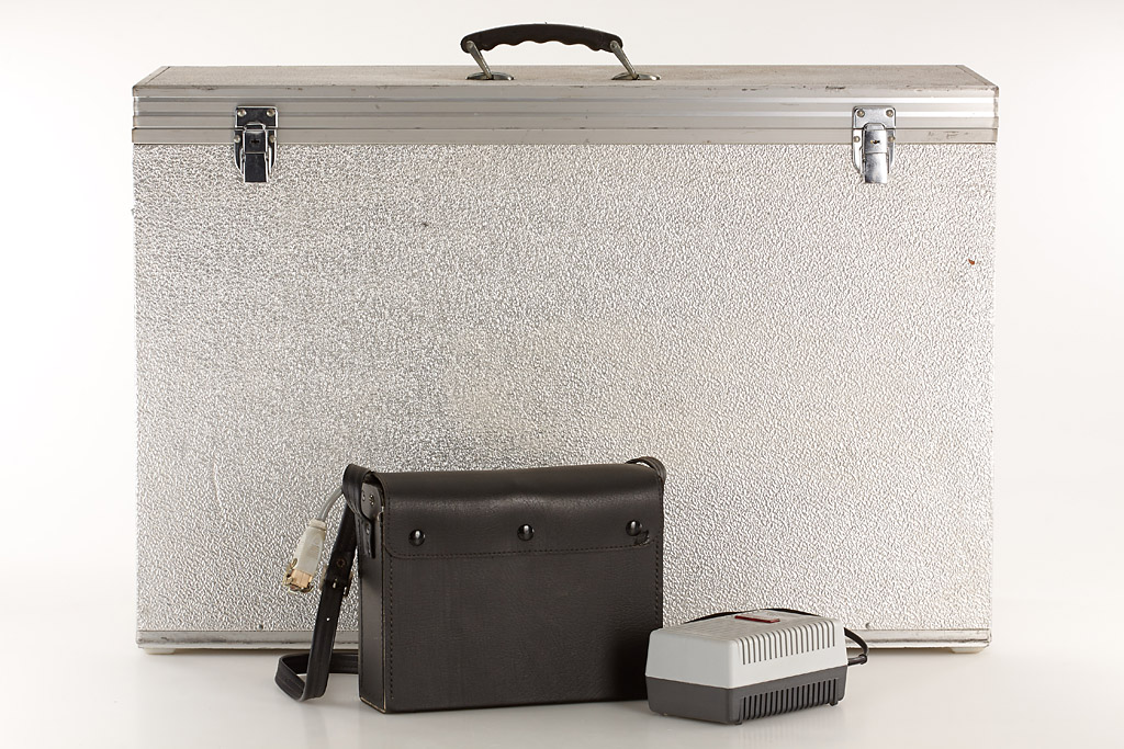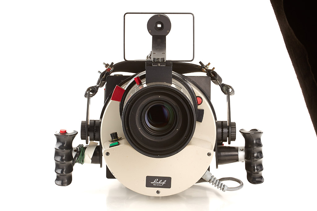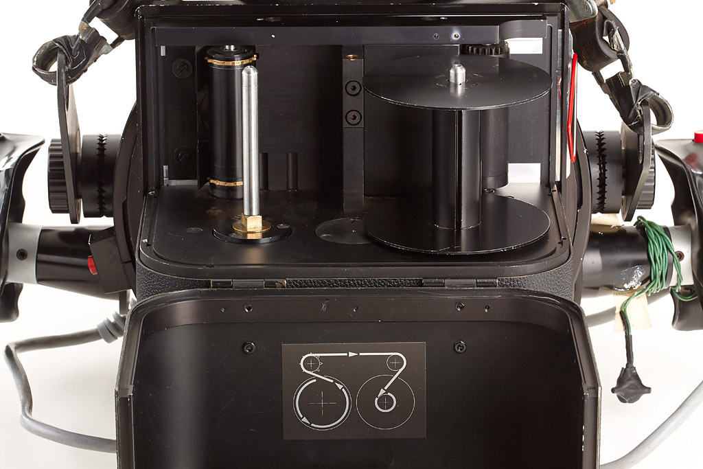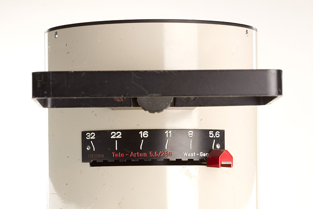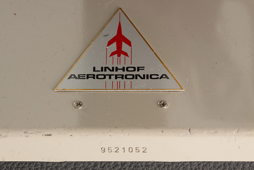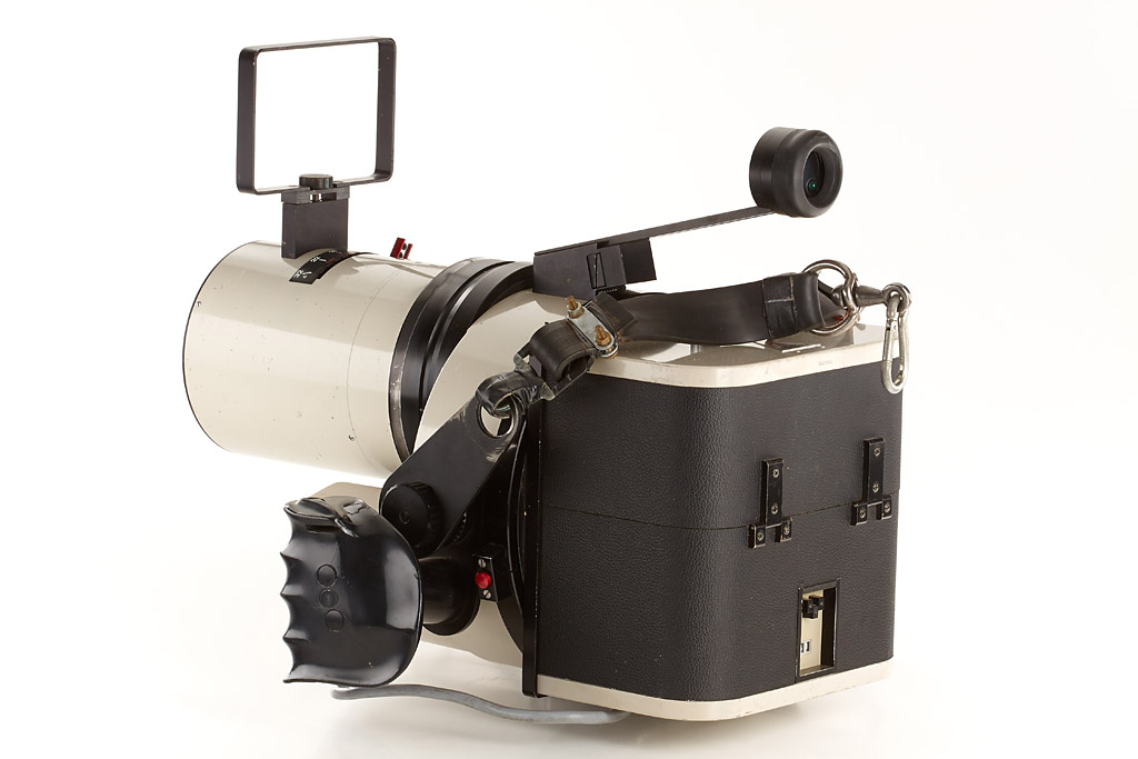 Rare Aerial camera in very fine condition with Tele-Arton 5.6/250mm, frame finder, strap, charger, battery pack, instructions and matching carrying case. Long focal lengths for small objects and a patented rotation shutter system permitting speeds up to 1/1.500 sec for lenses up to 500 mm. 320 frames of format 6x9cm in one motor cassette.
