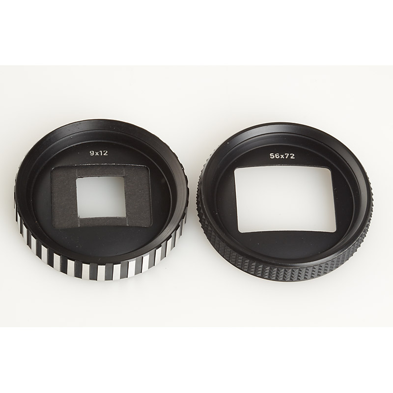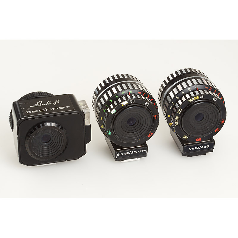 set of three finders in fine condition, (1) universal finder for 6.5x9cm, (2) universal finder for 9x12cm, (3) Technar finder for 60x120 (65mm), two finder masks for 56x72 & 9x12 (3)