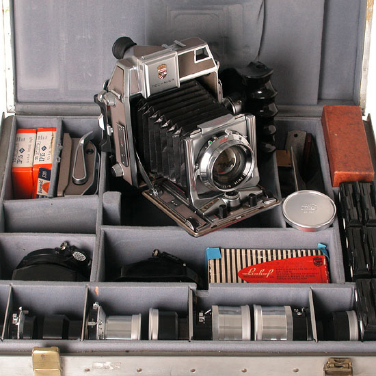 6x9cm, a very complete and nice outfit with Super Technika IV, grip, prism, Planar f/2.8 100mm lens no. 2649428 in Synchro-Compur, Symmar f/5.6 135mm no. 6639975, Tele-Arton f/5.5 240mm, no. 6498442 in Syncho-Compur, Sonnar f/4.8 180mm, no. 2993094 in Synchro-Compur, Biogon f/4.5 53mm no. 2612062 in Synchro-Compur, 6x7cm Super-Rollex, 6 filmholders 6x9cm, hoods with adapter-rings, finder masks, caps for all lenses, guarantee card and papers, the camera and all lenses are in fine and good working condition, all in a fitted metal case