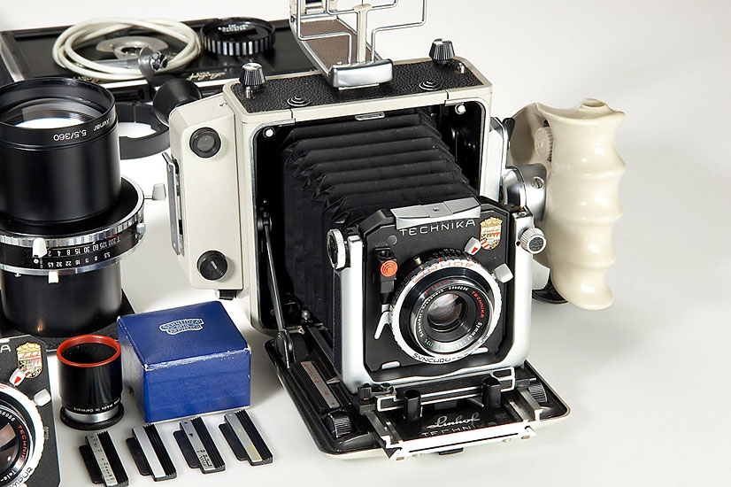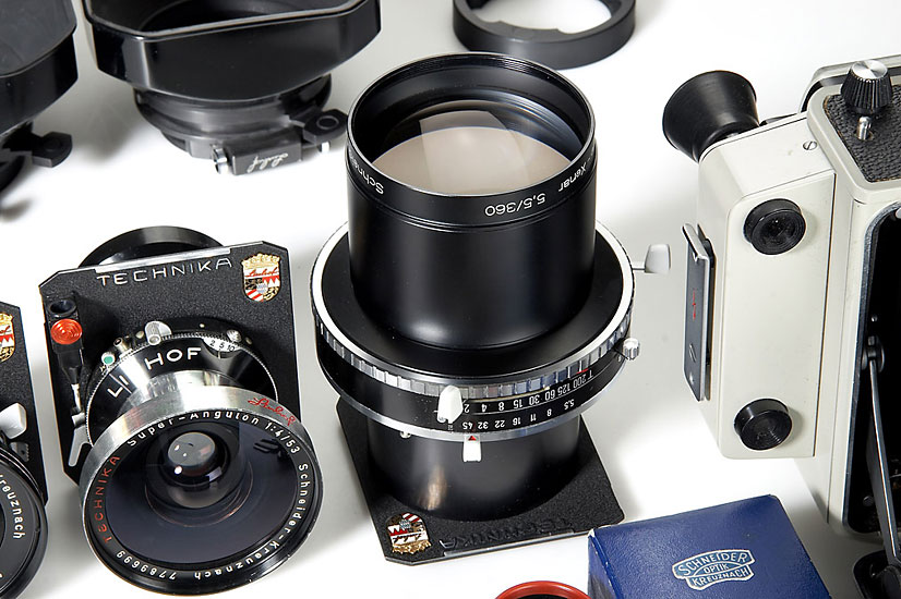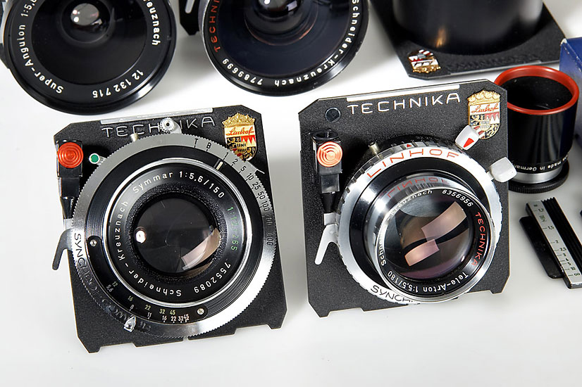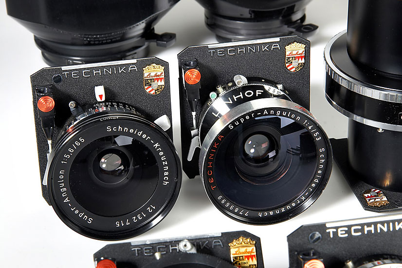 6.5x9cm, special Super Technika V without leather covering, a very fine outfit with 6 Schneider lenses (2 rangefinder cams with matching numbers): Super-Angulon 4/53mm no.7789699, Super-Angulon 5.6/65mm no.12132715, Symmar 5.6/100mm no.8960236, Symmar 5.6/150mm no.7552089, Tele-Arton 5.5/180mm no.8356956, Tele-Xenar 5.5/360mm no.14056349, all lenses with both caps and perfect optics, focusing screen adapter, form grip, Linhof Universal Finder 6x9 (with additional mask for 56x72), sports finder, Polaroid 100 back, three 6.5x9 double film holders, Schneider magnifier, cable release, 2 hoods, 4 focusing scales (for 53mm, 65mm, 100mm and 180mm), the whole outfit in a matching black outfit case