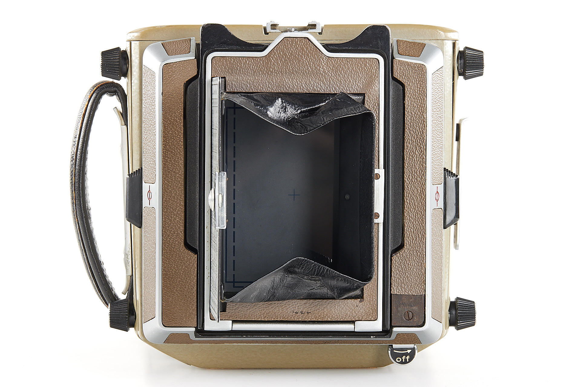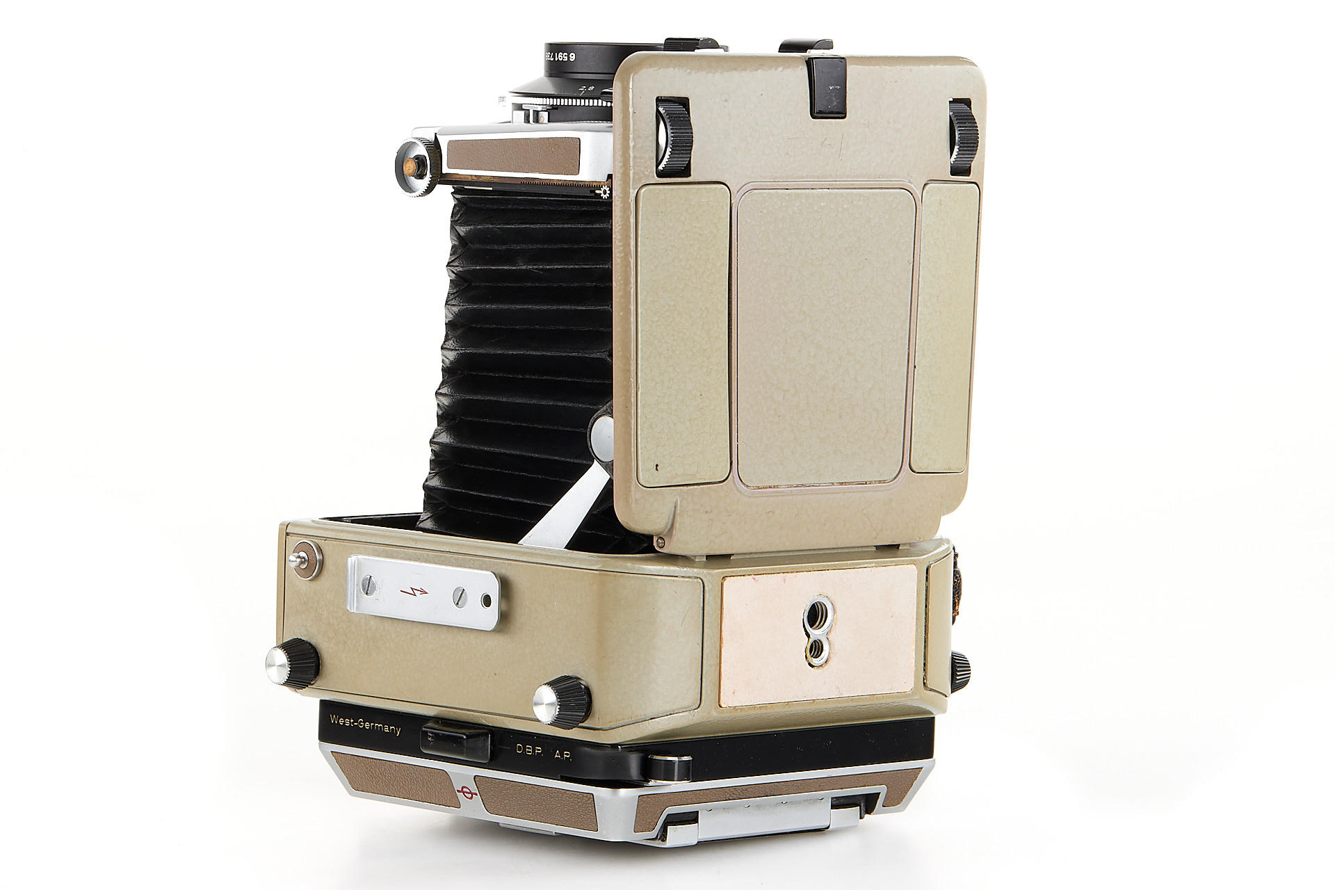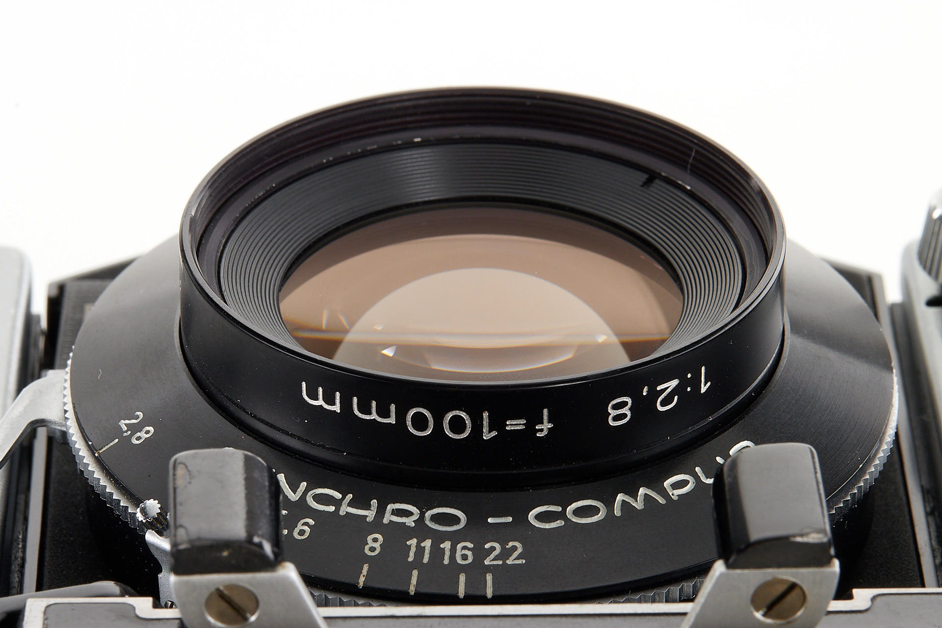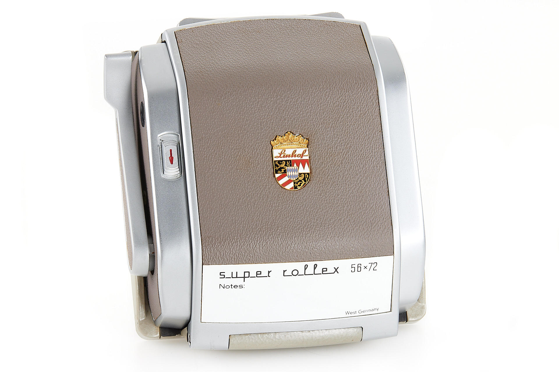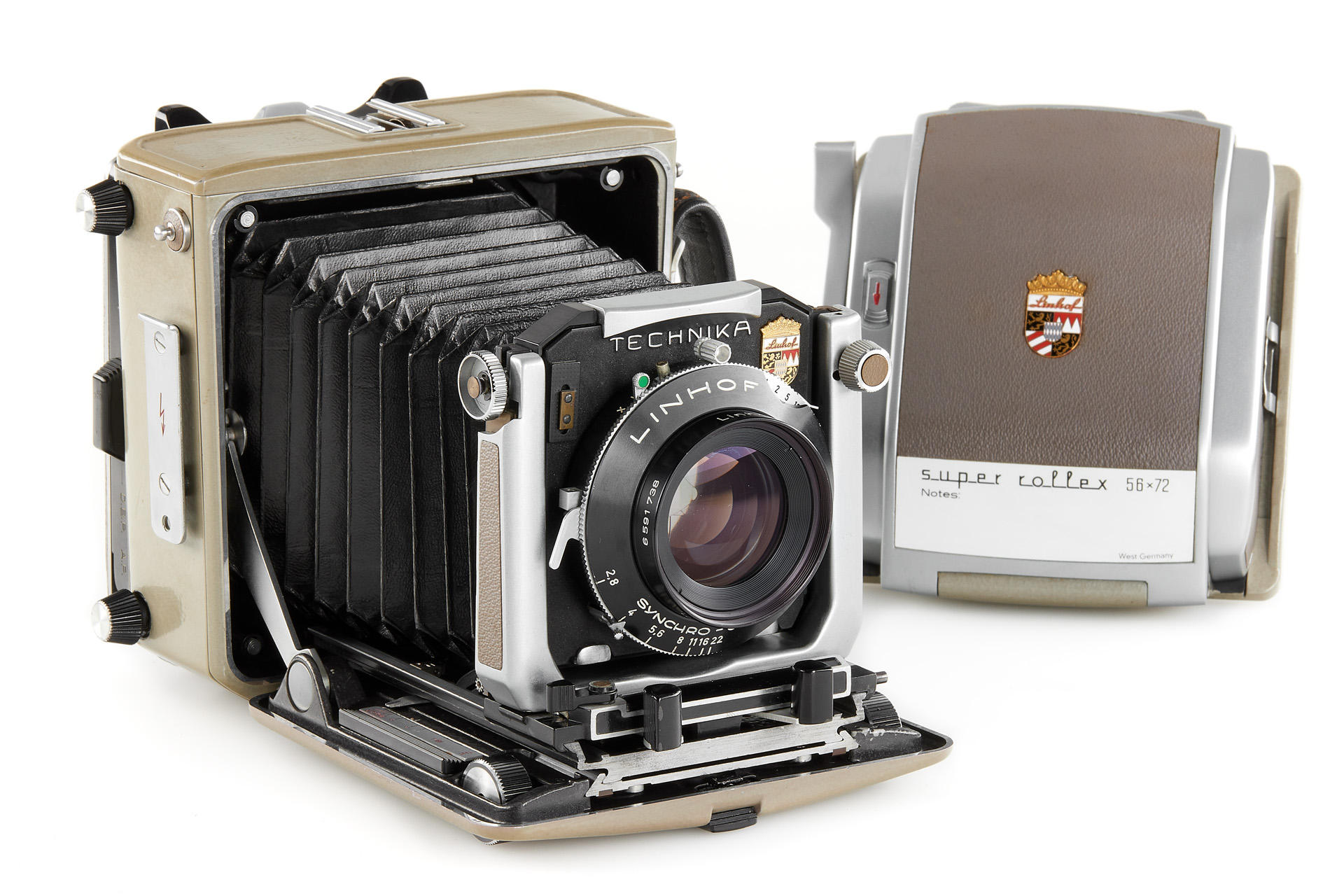 an uncommon variant of the Baby Technika 6x9 without a rangefinder, in very good cosmetic condition (leather patch near the tripod mount replaced) and working order, with rare Rodenstock Technikon 2.8/100mm no.6591738 and Super Rollex 56x72 film back