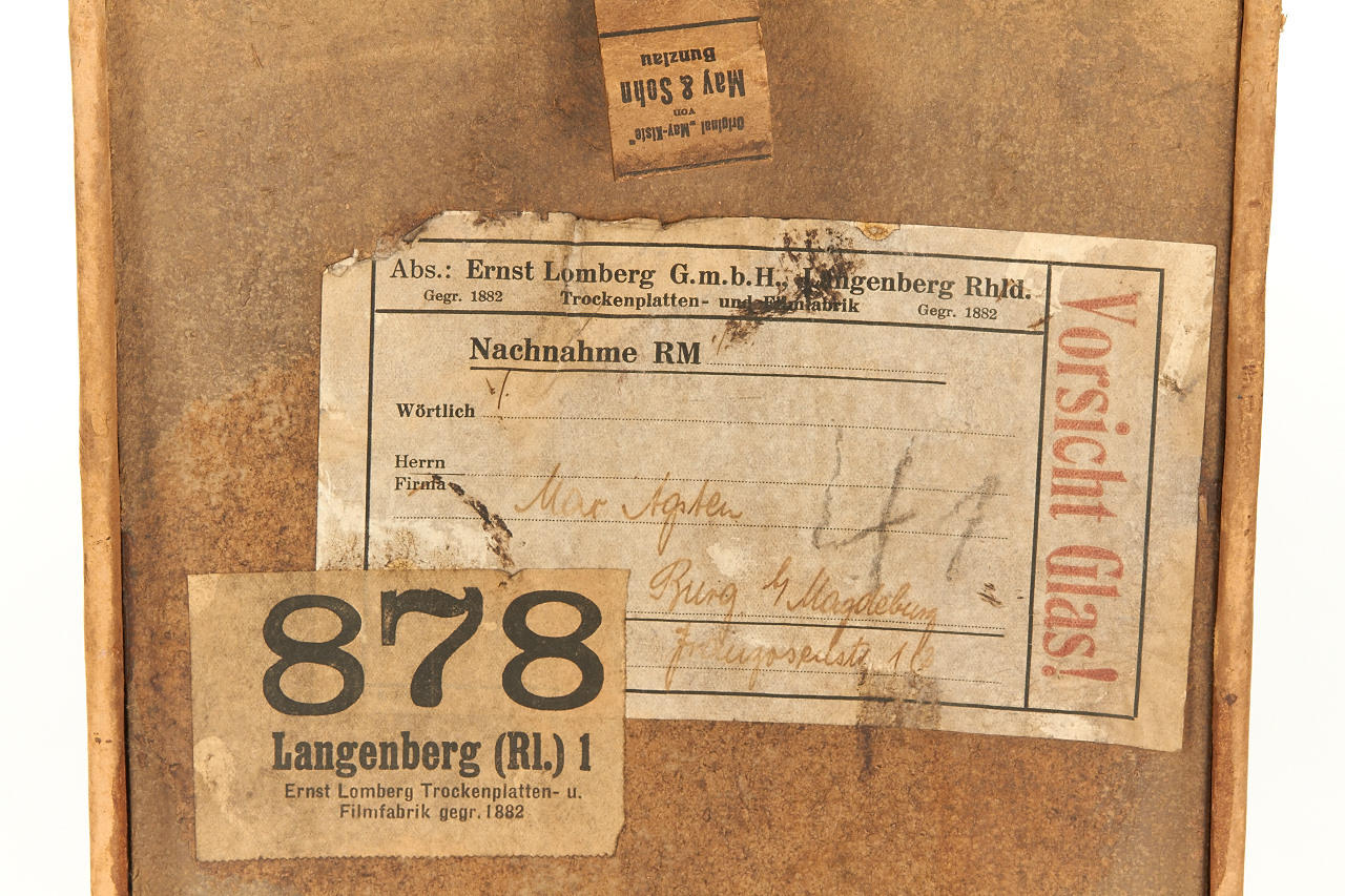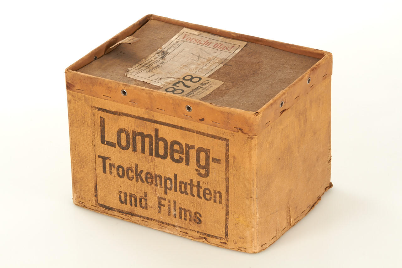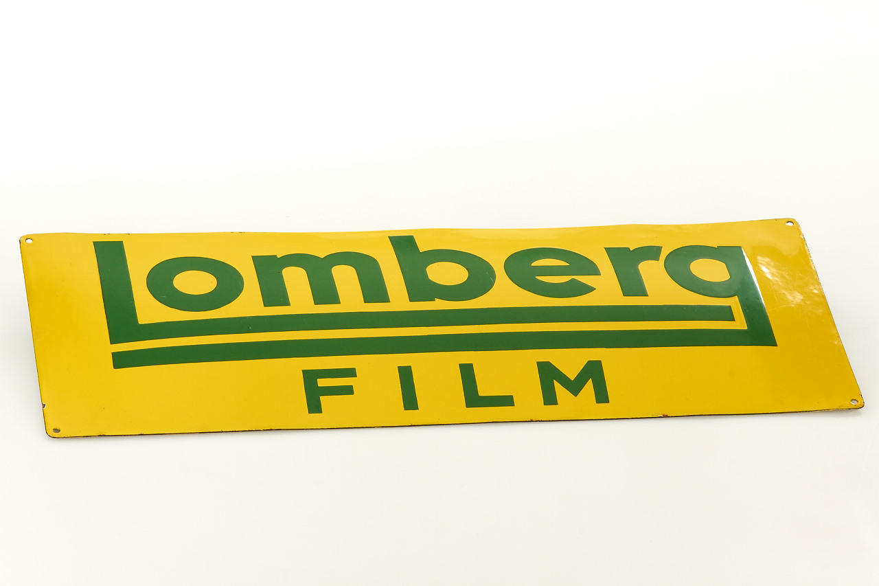 quite rare Lomberg enamel sign in very good condition (c.80x30cm), together with small Lomberg display sign (c.12x20cm) and original shipping box for Lomber photo material with a business letter from 1932