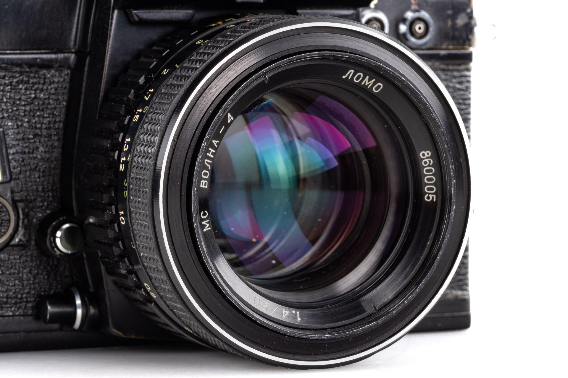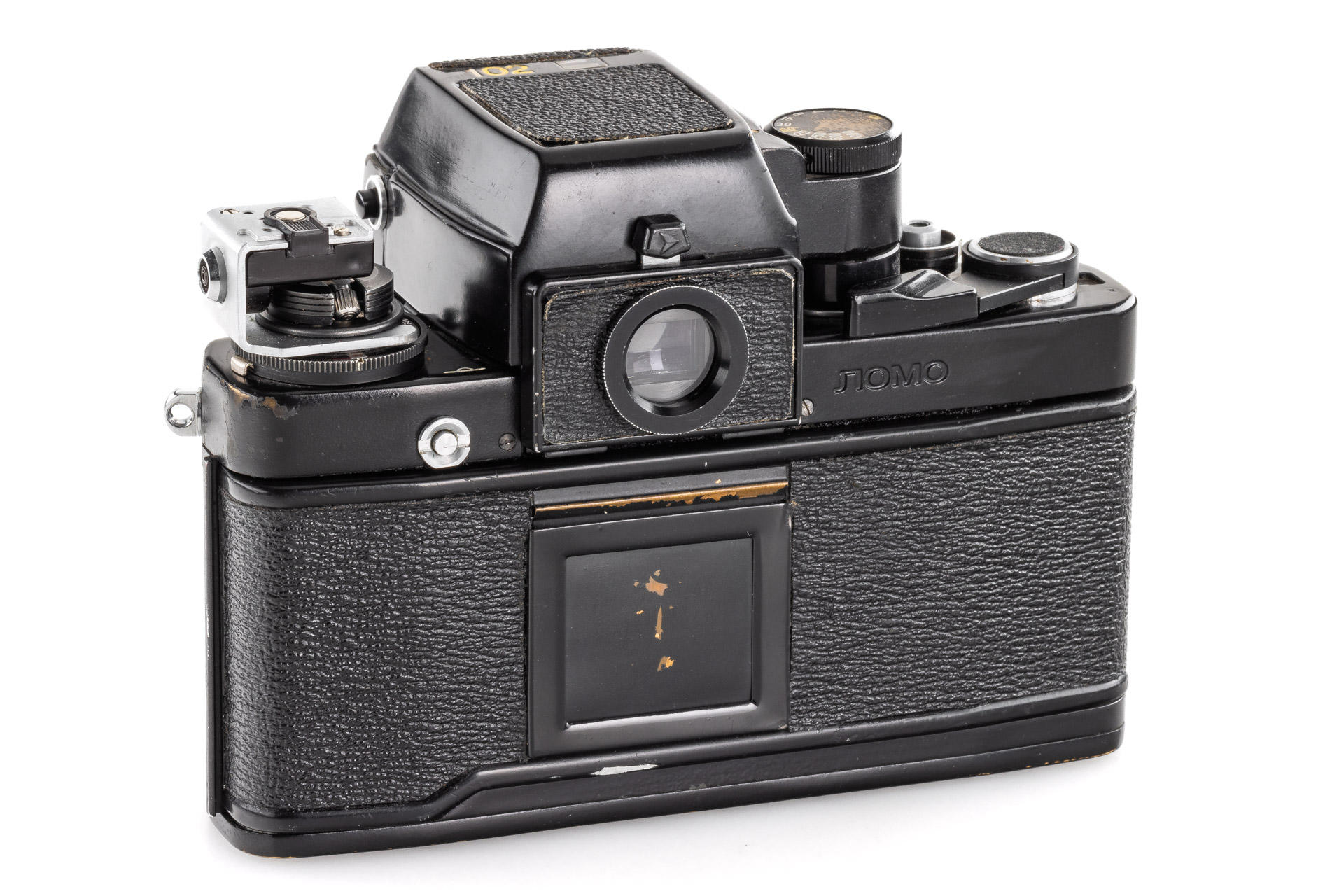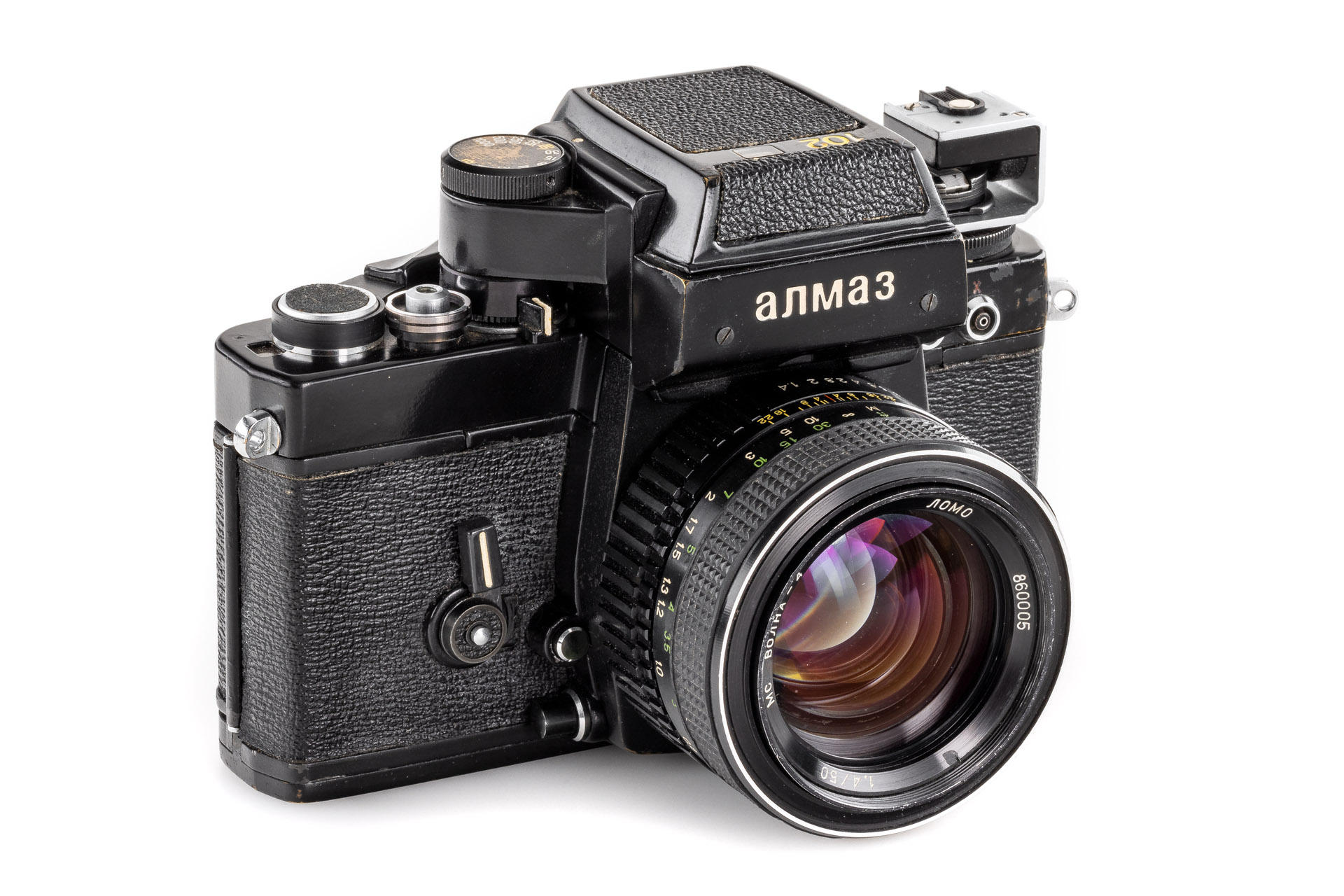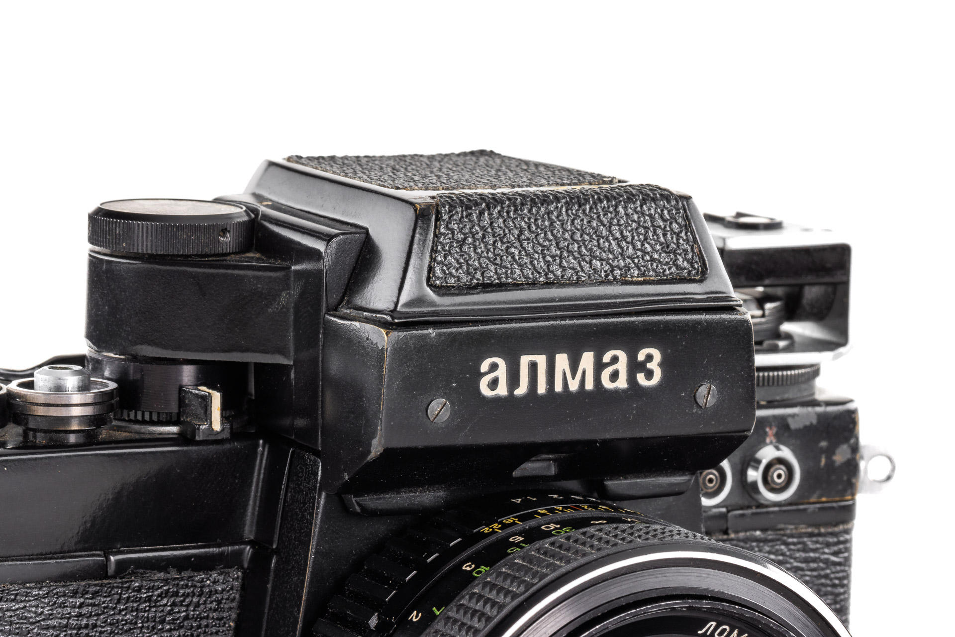 extremely rare Soviet SLR camera, with design inspired by Nikon F2, as well as Minolta X series cameras, Photomic style finder, Pentax K mount, with fast Lomo MC Volna-4 1.4/50mm no.860005 and a flash coupler, only a few Almaz 102 cameras were made, this one is the 9th example produced