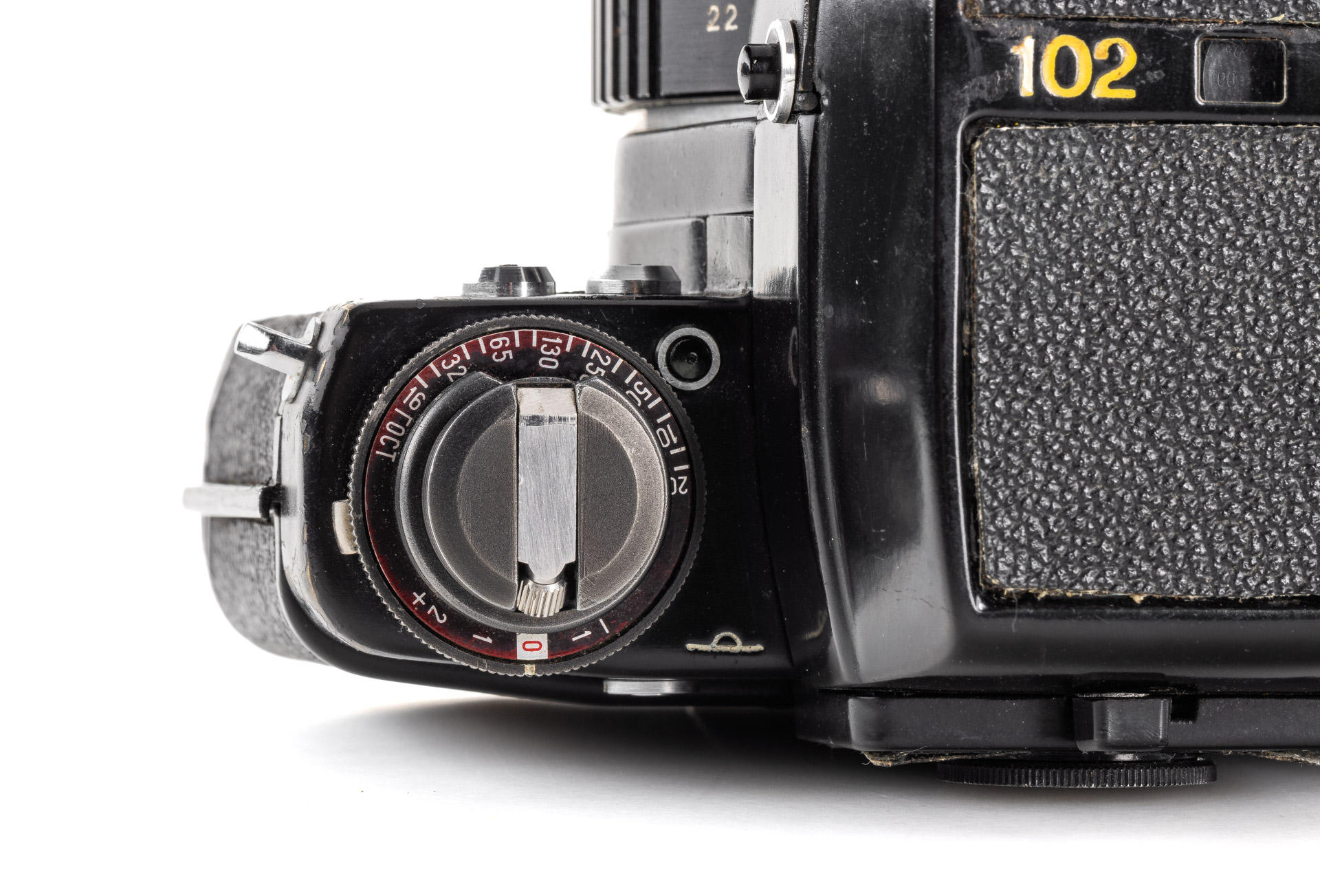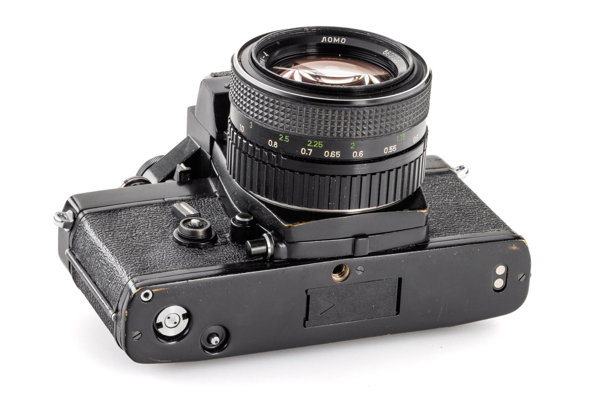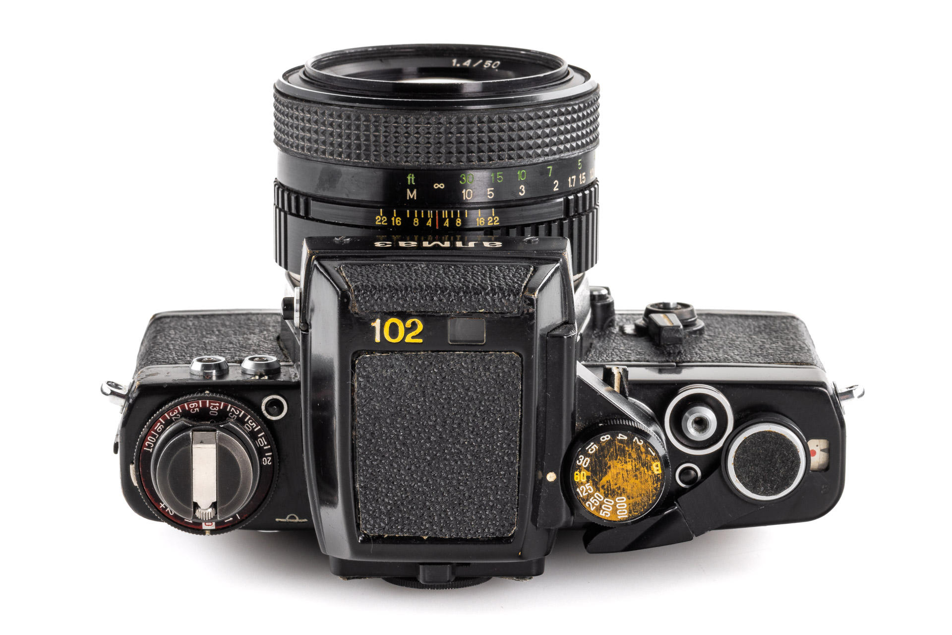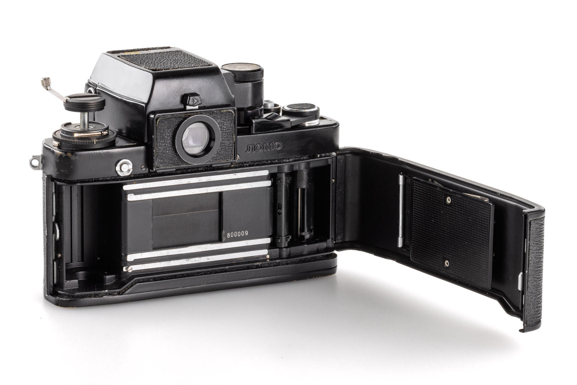 extremely rare Soviet SLR camera, with design inspired by Nikon F2, as well as Minolta X series cameras, Photomic style finder, Pentax K mount, with fast Lomo MC Volna-4 1.4/50mm no.860005 and a flash coupler, only a few Almaz 102 cameras were made, this one is the 9th example produced