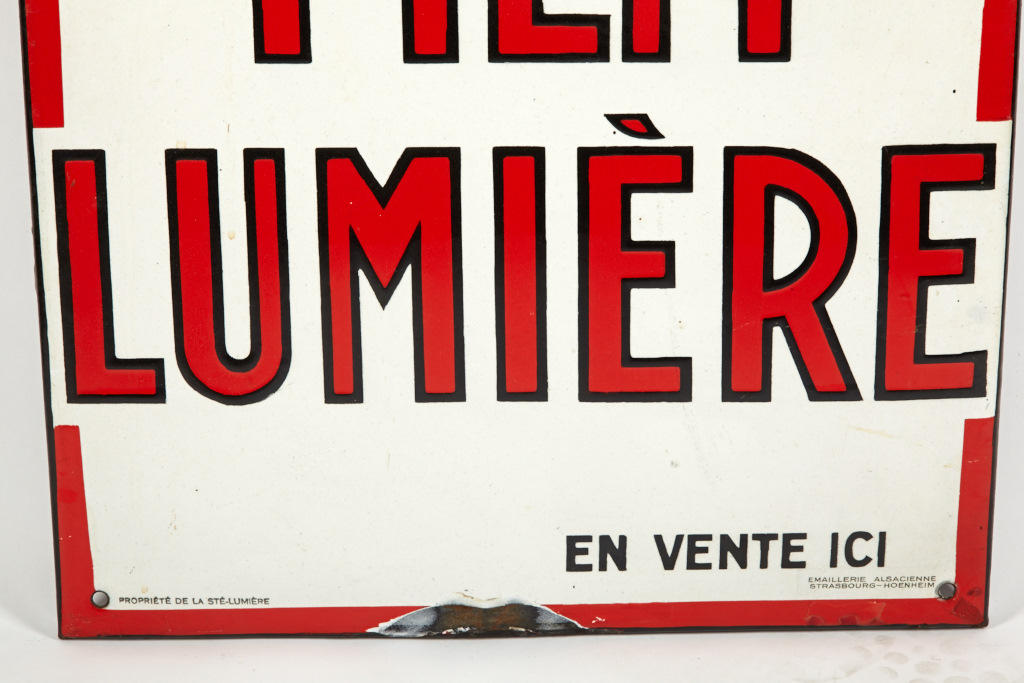 large French enamel sign in very fine original condition, 'FILM LUMIÈRE, EN VENTE ICI', 40x147cm