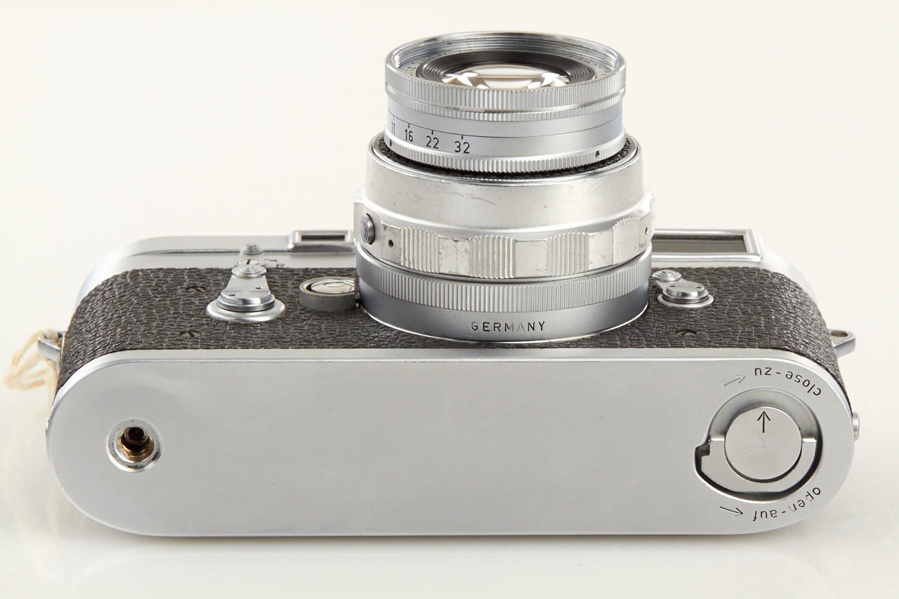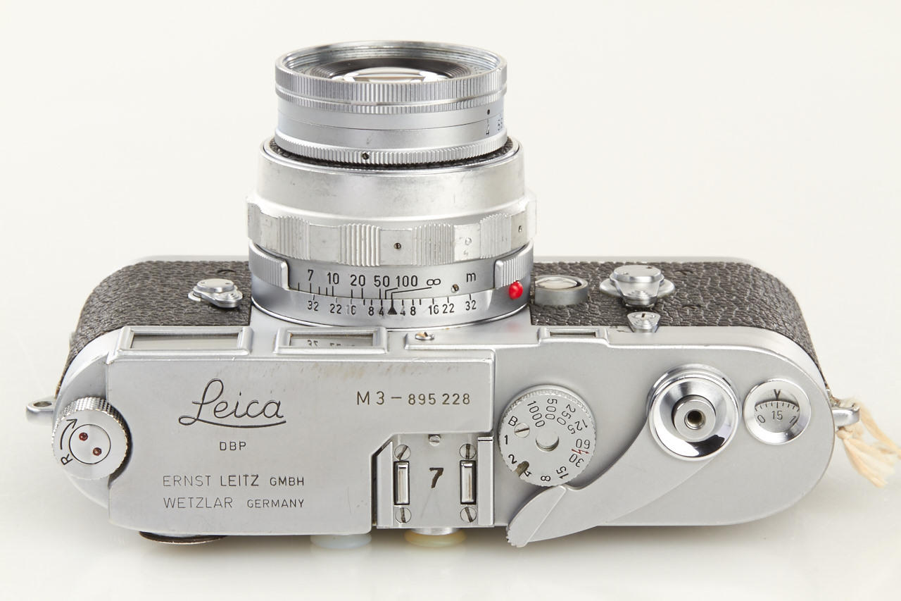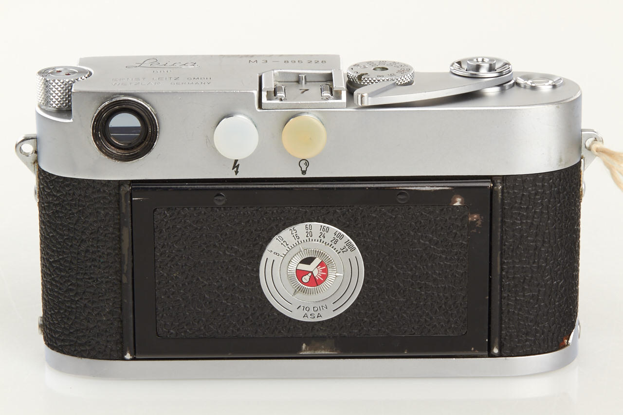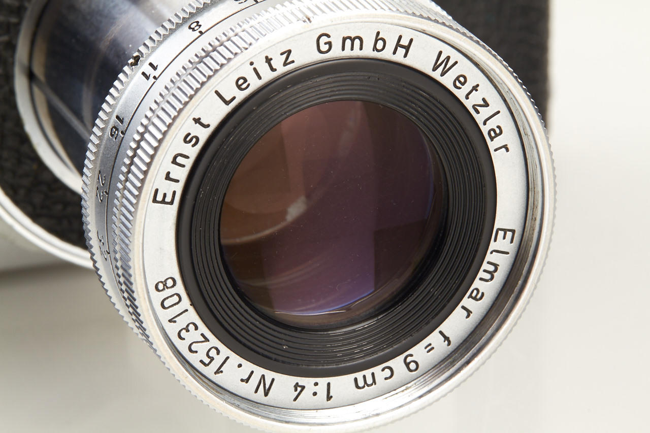 Original military camera used by the British Ministry of Defence, engraved '7' on the accessory shoe. There are only two reported cameras (no. 895225 and the offered camera no.895228) - see Dennis Laney 'Leica Collectors Guide' page 79. The camera is in used, good working condition with matching collapsible Elmar 4/9cm no.1523108 (hood, cap) and the military identification label.