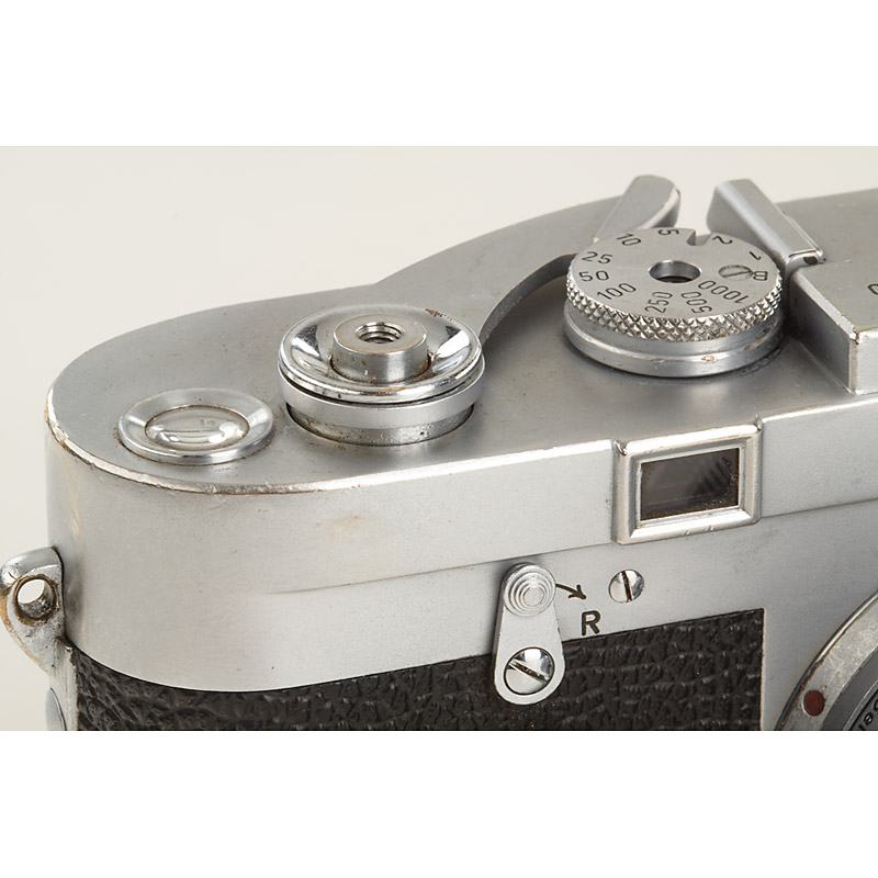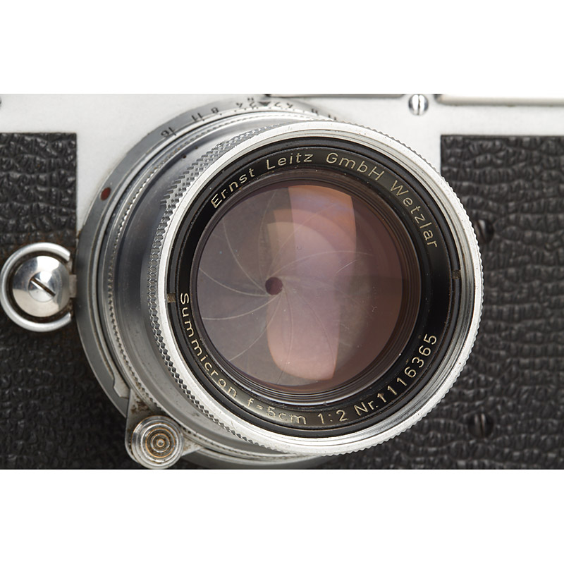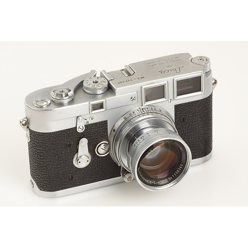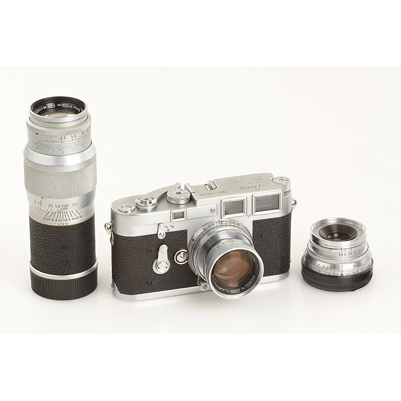 This Leica was owned and used by renowned photographer Inge Morath ! Outfit including Summicron 2/5cm no.1116365 (cap), Summaron 3.5/3.5cm no.1149145 (caps), Hektor 4.5/13.5cm no.1134238 (caps). Inge Morath bought this Leica in 1954 and gave it later to her brother Dr. Werner Mörath. It comes with a personal letter from Dr. Werner Mörath outlining the history of this outfit. It also includes a 17x25cm vintage print by Magnum photographer Dennis Stock, showing Inge Morath with her husband Arthur Miller on her wedding day in 1962. The print was a present from Inge Morath to her grand parents for their 70th wedding day. Please note that in our auction of photographs, running alongside this auction, a vintage print by Henri Cartier Bresson is on offer (lot 1099) showing Dr.Werner Mörath with the LIFE photographer Gion Mili.