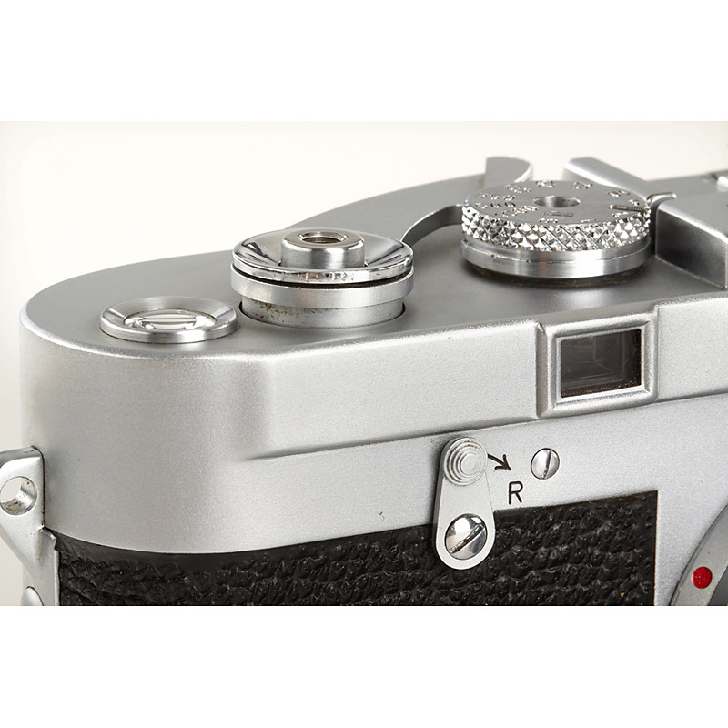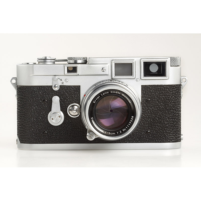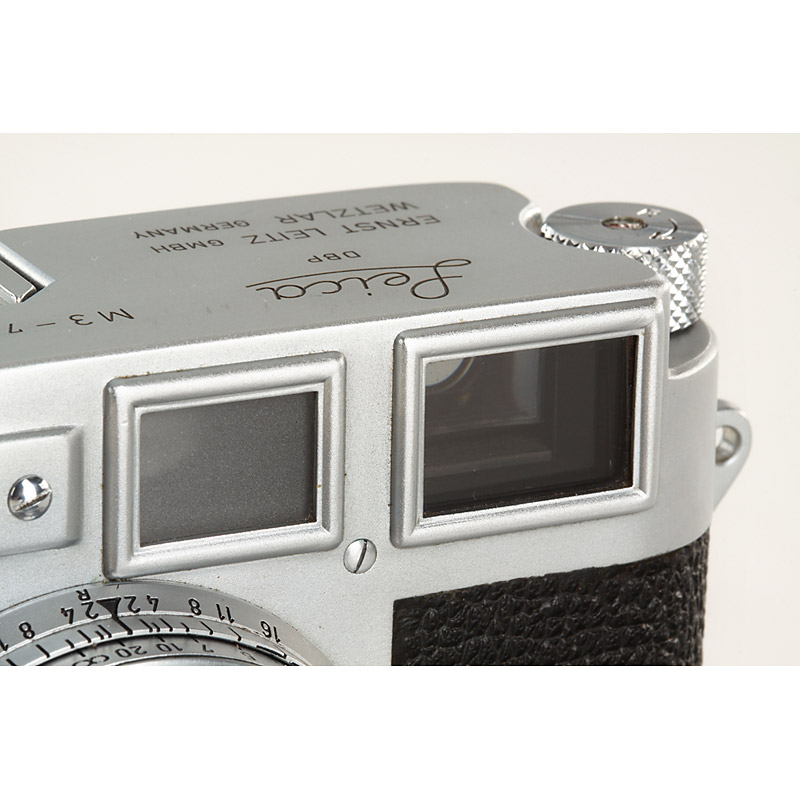 M3 from the first batch in beautiful (only a small depression on top plate) and 100% original, perfect working condition, rare version with corner on top plate, nice serial number (we sold no.700500 in our 19th auction), matching Summicron 2/5cm no.1117228, early M3 everready case