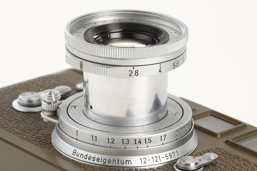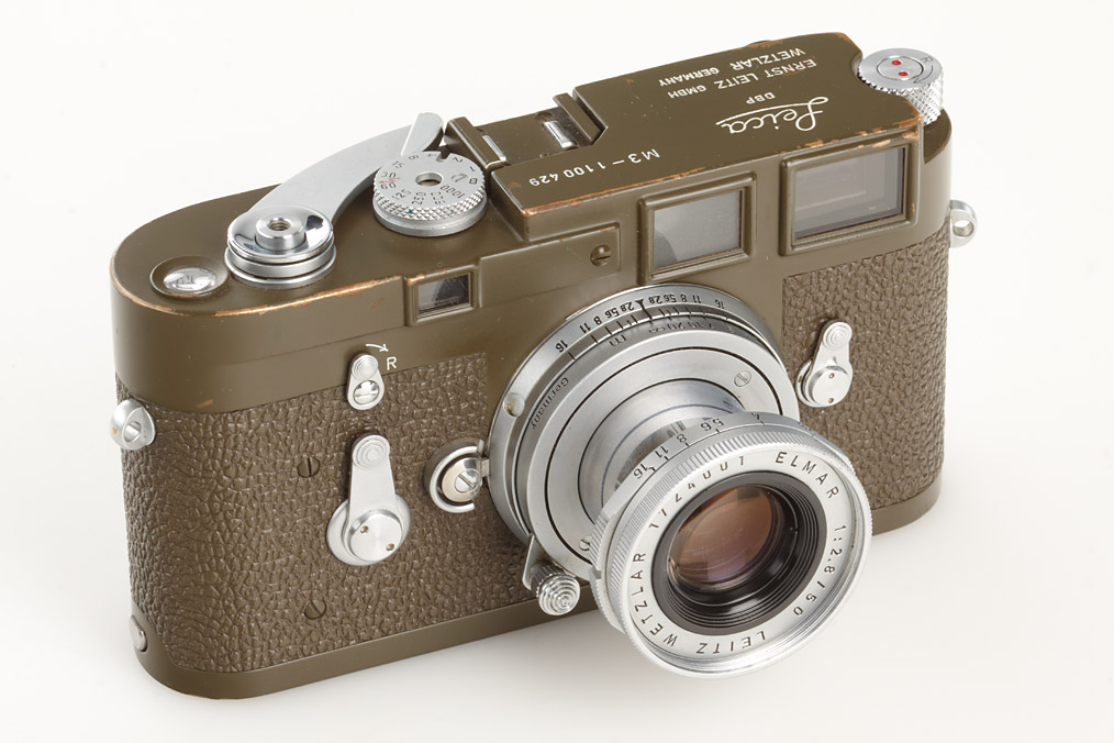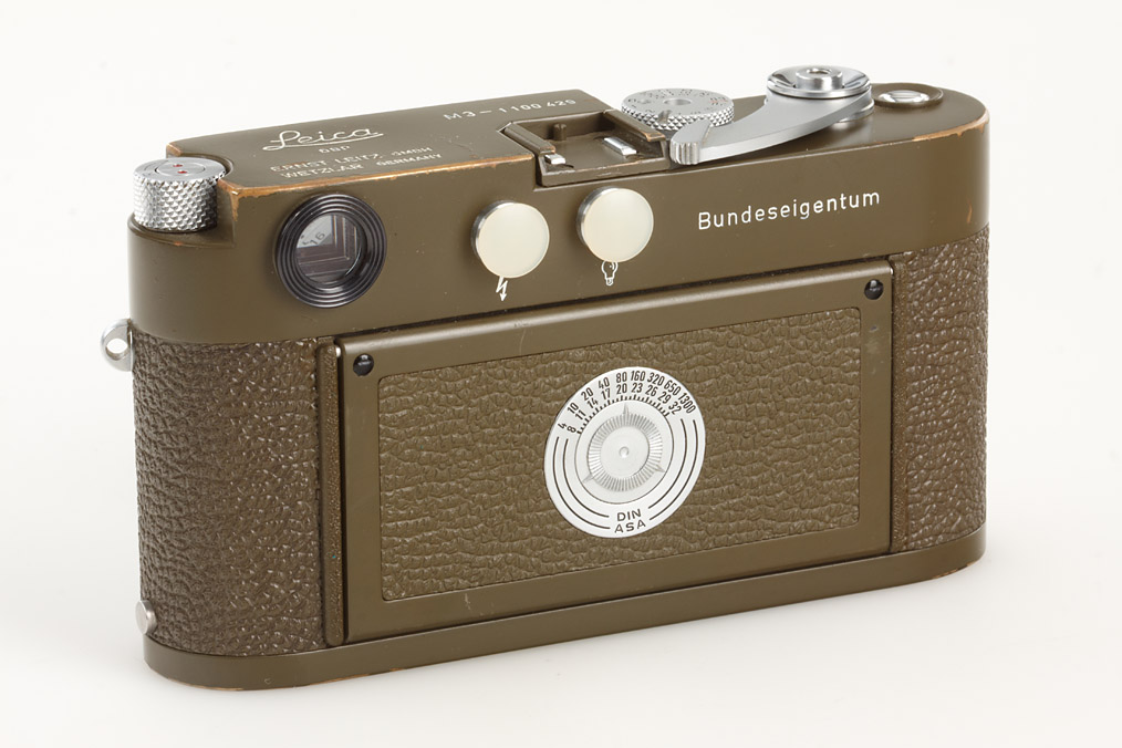 fully original olive M3 engraved 'Bundeseigentum ' on rear of top plate, Elmar 2.8/50mm no.1724001 engraved 'Bundeseigentum 12-121-5971, ITOOY hood engraved 'Bundeseigentum 12-121-5529, Hektor 4.5/135mm no.1718707 engraved 'Bundeseigentum 12-120-1625 (caps), Leica-Meter MC no.97278 engraved 'Bundeseigentum 12-121-5608' (olive case stamped 'Bundeseigentum 12-121-5710), Booster in olive case, olive outfit case stamped 'Bundeseigentum 12-130-0935, all in very fine and perfect working condition