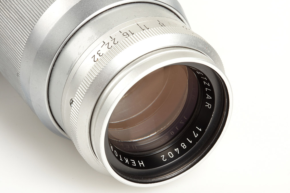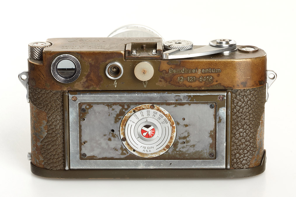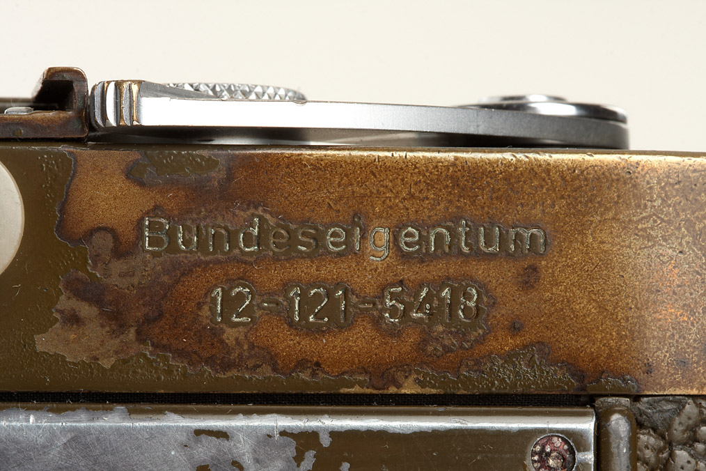 original early type M3 green in heavy used condition, Bundeseigentum 12-121-5418 engraved on back of top plate, Hektor 4.5/13.5cm no.1718402 (cond.B/C), engraved Bundeseigentum 12-120-1625, cap
