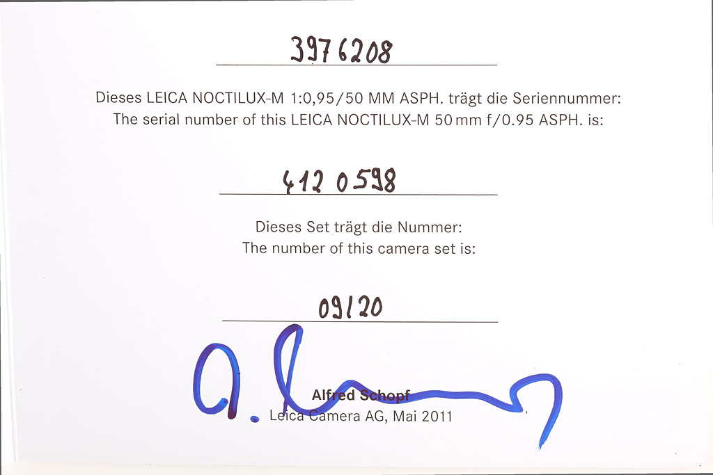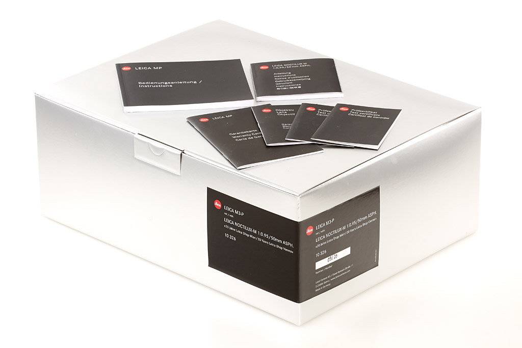 Special Edition of the analog M3-P (edition number 9) in celebration of the 20th Anniversary of the Leica Shop in Vienna. In silver chrome finish with vulcanite cladding and top cover in the typical Leica M3 style. Furthermore, the top cover is engraved with the “Classic Leica Script” and the serial number of the camera. Each camera has a Special Edition number on the hot shoe. The camera comes with the Leica Noctilux-M 50mm f/0.95 ASPH. lens in silver anodized finish. This is no.09 of the edition of 20 units only, complete and unused with all boxes, certificate, papers.