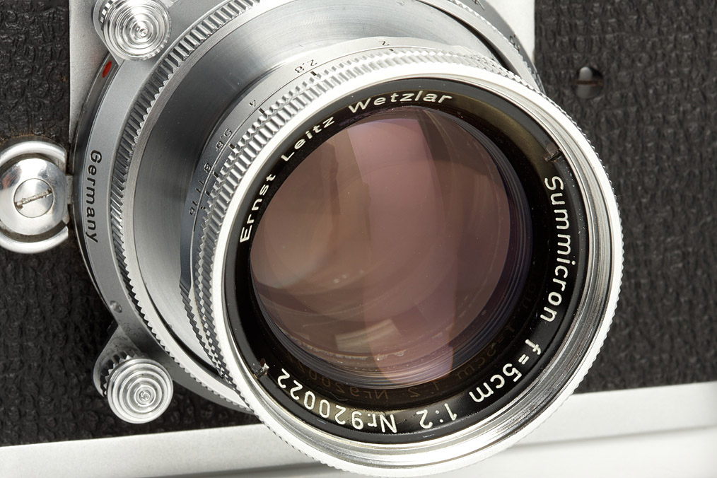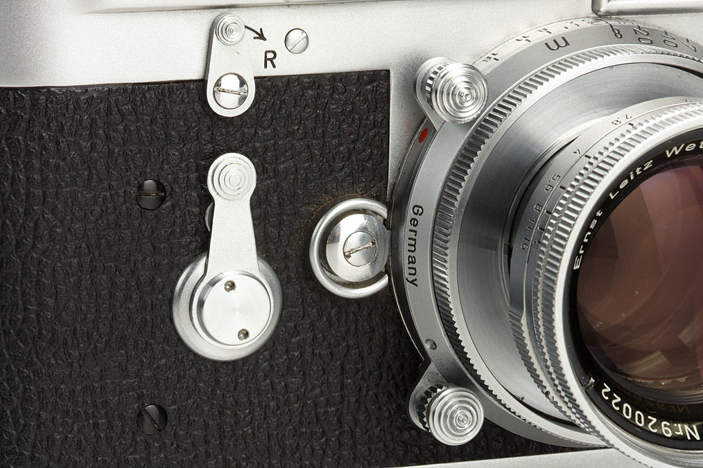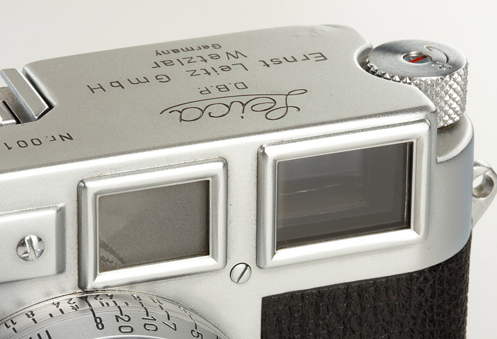 extremely rare M3 prototype (pre-series), 65 of these were produced as test cameras in 1952/53 - very few have survived. The camera is in beautiful and perfect working condition and all details are original including film advance lever, external frame counter, early speed dial, shape of selftimer, reversed direction rewind knob, backdoor with film marker punch and ceramic pressure plate. The cameras nos. 005, 0041, 0043 and 0056 are illustrated in Lager vol.I, p.173-175. It comes with dual-lever prototype Summicron 2/5cm no.920022 in perfect condition. Rare opportunity to acquire one of the most important cameras in Leica's history.