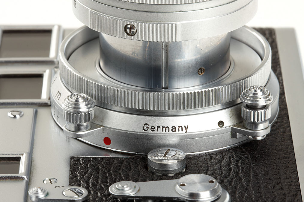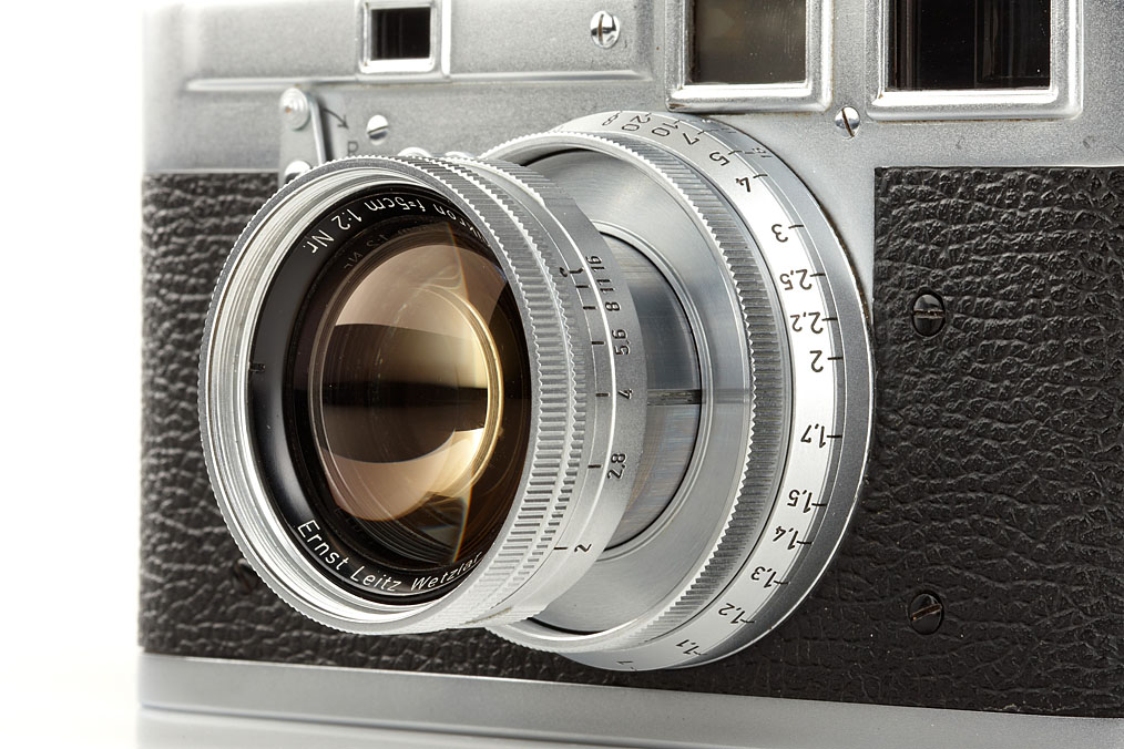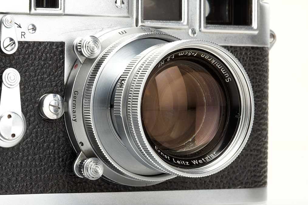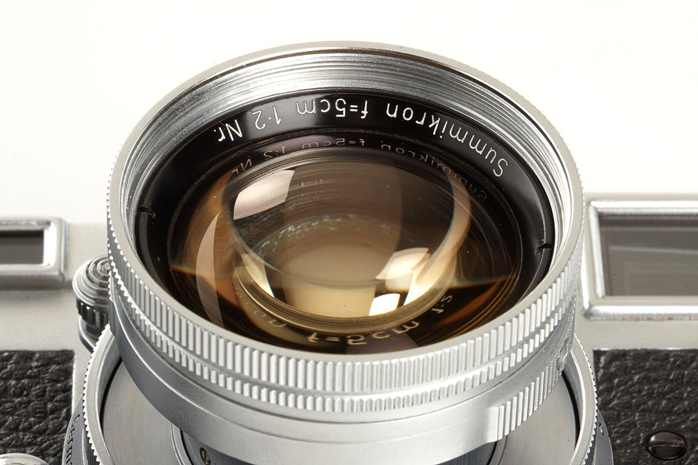 The camera is an M3 pre-model, earlier than all "00XX"-series cameras from 1952 known to exist. It has no serial-number. The die-cast shutter crate is different to the other "00XX"-series cameras, the cover-plate of the shutter crate bottom side has no engravings, the body shell is not painted, but just anodized, the shutter-lock has engraved an index as a dot in the knurl of the release-knob and two symbols for "T" and exposure "." on the top plate, the ocular ring is made of bakelite, also the engraving for flash is different, the camera has a higher lustre chrome finish, almost like the cameras of the sharkskin period, all engravings are finer and slimmer. "001" written in pencil on the inside of the rear door, which indicates being really camera no. 001, produced before no.005, the - so far - earliest camera of the "00XX"-series known. The self timer lever looks very similar to those of the M3 700XXX series. If has been checked by Ottmar Michaely and he states, that the lever mounted on this camera in fact is a pre-model. The lens is a prototype dual-lever Summikron. The engraving is similar in style and size with the Summitar* engravings, different to the later Summicron lenses of the 9200XX series. Summikron written with "k" instead of "c" was the very first name of this new lens, referring to "Kronglas", the Lanthanium crown-glass, invented by Leitz. It is one of only two "Summikron" lenses known to exist. The second specimen is published in van Hasbroeck, plates XXVI and 141b. Like the offered camera also the lens is engraved "Nr. " without serial-number. In fact lens and body are a perfect matching pair, both of same vintage (1951), produced before the famous "00XX"-series M3 cameras known to exist. The camera is in perfect working condition and all details are original with all pre-series details including film advance lever, external frame counter, early speed dial, reversed direction rewind knob, back door with film marker punch and ceramic pressure plat