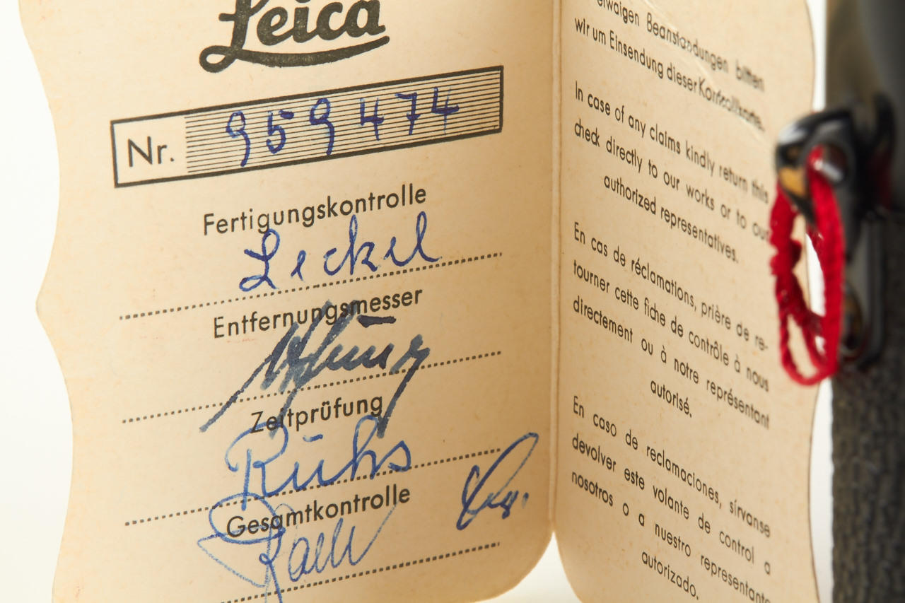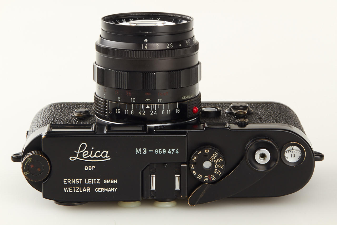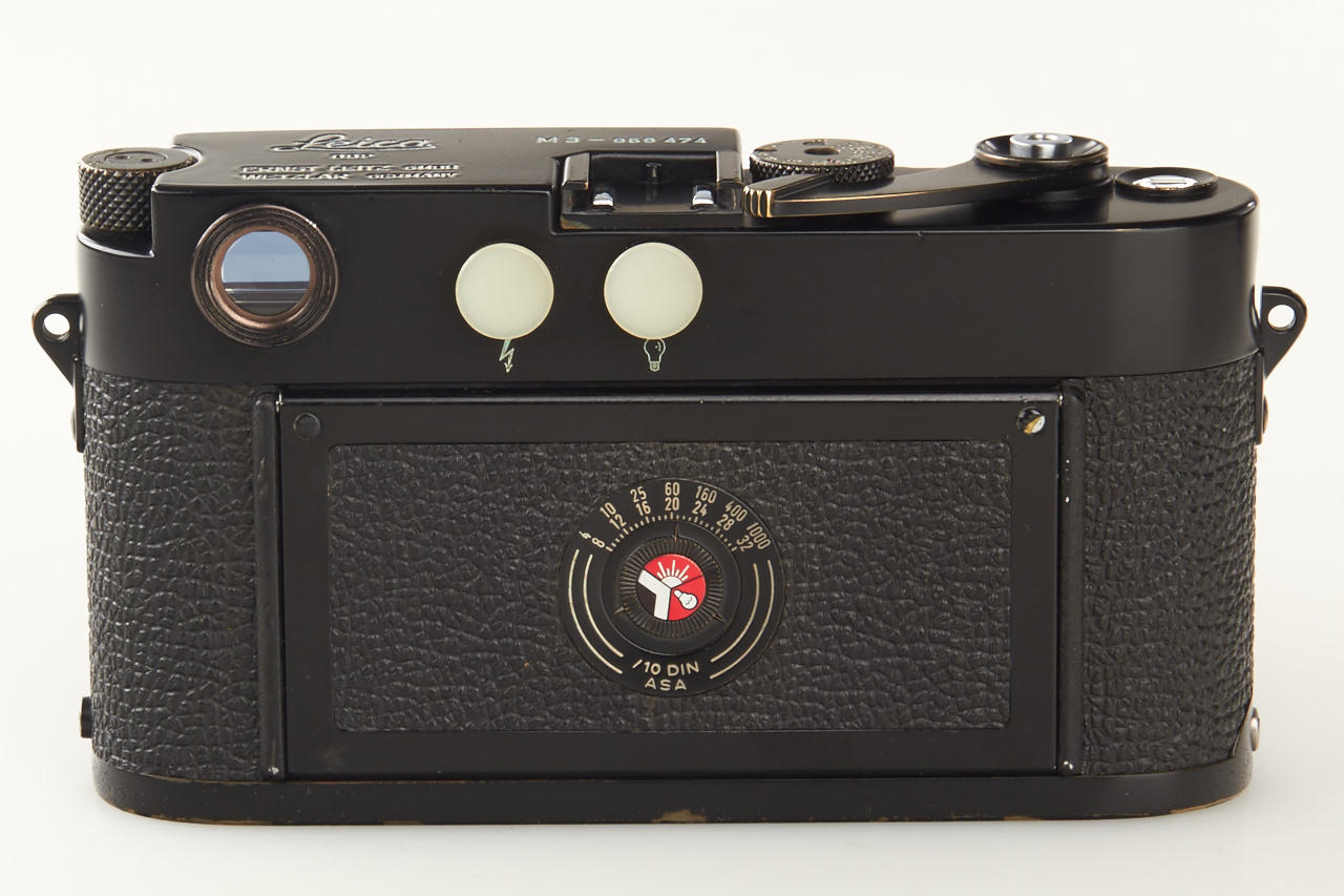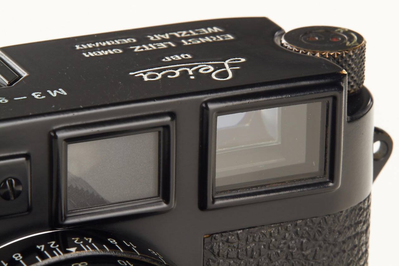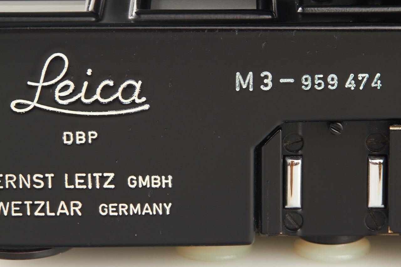 Very early and fully original body in beautiful and 100% original condition from the first official batch (959401-959500) in perfect working order with matching black paint Summilux 1.4/50mm no.1703844 (B/A condition, perfect clean optics, cap), the body with early strap lugs, all-black base plate with black locking bar, gold/red inspections card with matching body number, original maker's box with matching serial number! This early version of the Leica M3 is finished in satin matte black paint. While the total production of the Leica M3 reached almost a quarter of a million units, only 1,410 cameras were originally prepared in black paint finish. The lacquer was by far not as resistant as chrome plating. Thus well-preserved examples in fine original condition are very difficult to find, with a matching Summilux and the original maker's box almost impossible!