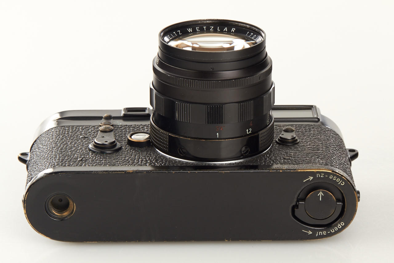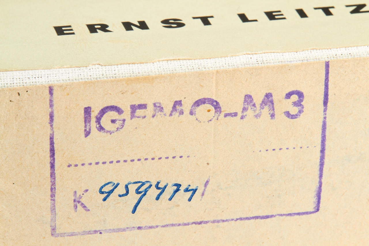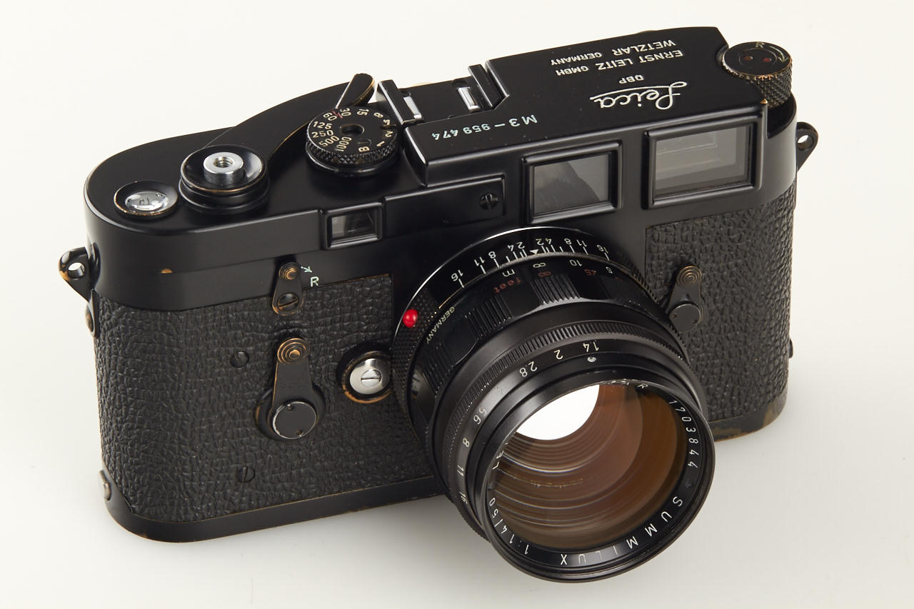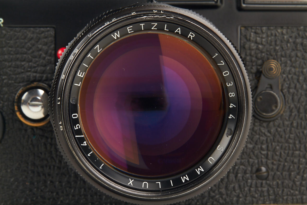 Very early and fully original body in beautiful and 100% original condition from the first official batch (959401-959500) in perfect working order with matching black paint Summilux 1.4/50mm no.1703844 (B/A condition, perfect clean optics, cap), the body with early strap lugs, all-black base plate with black locking bar, gold/red inspections card with matching body number, original maker's box with matching serial number! This early version of the Leica M3 is finished in satin matte black paint. While the total production of the Leica M3 reached almost a quarter of a million units, only 1,410 cameras were originally prepared in black paint finish. The lacquer was by far not as resistant as chrome plating. Thus well-preserved examples in fine original condition are very difficult to find, with a matching Summilux and the original maker's box almost impossible!
