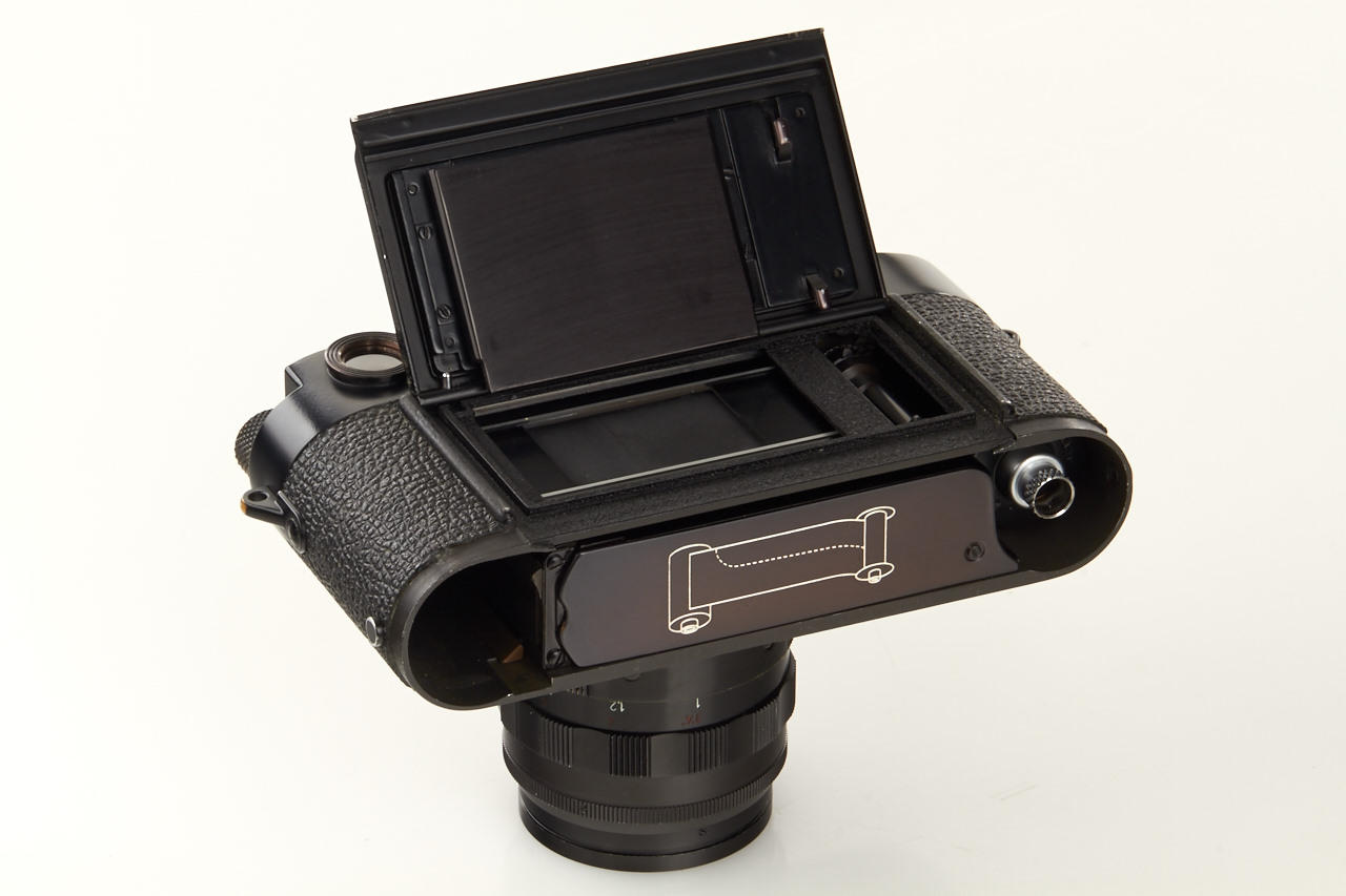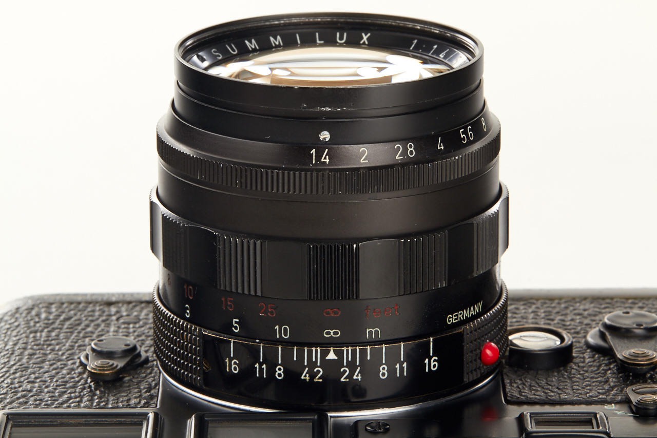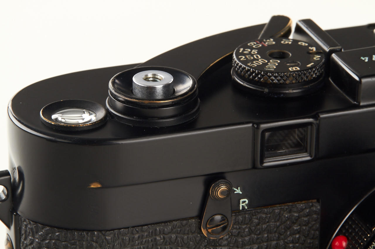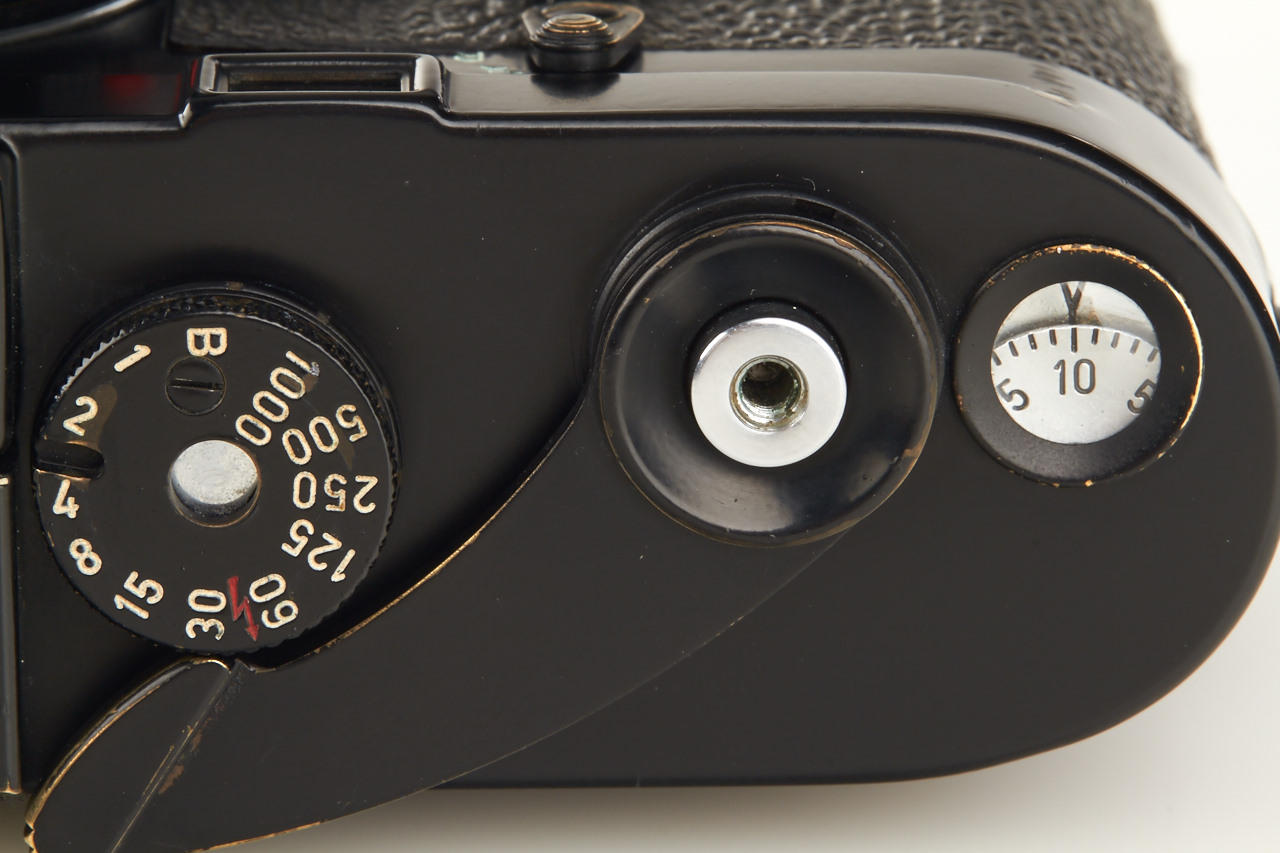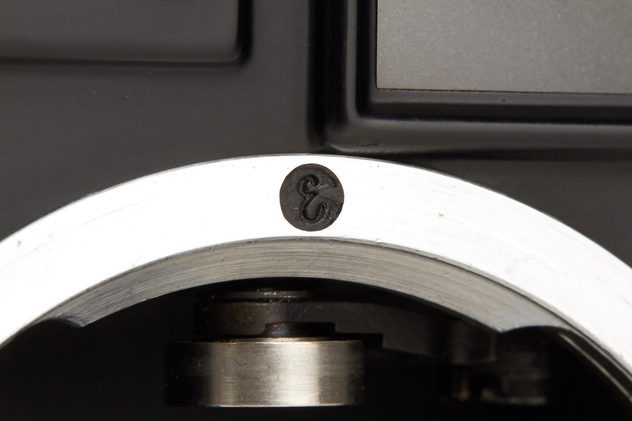 Very early and fully original body in beautiful and 100% original condition from the first official batch (959401-959500) in perfect working order with matching black paint Summilux 1.4/50mm no.1703844 (B/A condition, perfect clean optics, cap), the body with early strap lugs, all-black base plate with black locking bar, gold/red inspections card with matching body number, original maker's box with matching serial number! This early version of the Leica M3 is finished in satin matte black paint. While the total production of the Leica M3 reached almost a quarter of a million units, only 1,410 cameras were originally prepared in black paint finish. The lacquer was by far not as resistant as chrome plating. Thus well-preserved examples in fine original condition are very difficult to find, with a matching Summilux and the original maker's box almost impossible!