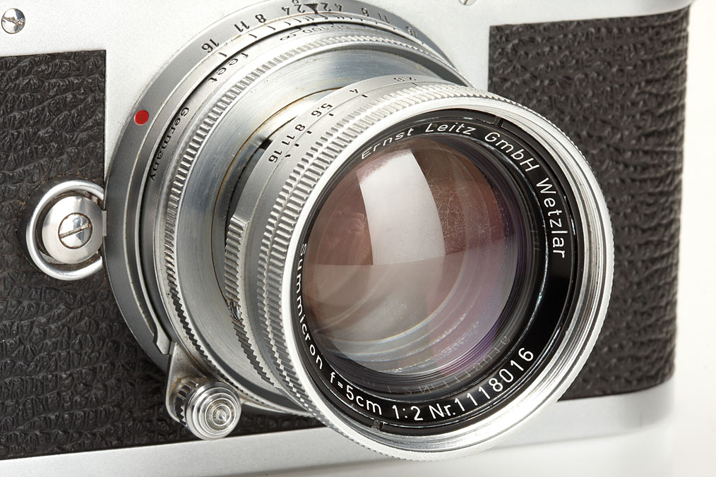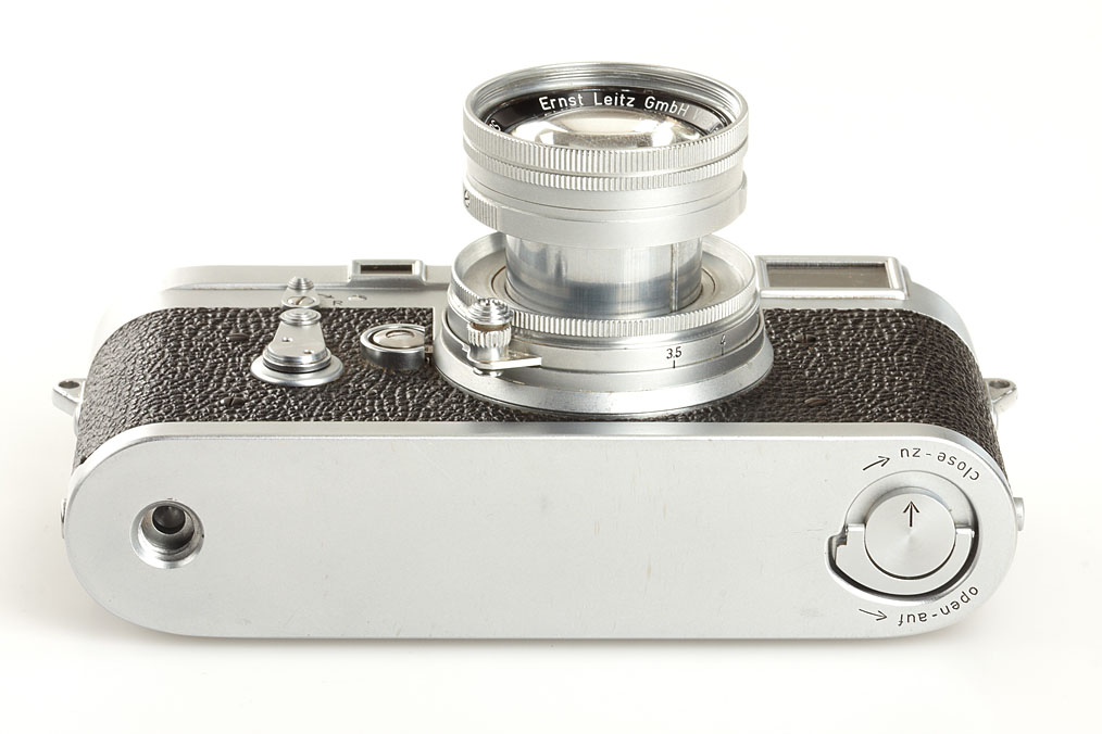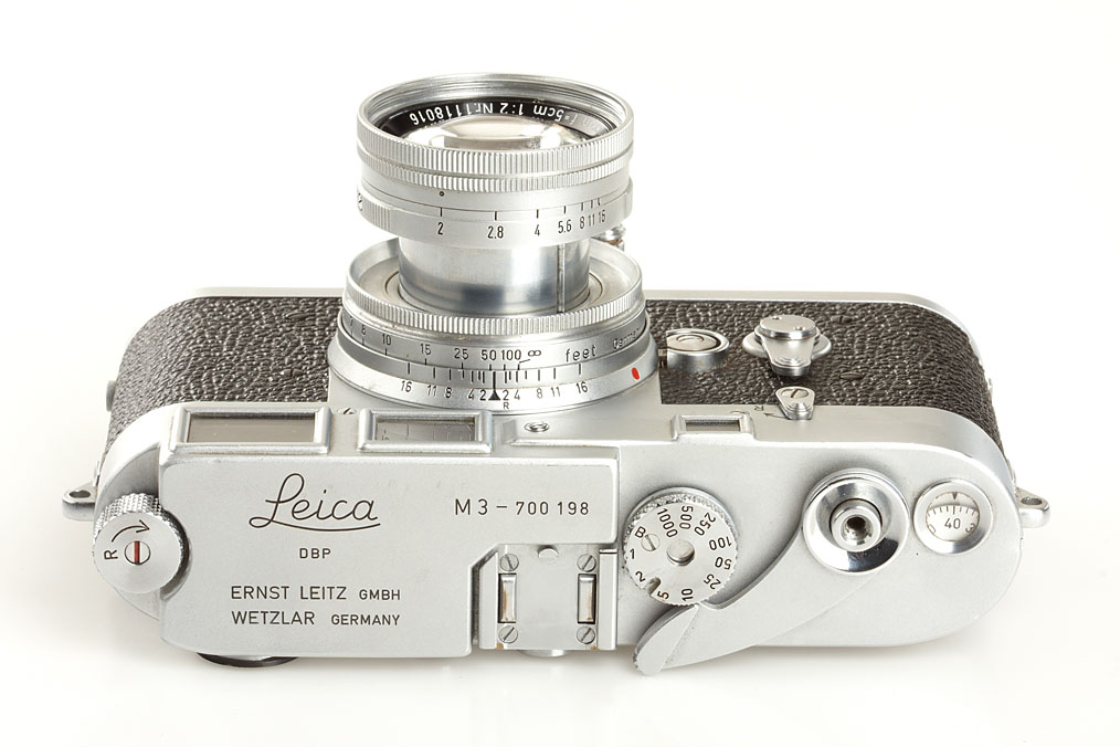 very early M3 from the first production batch (700001-700200), in perfect working condition, all details are original including film advance lever, rewind knob, rewind lever, backdoor with ceramic pressure plate and 200 ASA, early speed dial, with matching early collapsible Summicron 2/5cm no.1118016 (scratches and cleaning marks on front lens)