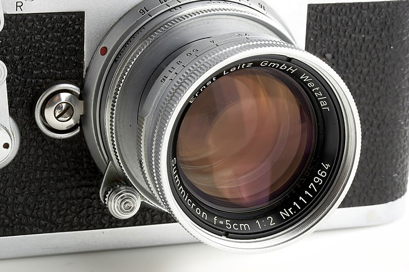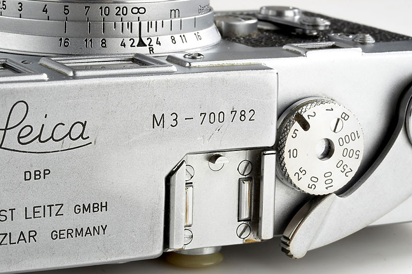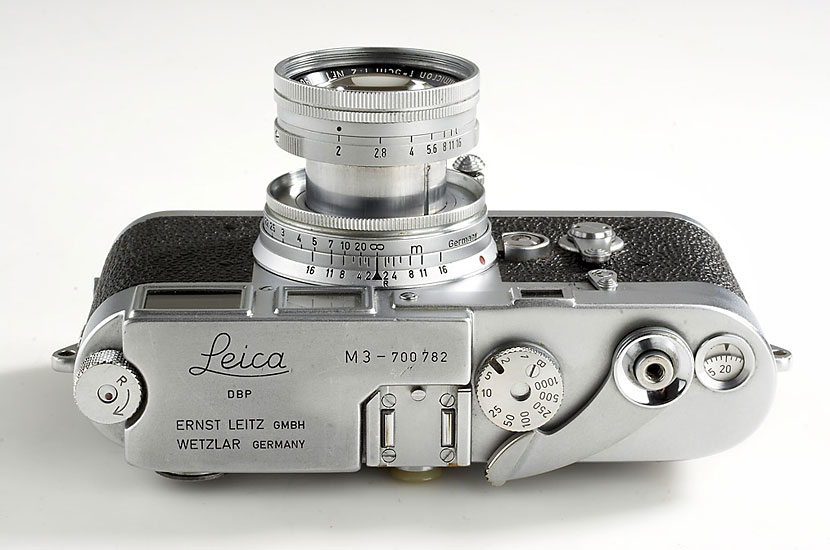 very early camera in absolutely original condition, with all features of early M3 cameras (without corner), clean finder, shutter works, with matching early collapsible Summicron 2/5cm no.1117964, cap