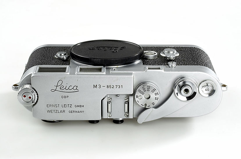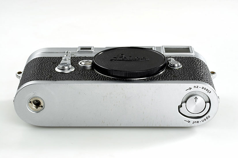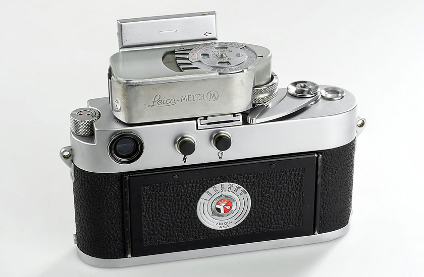perfect working double-stroke body from the last batch of 1956, later top plate with both flash sync., base plate cond. C, working Leicameter M no.2108(cond.C)